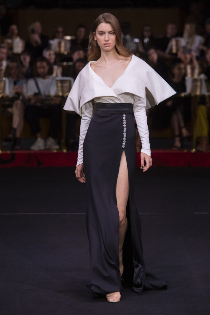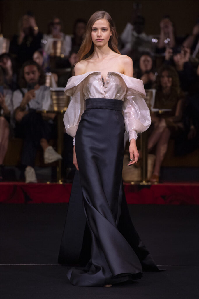 La collection déploie une série de robes et de tenues qui incarnent la quintessence de la séduction. Parmi les pièces maîtresses, une robe bustier en organza pailleté blanc, accompagnée d’une longue jupe en satin noir, illustre à la perfection cette dualité entre innocence et sensualité. Les chemisiers en soie faille aux manches gaines, accompagnés de jupes fourreau fendues, renforcent cette allure sophistiquée et irrésistible.