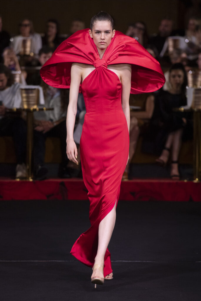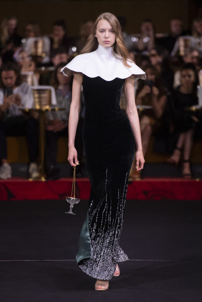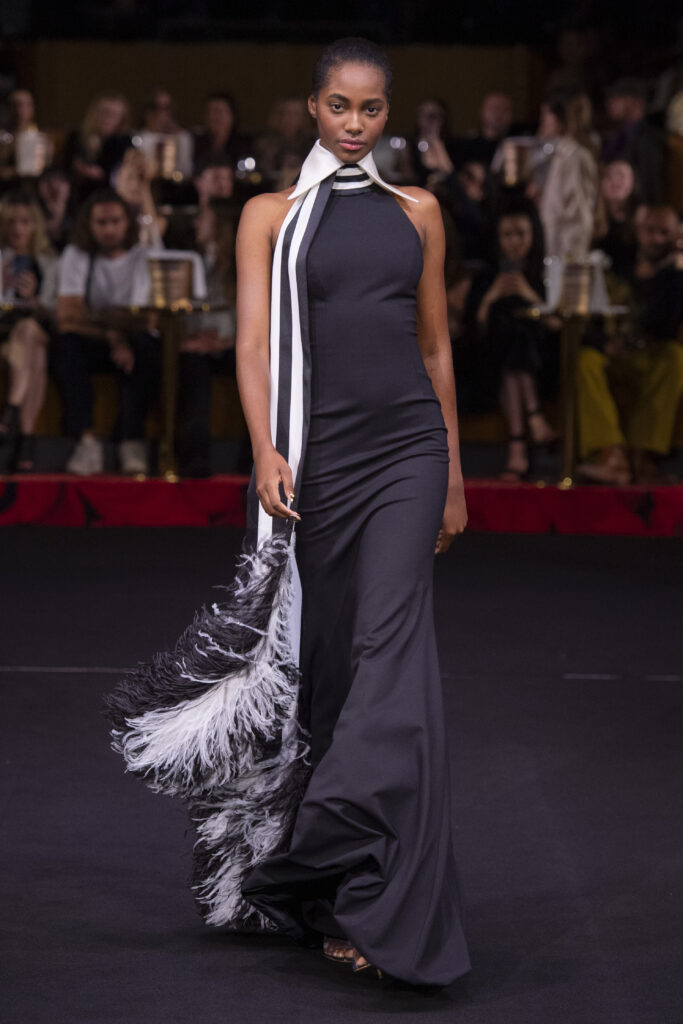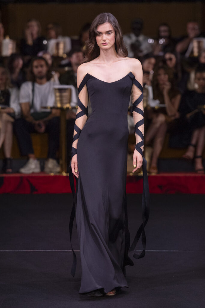 Alexis Mabille n’hésite pas à revisiter les classiques, comme le smoking, qu’il réinterprète en robe décolletée en laine froide à rayures ottoman. Les détails, tels que les boutons-bijoux ou les colliers-boléro en perles de cristal, ajoutent une touche d’extravagance tout en restant profondément ancrés dans l’élégance.