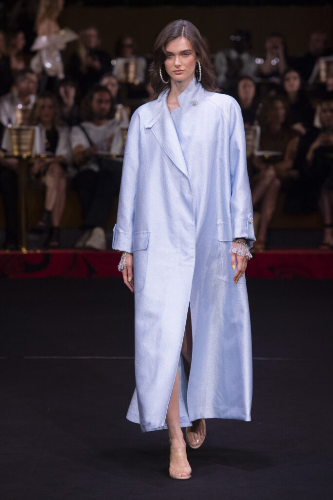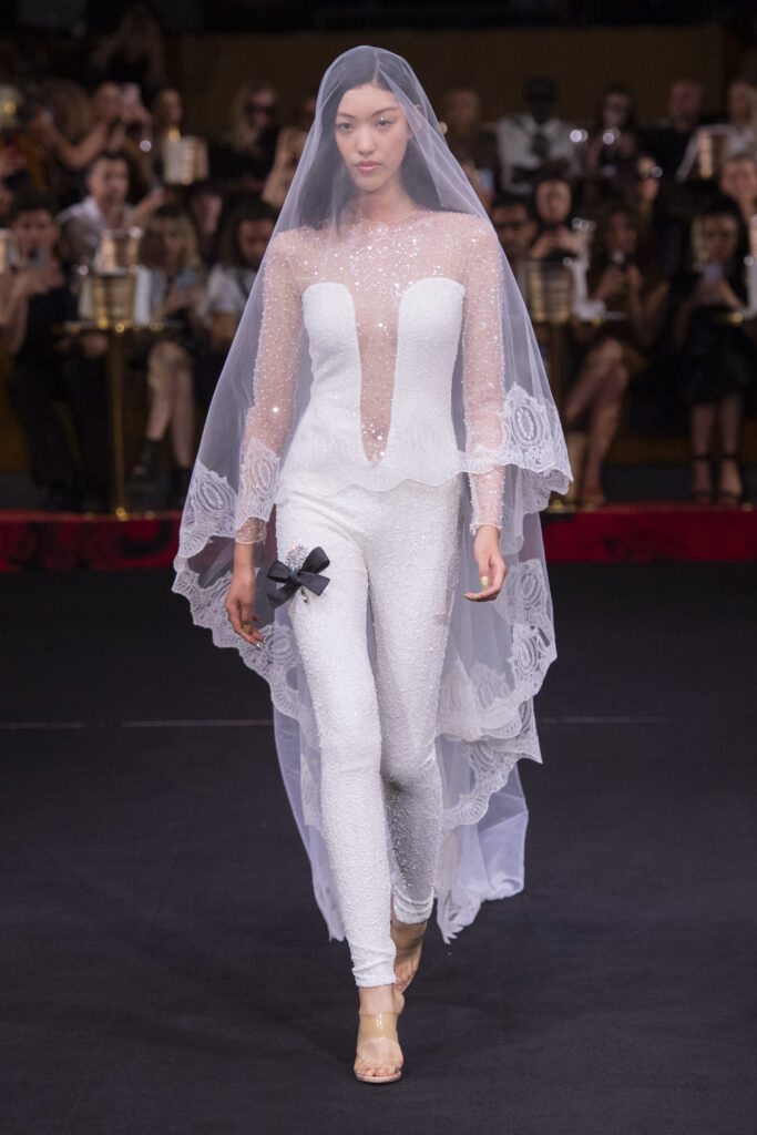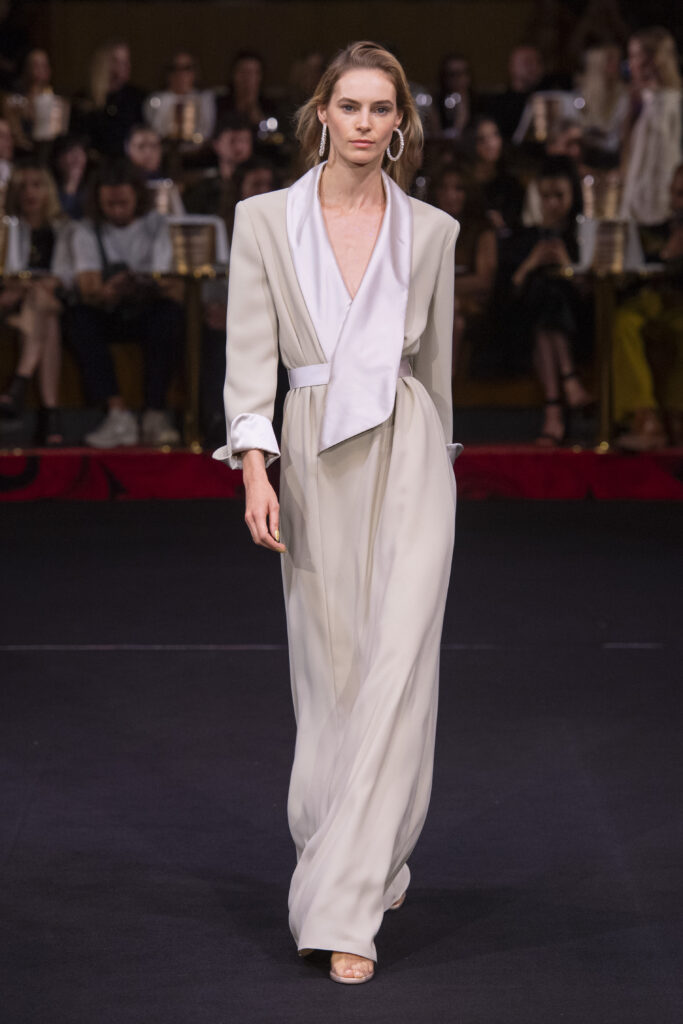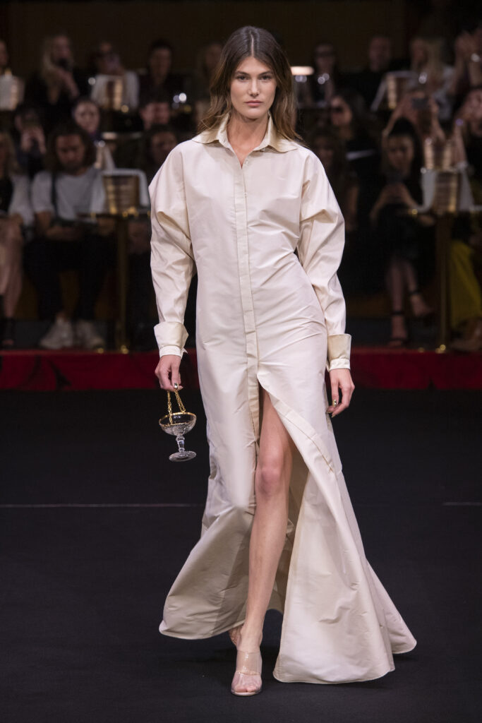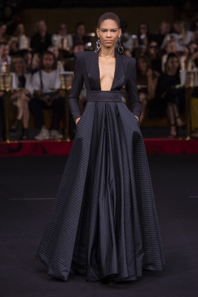 Alexis Mabille n’hésite pas à revisiter les classiques, comme le smoking, qu’il réinterprète en robe décolletée en laine froide à rayures ottoman. Les détails, tels que les boutons-bijoux ou les colliers-boléro en perles de cristal, ajoutent une touche d’extravagance tout en restant profondément ancrés dans l’élégance.