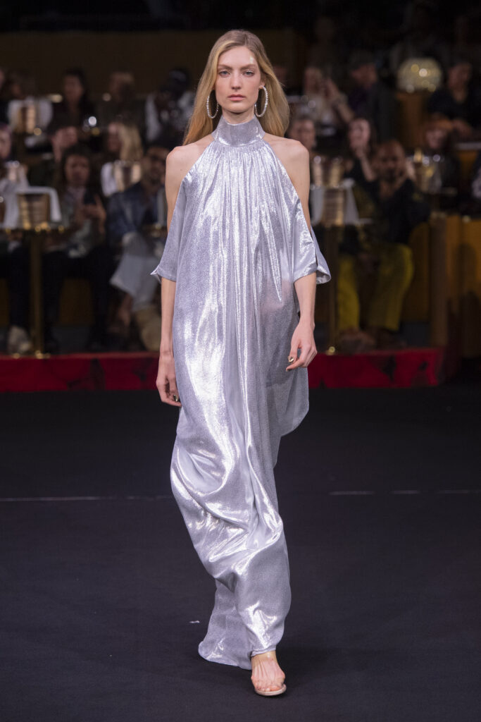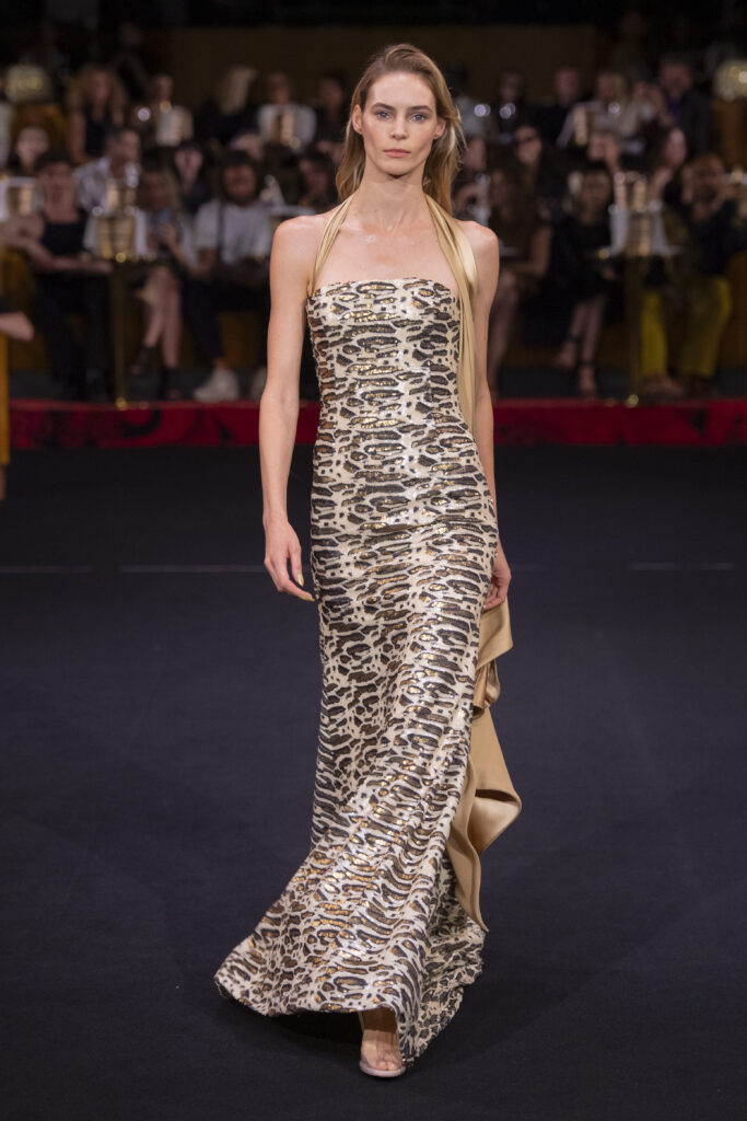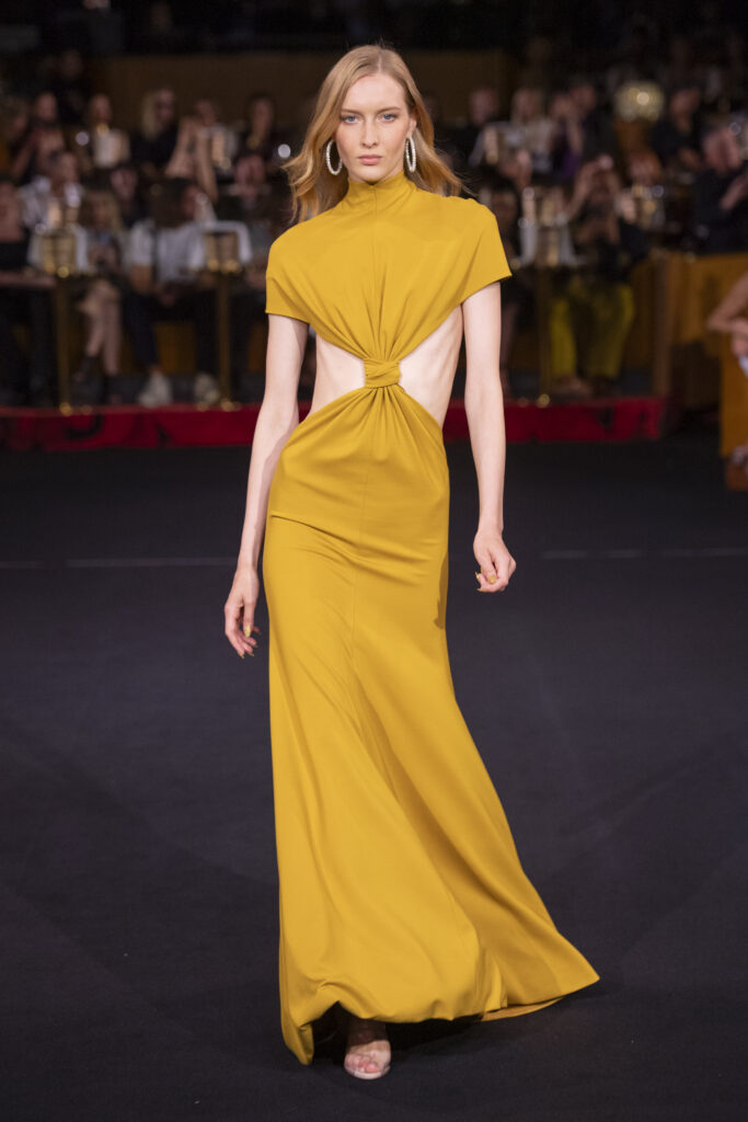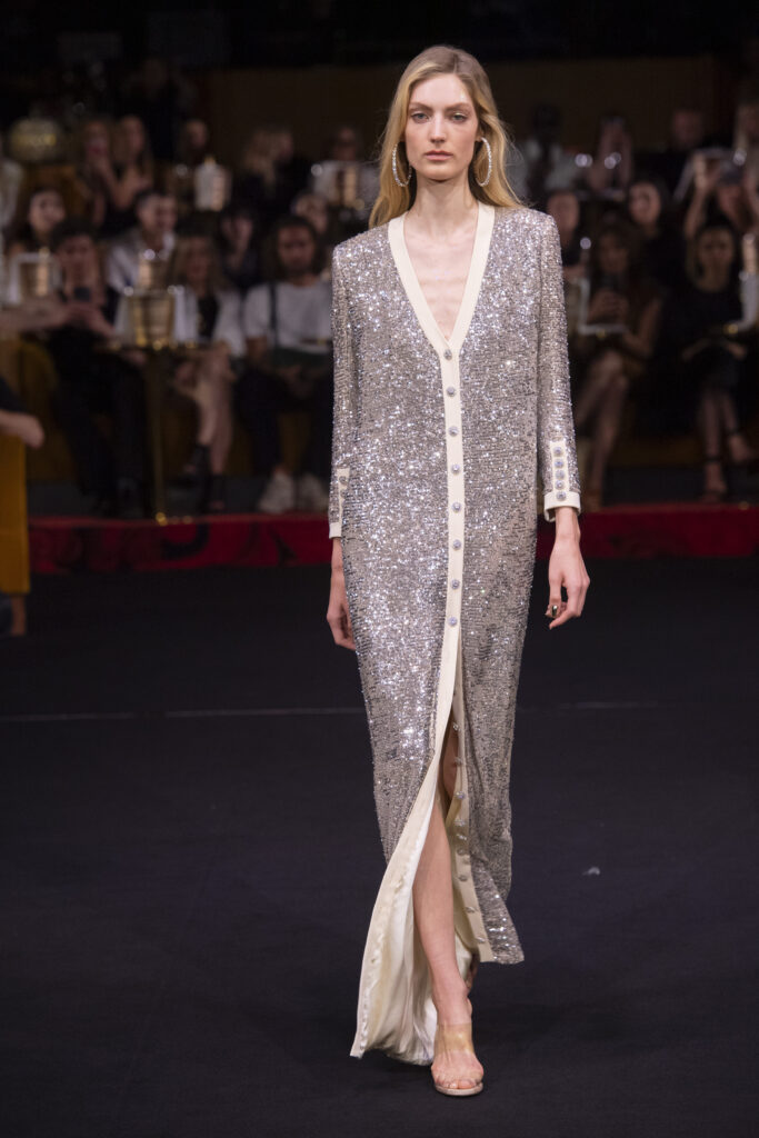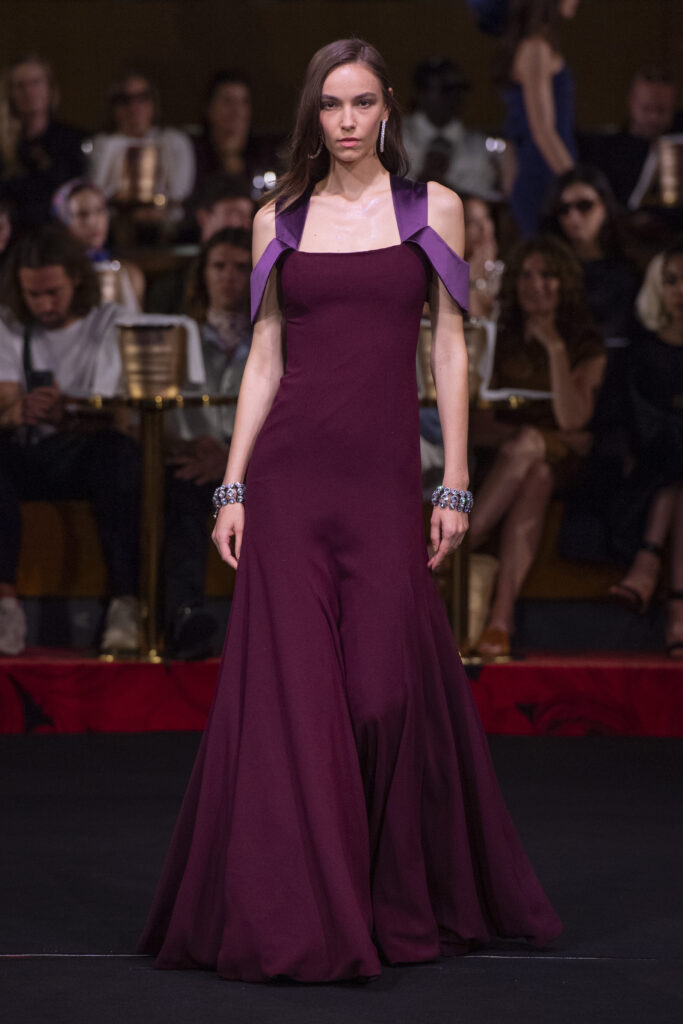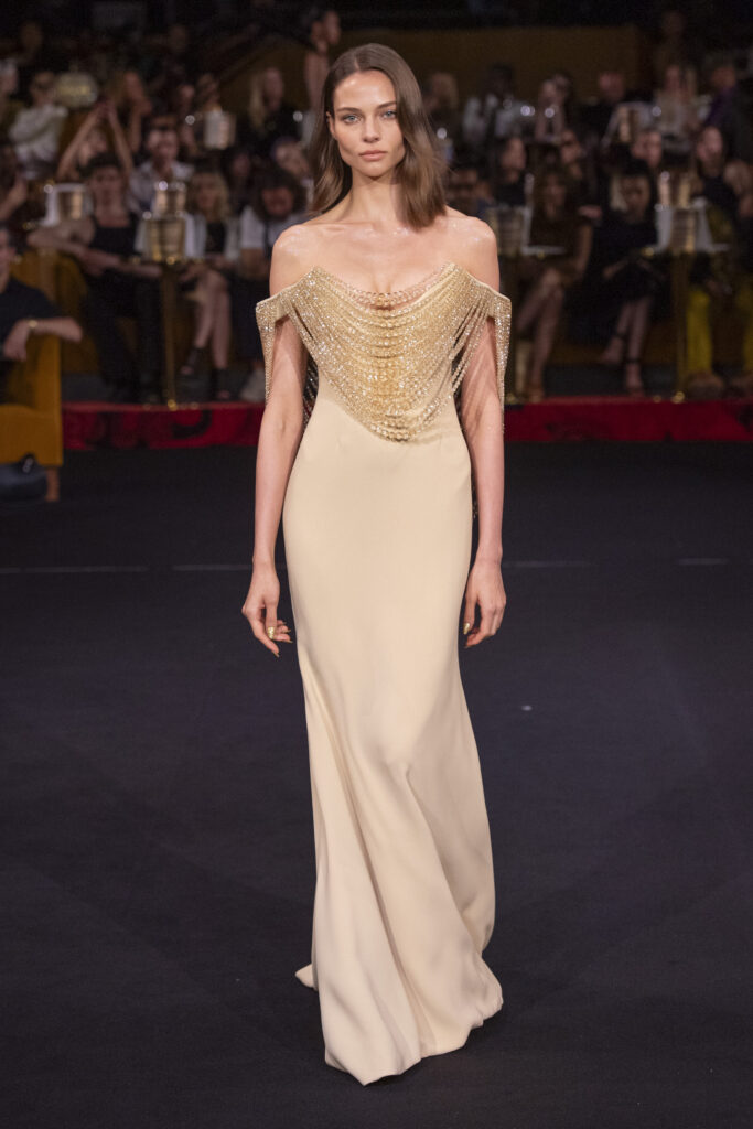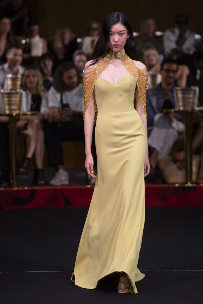 Alexis Mabille, maître incontesté de l’élégance parisienne, joue avec une palette de matières somptueuses, allant du crêpe fluide au velours frémissant, en passant par le lamé scintillant et le jersey sensuel. Les tissus se déploient avec une souplesse et une brillance qui évoquent la légèreté des bulles de champagne, reflétant une femme à la fois délicate et fatale, toujours étincelante.