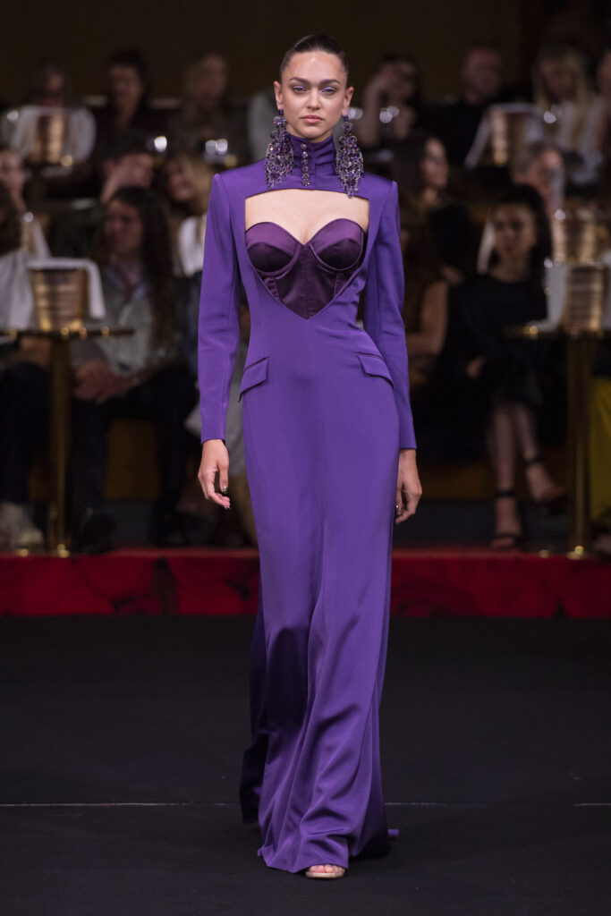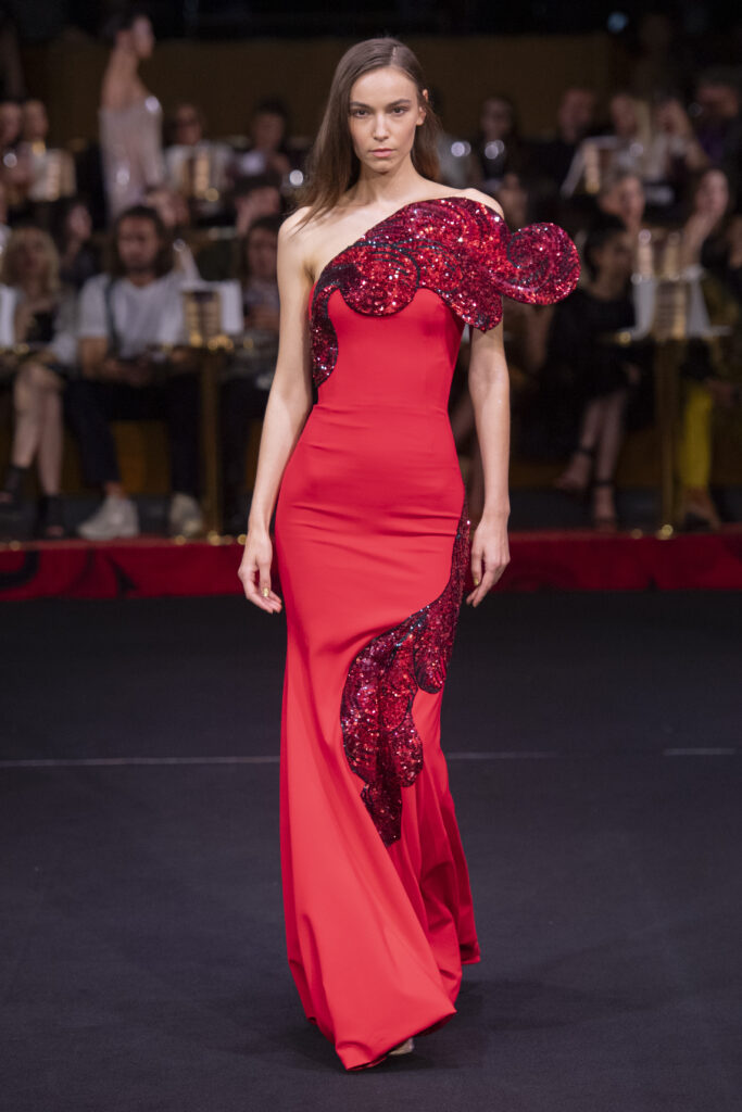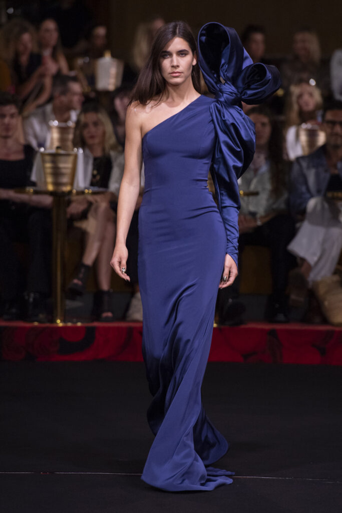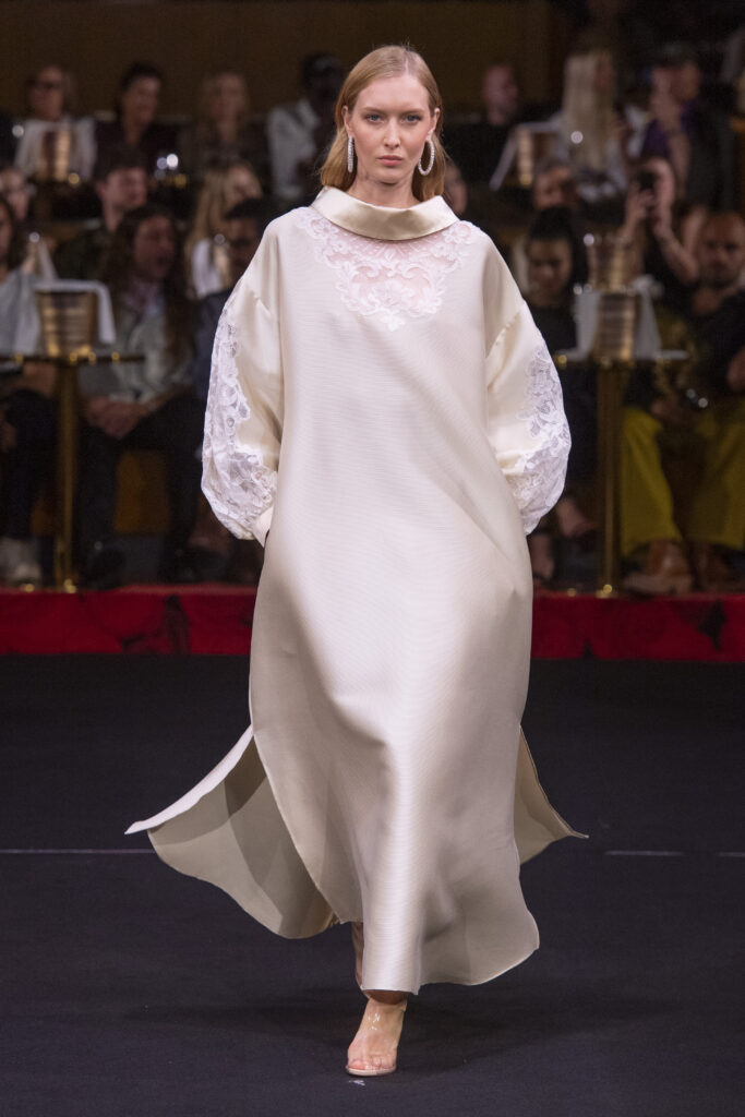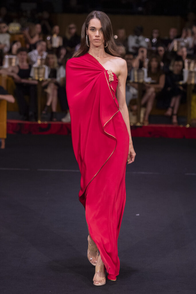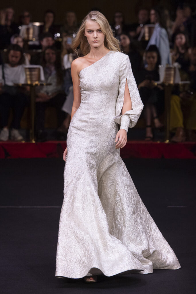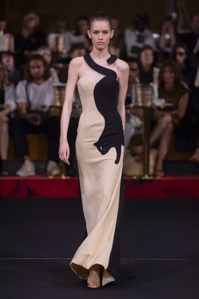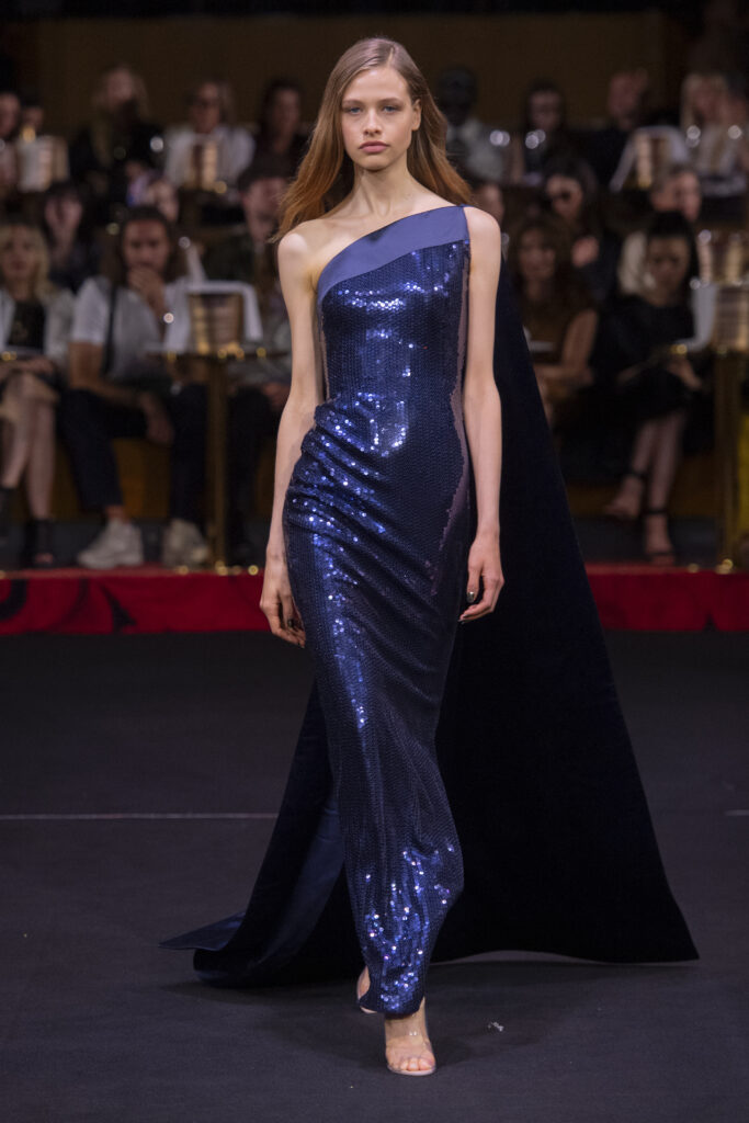 Alexis Mabille, maître incontesté de l’élégance parisienne, joue avec une palette de matières somptueuses, allant du crêpe fluide au velours frémissant, en passant par le lamé scintillant et le jersey sensuel. Les tissus se déploient avec une souplesse et une brillance qui évoquent la légèreté des bulles de champagne, reflétant une femme à la fois délicate et fatale, toujours étincelante.