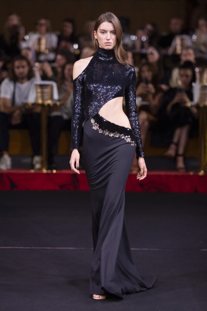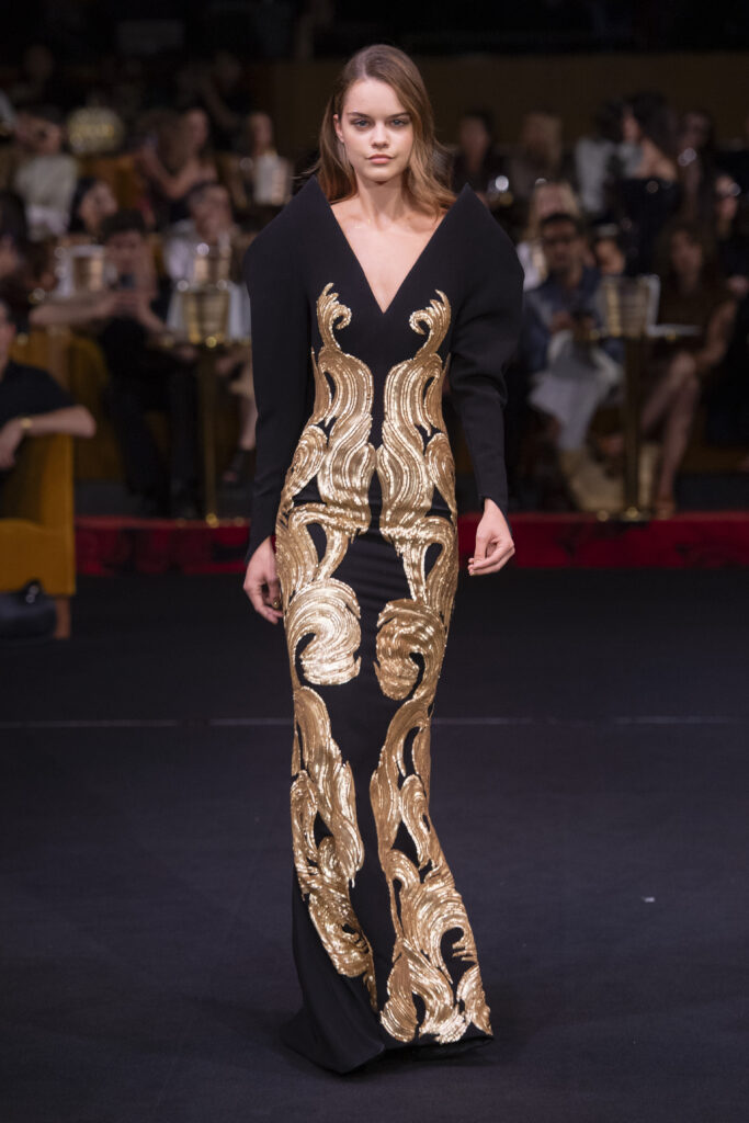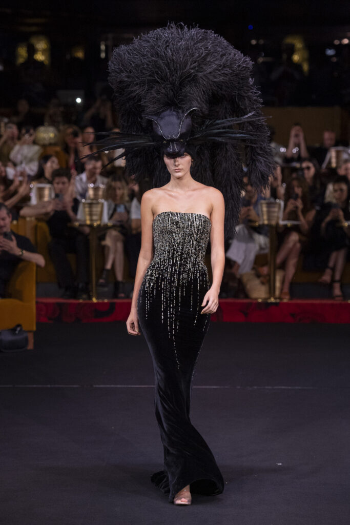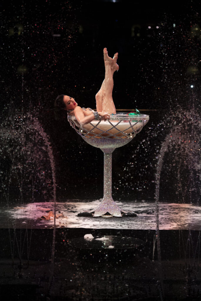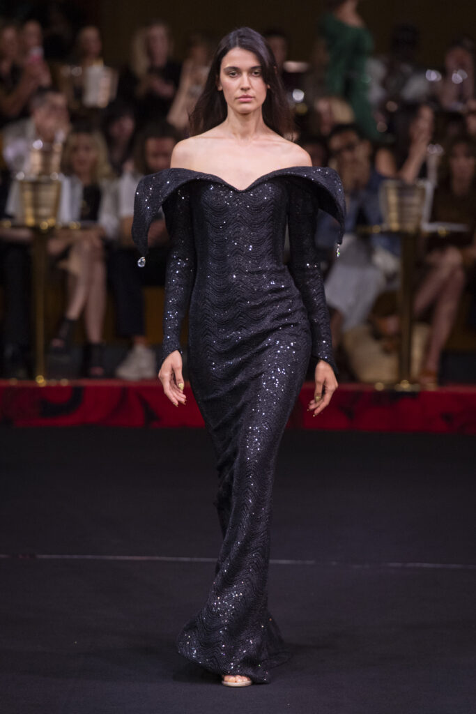 La mise en scène du défilé, au cœur du Lido, renforce cette atmosphère de fête. Les mannequins évoluent dans un décor somptueux, ponctué par les performances envoûtantes de Dita von Teese, icône de la sensualité, qui apporte une dimension théâtrale à cet événement déjà captivant. La bande sonore, signée Emmanuel Caurel, accompagne les mouvements des étoffes, accentuant chaque éclat, chaque scintillement.