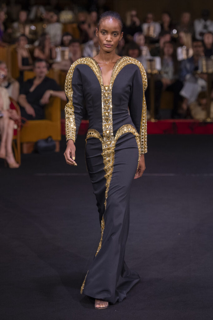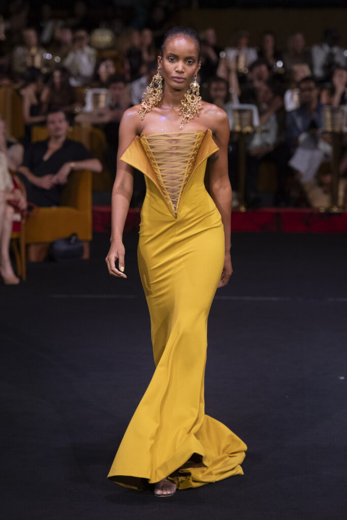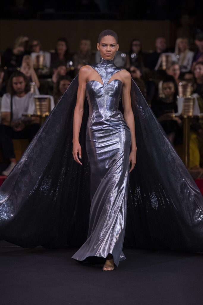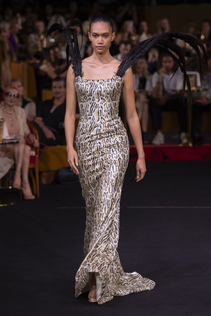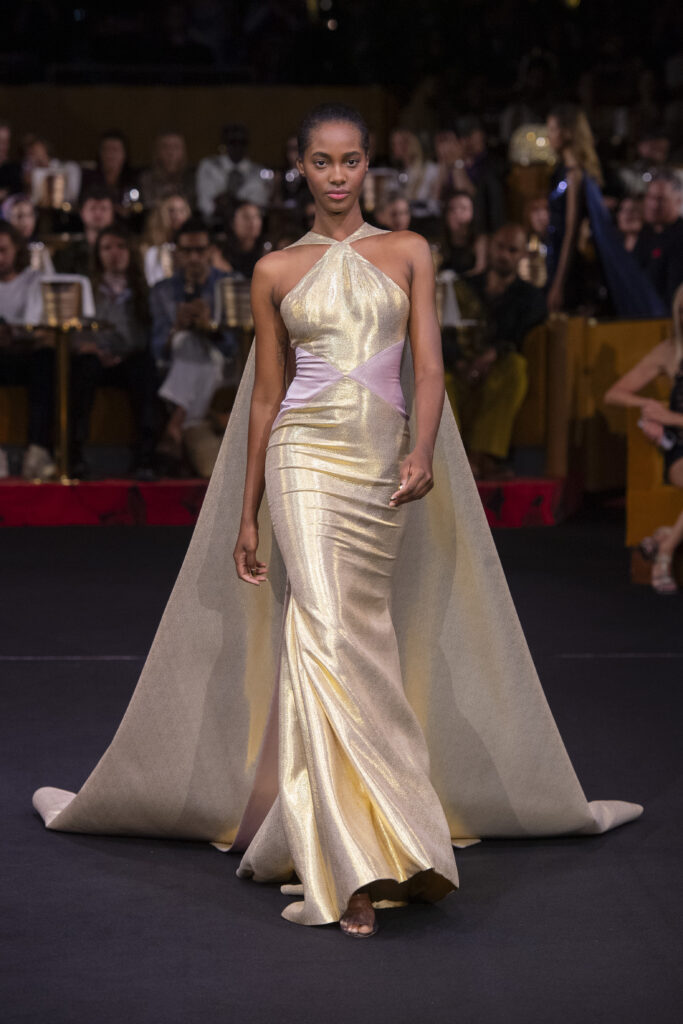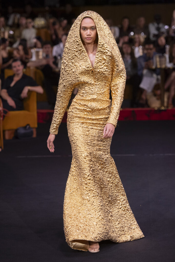 La collection se termine sur une note grandiose avec des pièces en lamé et brocart doré, où les capes et les drapés se fondent pour créer des silhouettes majestueuses. Les dernières créations, avec leurs coupes asymétriques et leurs ornements audacieux, rappellent que la mode, pour Alexis Mabille, est avant tout un art du détail et de la mise en scène.