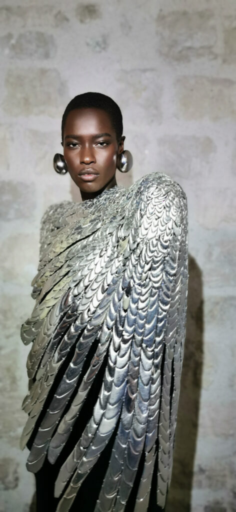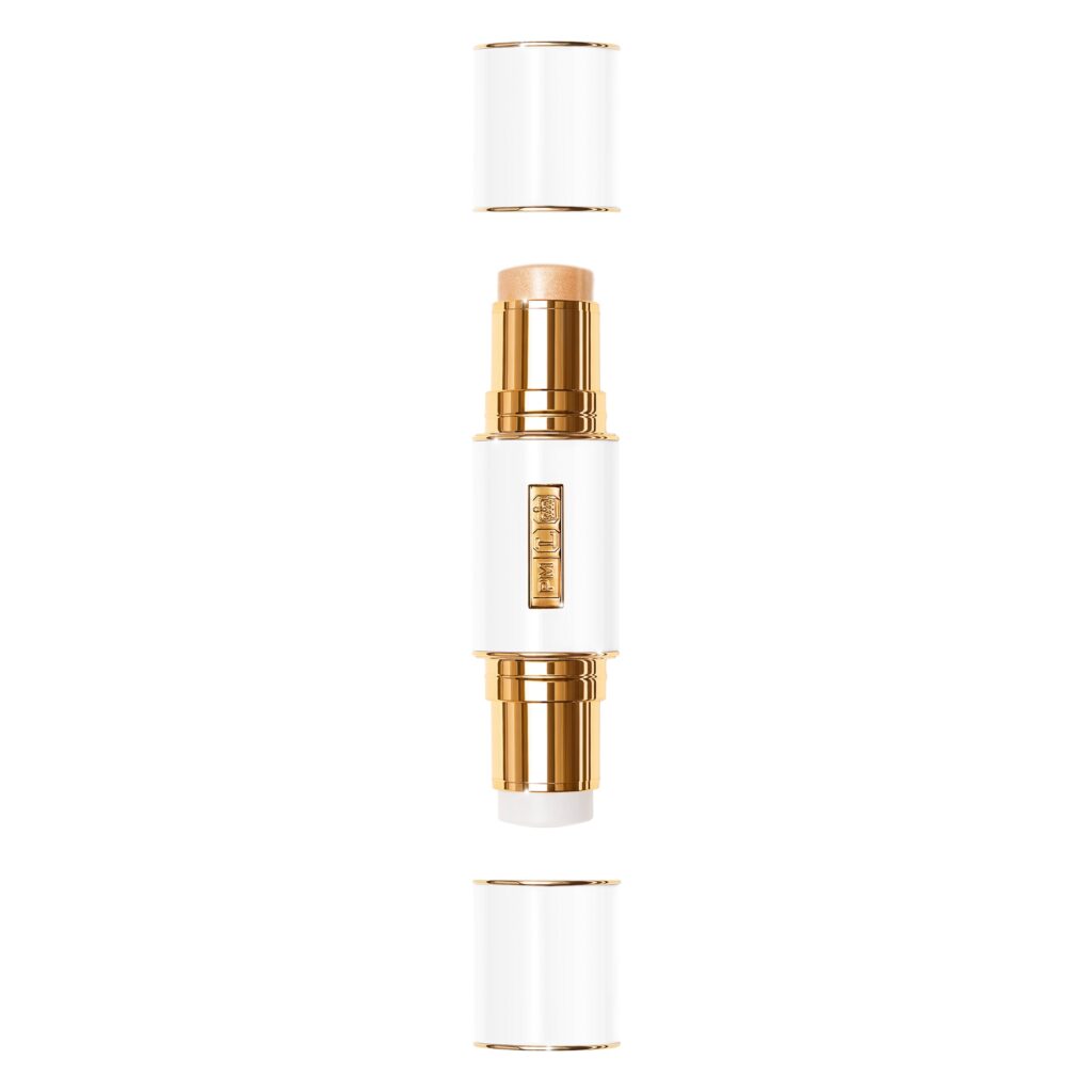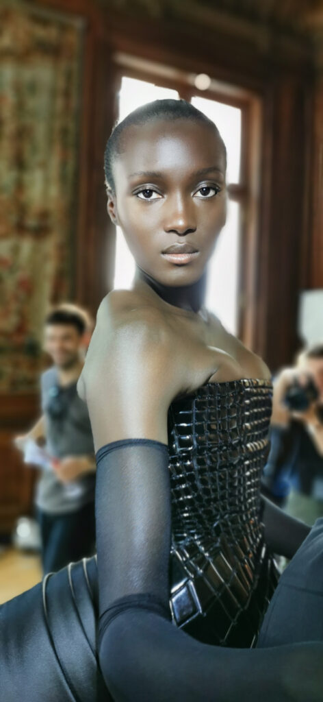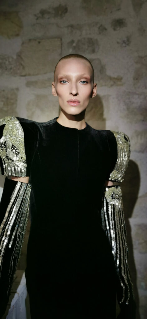 Au cœur de cette collaboration se trouve l’idée de sculpter le visage avec la lumière. Pat McGrath a utilisé son duo emblématique Skin Fetish : Highlighter + Balm et le Skin Fetish : Divine Glow Highlighter pour créer une luminosité nacrée sur les points culminants du visage. Cette technique, qui évoque une sorte d’auréole céleste, donne aux modèles une apparence à la fois forte et surnaturelle. Le maquillage devient ici une forme de métamorphose, transformant les visages en œuvres d’art lumineuses.