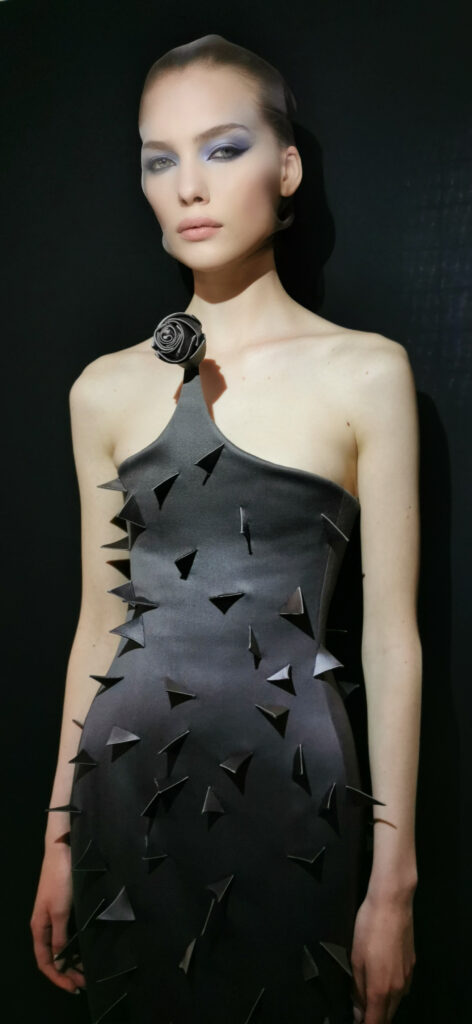 Pour certains modèles, Pat McGrath a choisi d’incorporer un dégradé de bleu sur les yeux, une teinte personnalisée rappelant le papillon, symbole classique de la renaissance et de la réinvention. Ce choix chromatique ajoute une dimension onirique et mystérieuse, renforçant l’idée de transformation continue, chère à la maison Schiaparelli.
