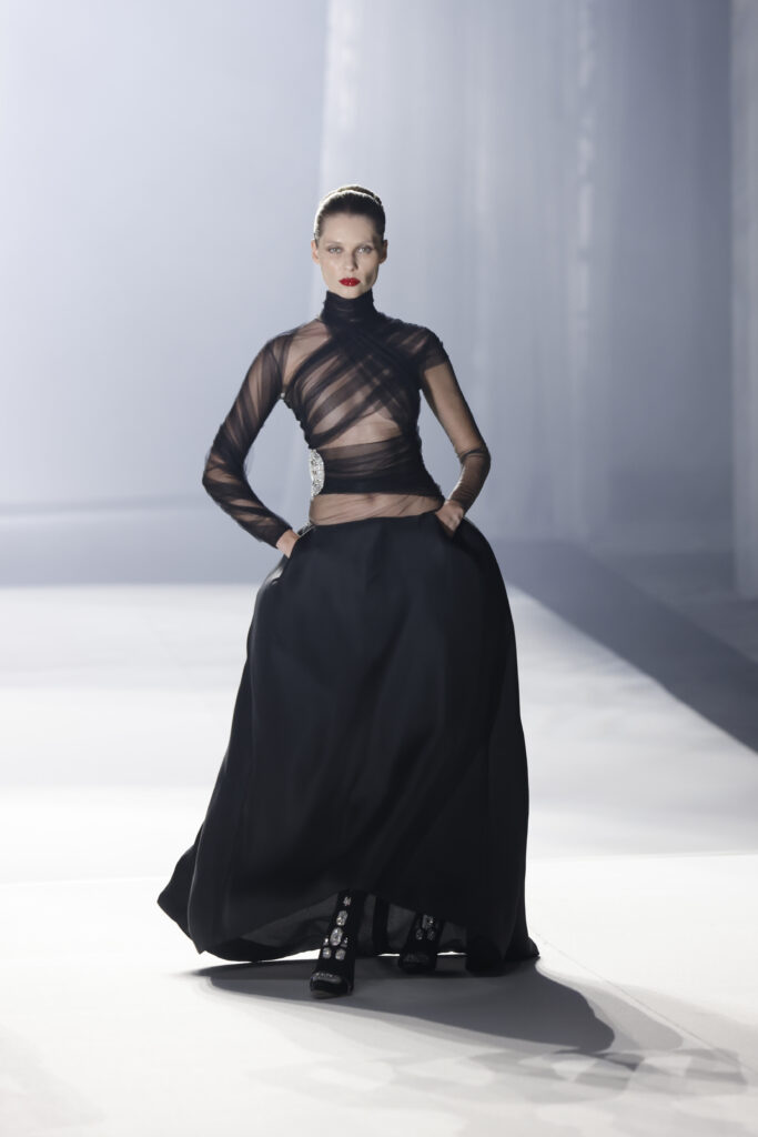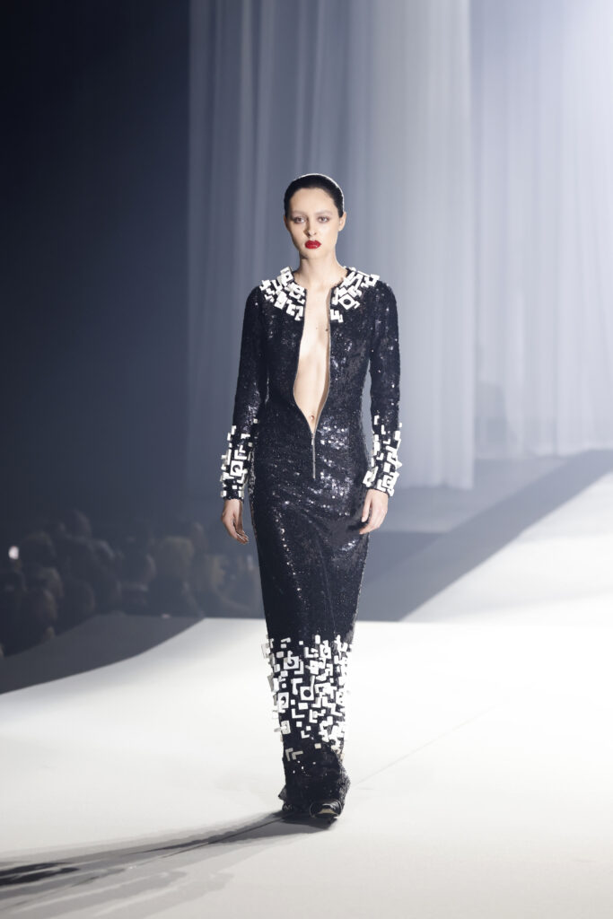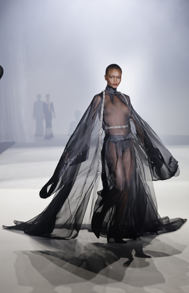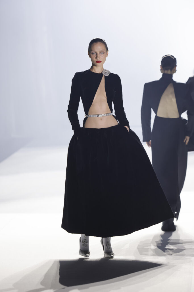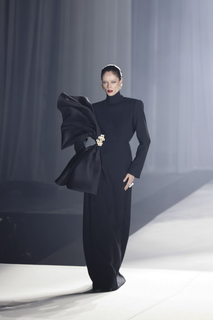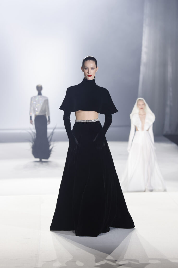 Chaque pièce de cette collection est une œuvre d’art en soi, oscillant entre le respect des codes de la Haute Couture et une liberté créative audacieuse. Les robes tailleurs et les combinaisons smoking ajourées réinterprètent la rigueur du vestiaire masculin avec une sensualité féminine, tandis que les capes et les manteaux à capuche en velours noir apportent une dimension théâtrale et mystérieuse.