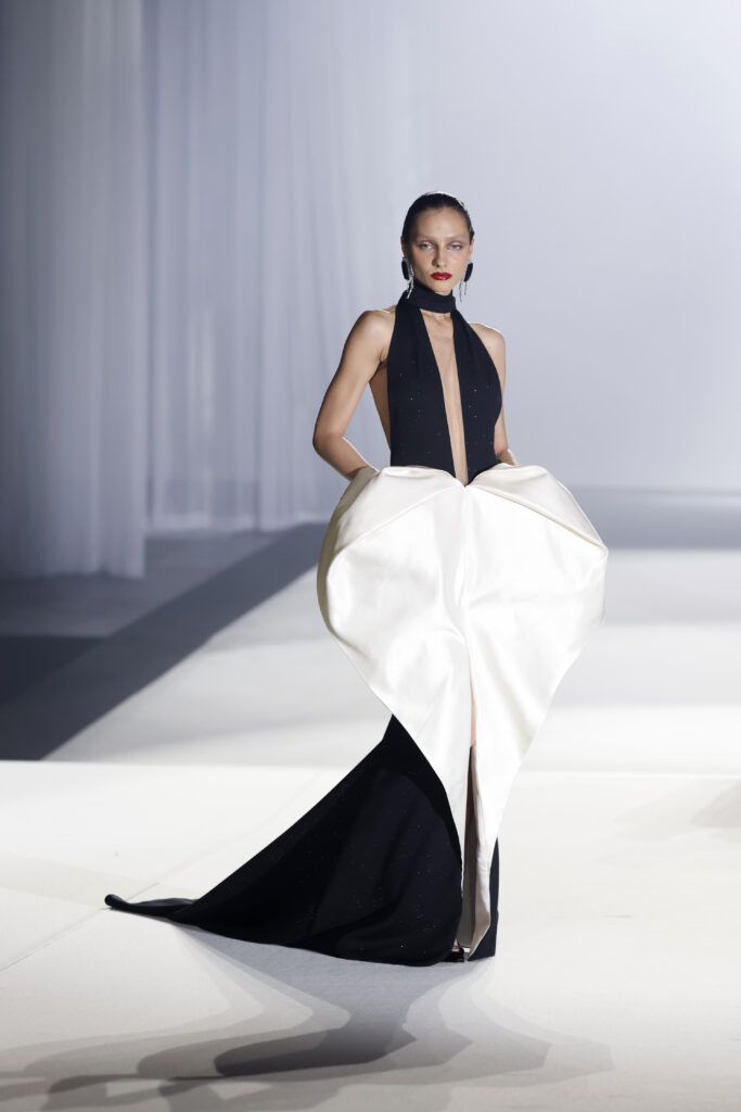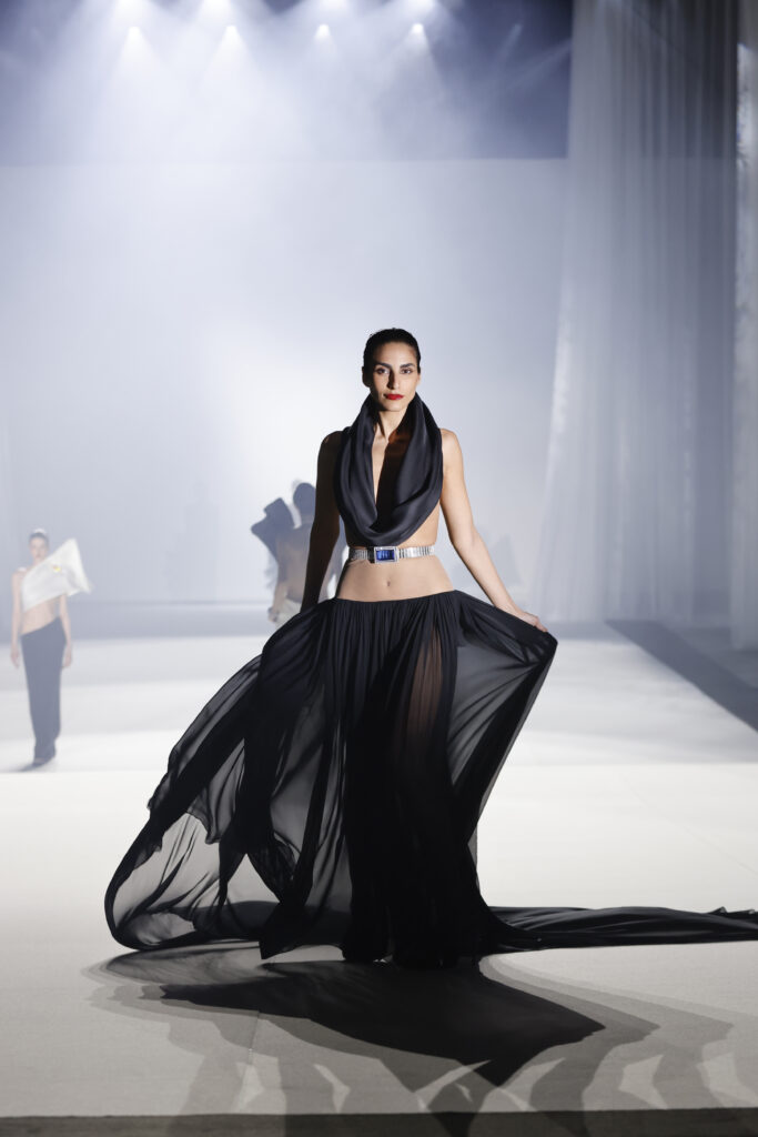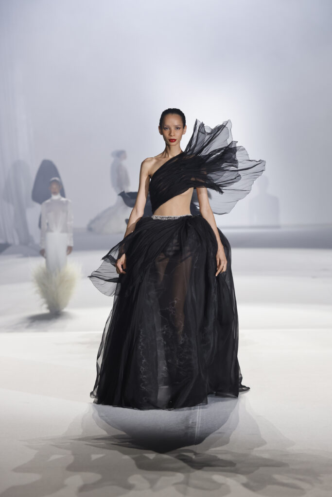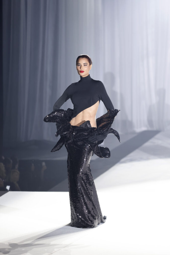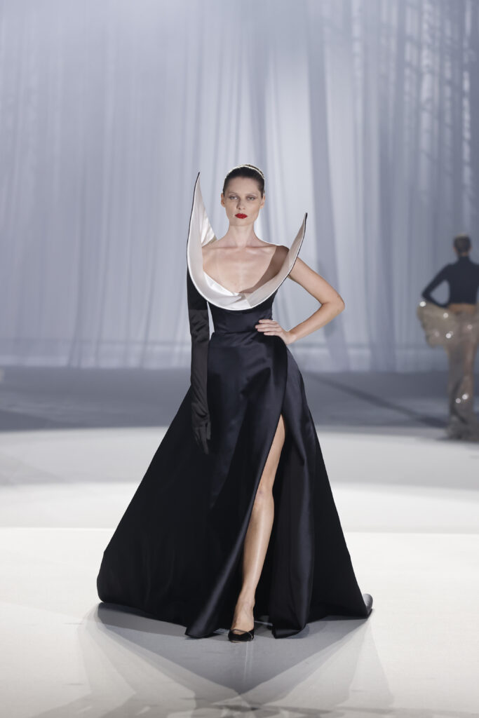 Chaque pièce de cette collection est une œuvre d’art en soi, oscillant entre le respect des codes de la Haute Couture et une liberté créative audacieuse. Les robes tailleurs et les combinaisons smoking ajourées réinterprètent la rigueur du vestiaire masculin avec une sensualité féminine, tandis que les capes et les manteaux à capuche en velours noir apportent une dimension théâtrale et mystérieuse.