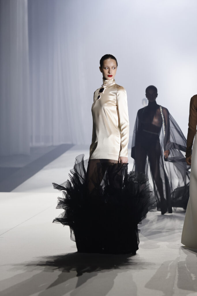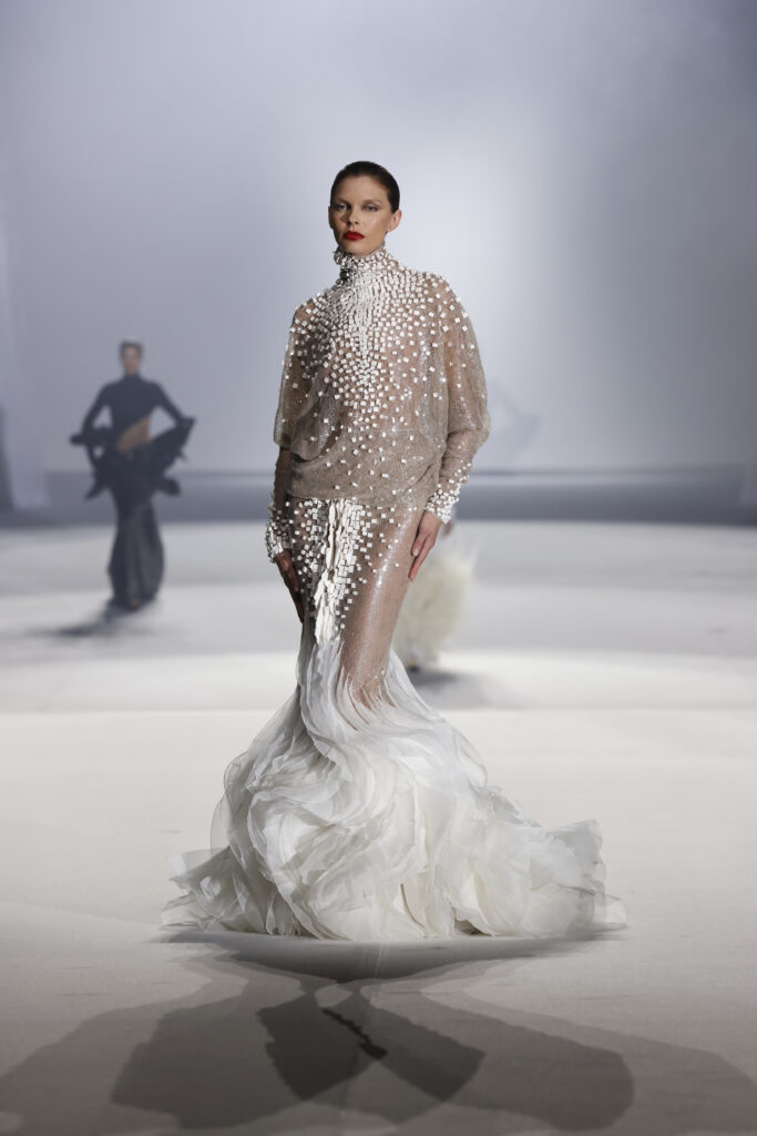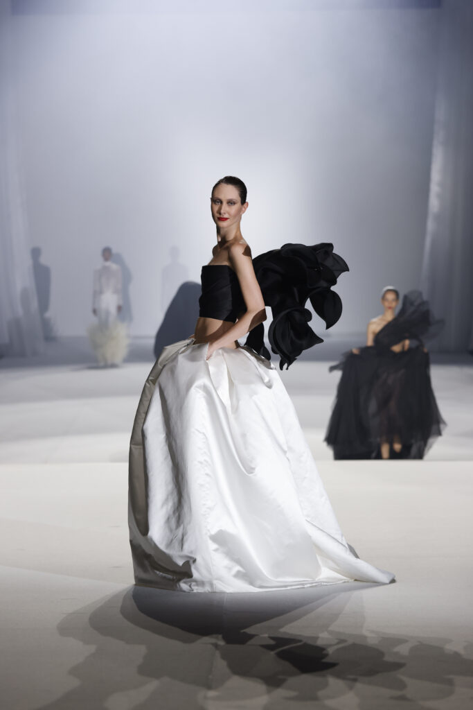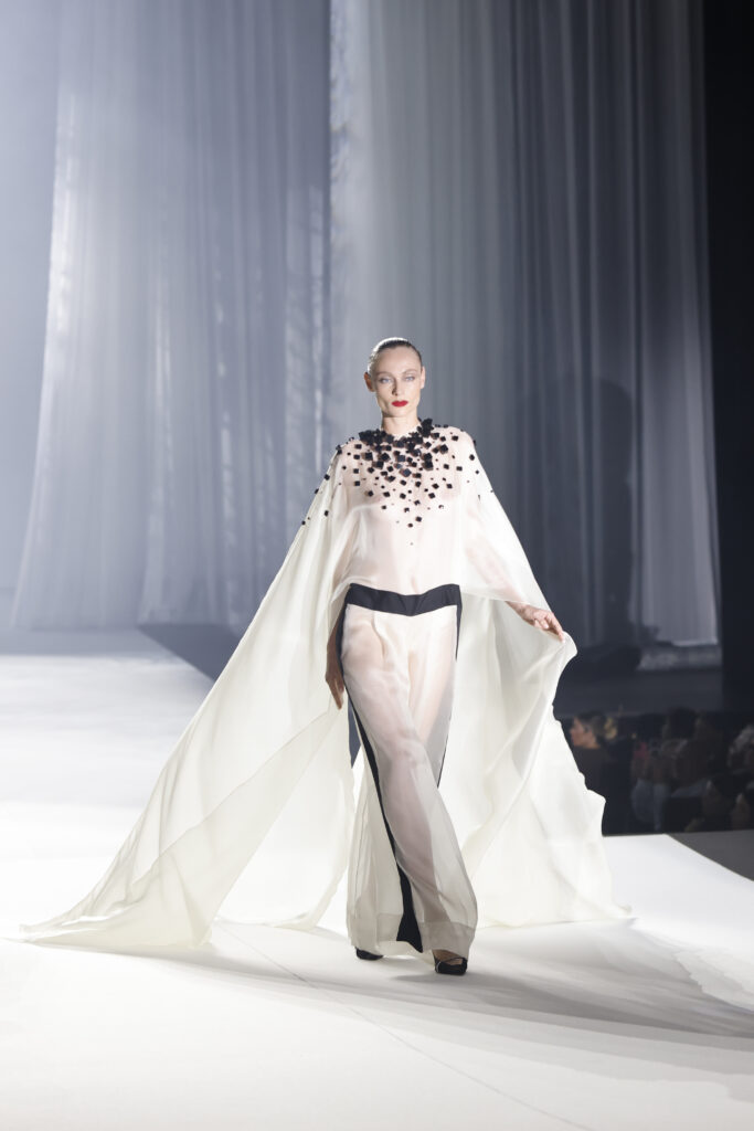 La collection se termine par une robe de mariée qui incarne l’apothéose de ce dialogue entre ombre et lumière, poésie et couture. Une capuche géante en gazar de laine blanc, brodée de pétales en porcelaine et organza, surmonte une jupe à traîne, évoquant à la fois la pureté de la mariée et le mystère de la nuit parisienne.