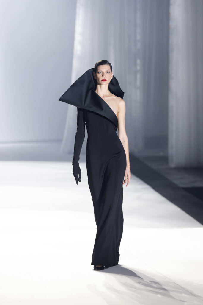 Les créations de Rolland se caractérisent par des coupes nettes et architecturales, à l’image d’une épaule carrée ou d’une manche droite, qui évoquent la structure rigide mais élégante des bâtiments parisiens. Les tissus choisis — velours, crêpe, gazar, et organza — confèrent une richesse tactile qui rappelle la diversité des textures trouvées dans les paysages urbains de Paris. Le noir, omniprésent, est subtilement rehaussé par des touches de blanc, d’argent et de diamants, créant des contrastes saisissants dignes d’un jeu d’ombres et de lumières.