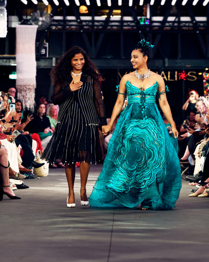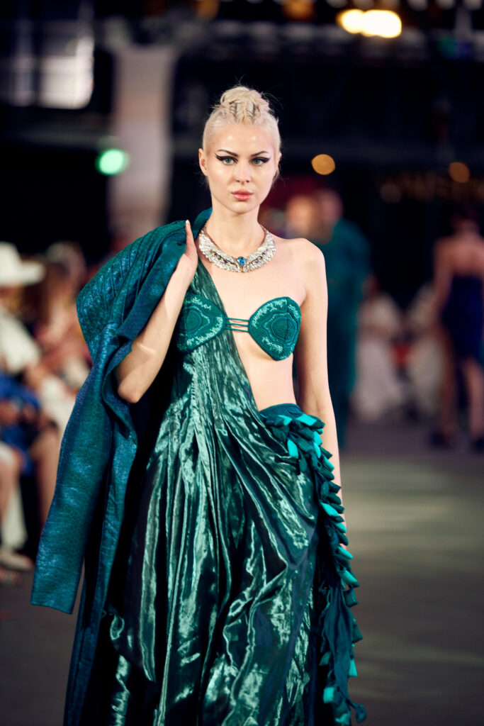 En tant que partenaire joaillier de la collection, Tanishq a enrichi les créations de Vaishali S avec des pièces élégantes de haute joaillerie, mettant en avant des diamants rares et authentiques. Ces bijoux, inspirés par la beauté de la flore et de la faune indiennes, complètent les vêtements en ajoutant une touche d’authenticité culturelle et symbolisent la sagesse et la pureté.