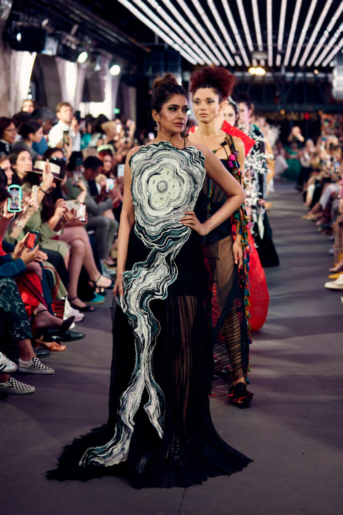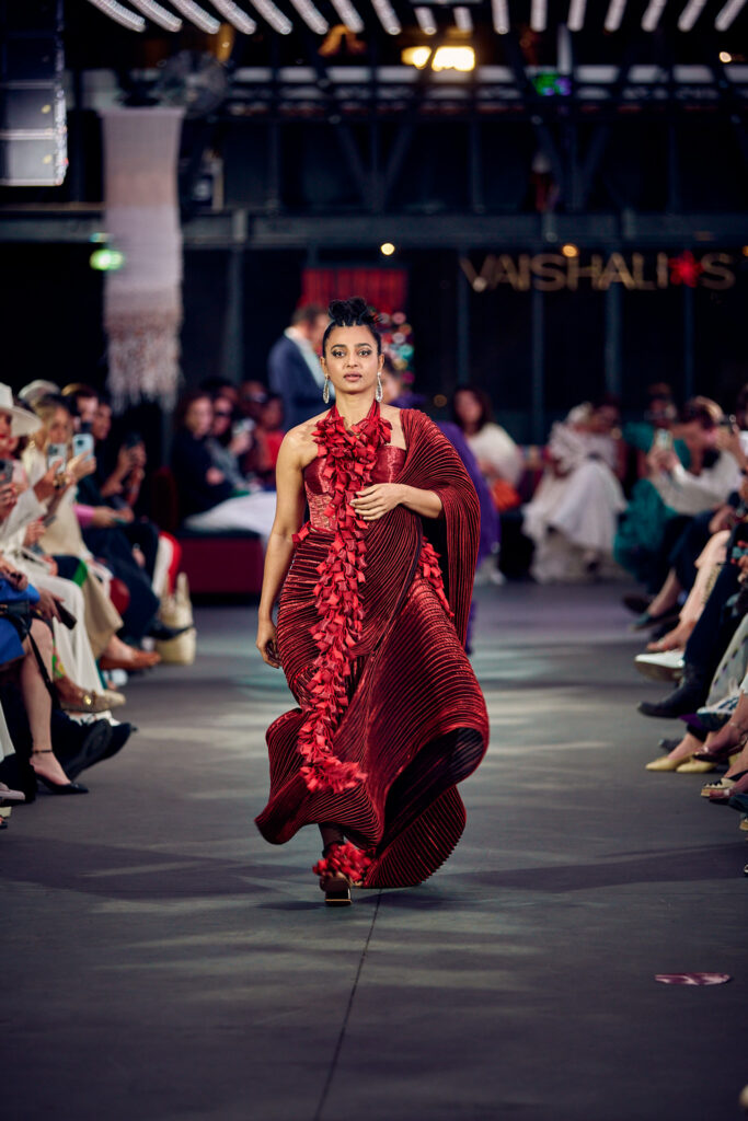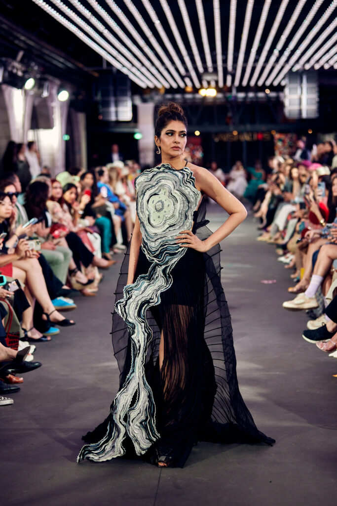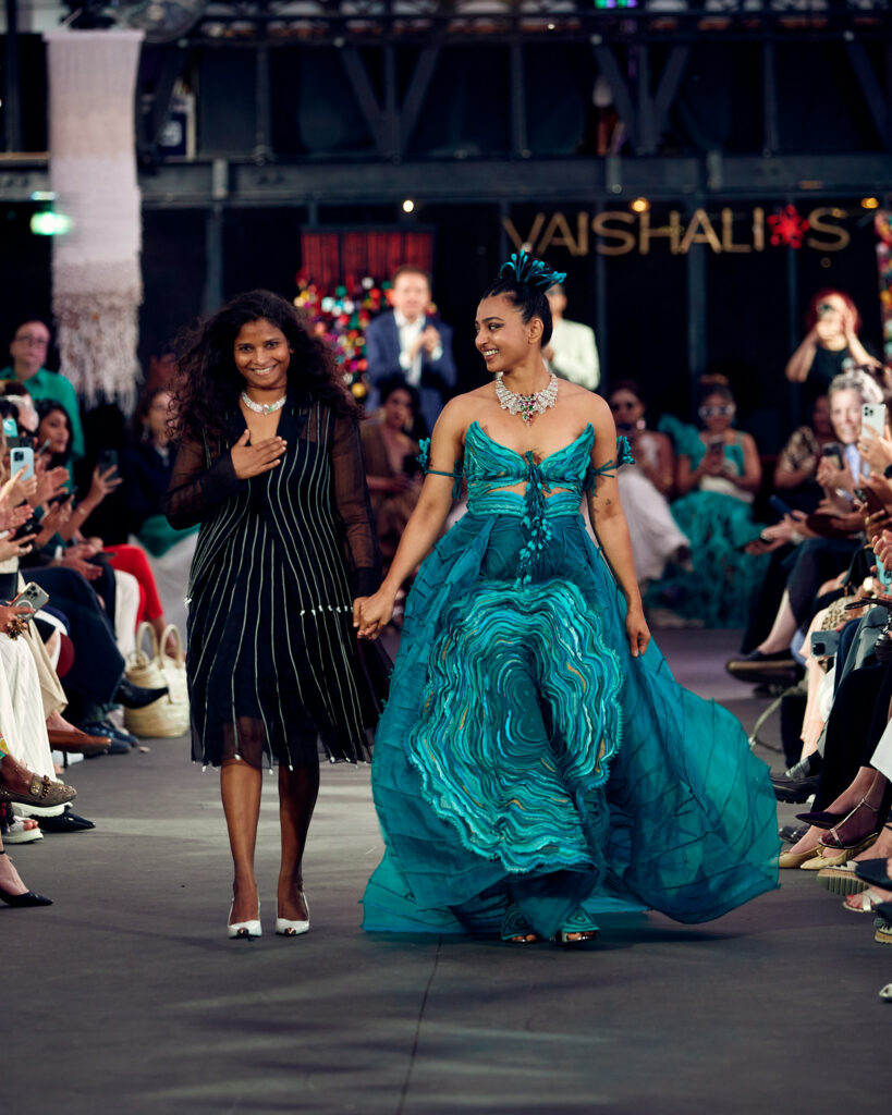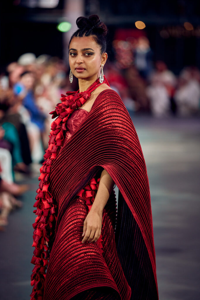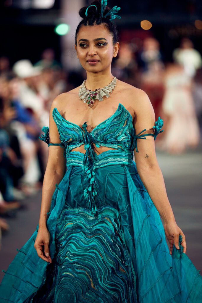 Radhika Apte, connue pour ses rôles disruptifs dans le cinéma international, a illuminé le défilé en ouvrant et clôturant l’événement dans deux créations distinctes. Elle a débuté dans une tenue bordeaux qui mettait en valeur la maîtrise de Vaishali S en matière de drapage et de techniques de cording. Le point culminant du défilé a été une création bleutée, illustrant le savoir-faire artisanal unique de la créatrice, avec des couches multiples travaillées à plat, symbolisant les différentes strates de la réalité.