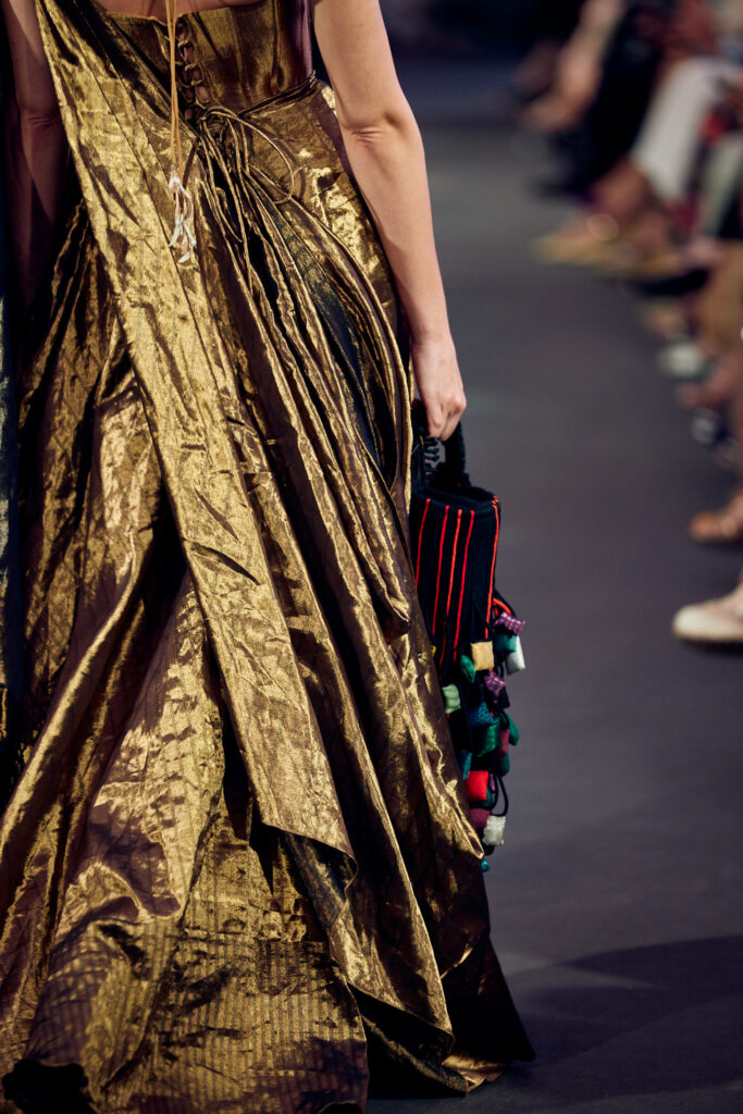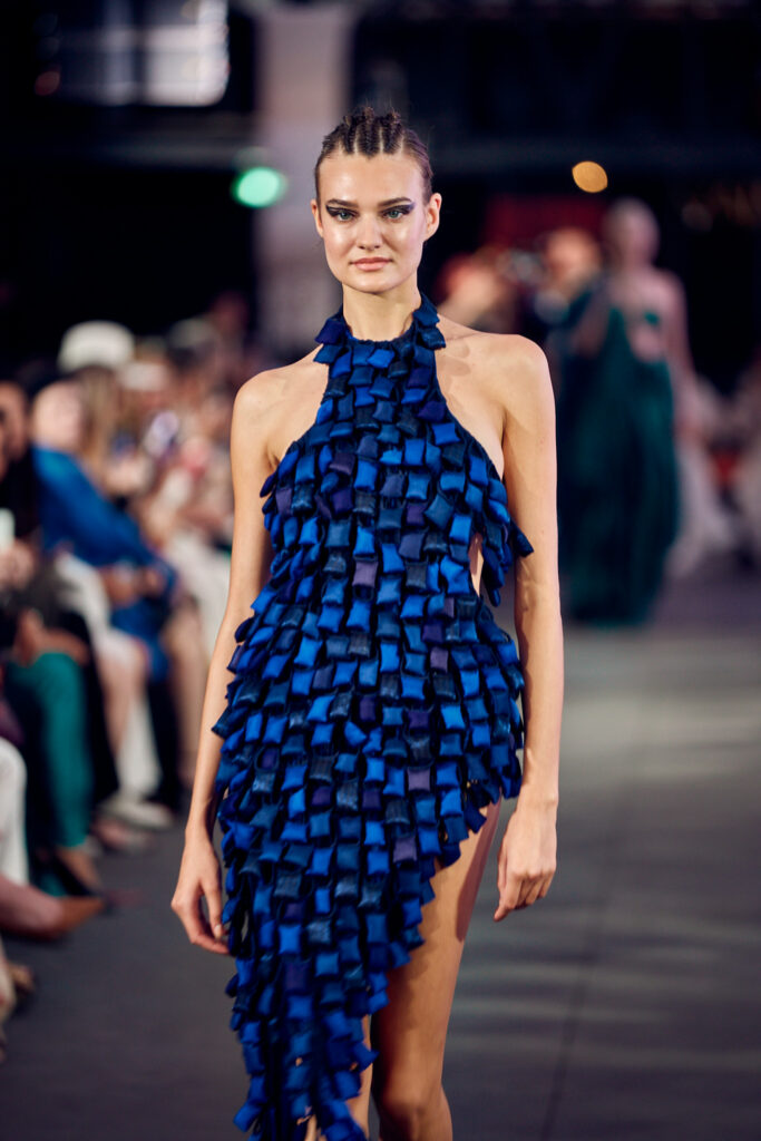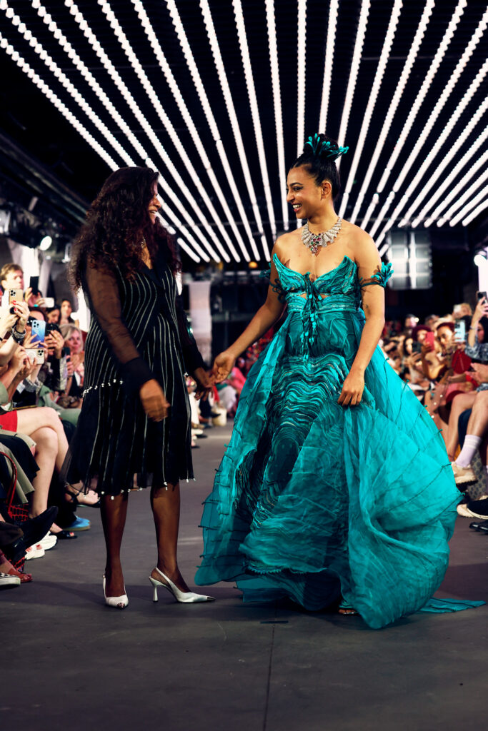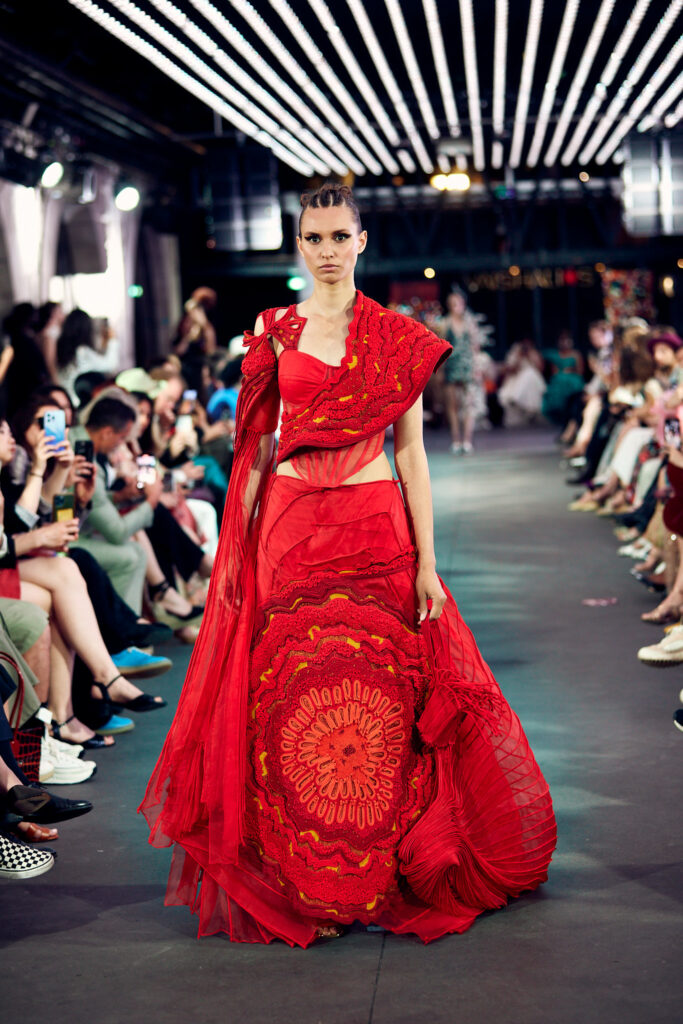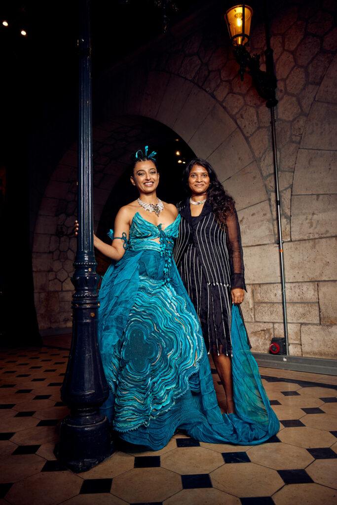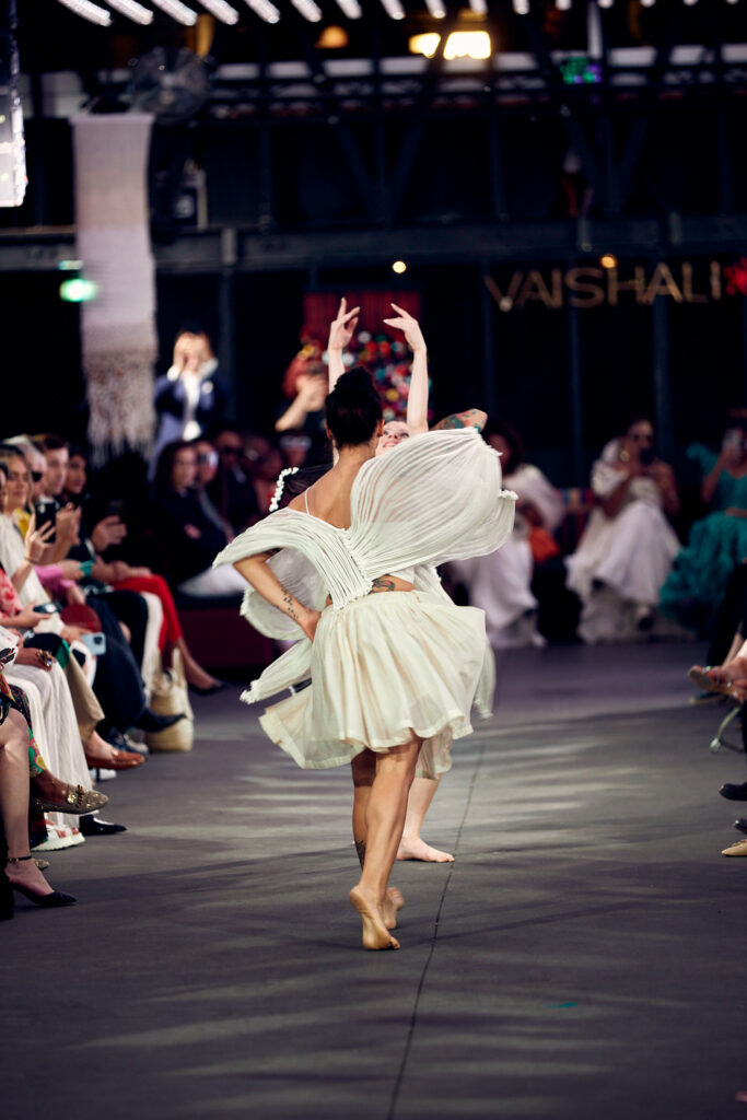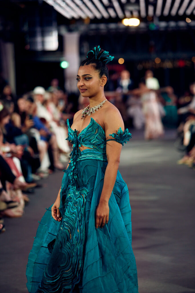 Radhika Apte, connue pour ses rôles disruptifs dans le cinéma international, a illuminé le défilé en ouvrant et clôturant l’événement dans deux créations distinctes. Elle a débuté dans une tenue bordeaux qui mettait en valeur la maîtrise de Vaishali S en matière de drapage et de techniques de cording. Le point culminant du défilé a été une création bleutée, illustrant le savoir-faire artisanal unique de la créatrice, avec des couches multiples travaillées à plat, symbolisant les différentes strates de la réalité.