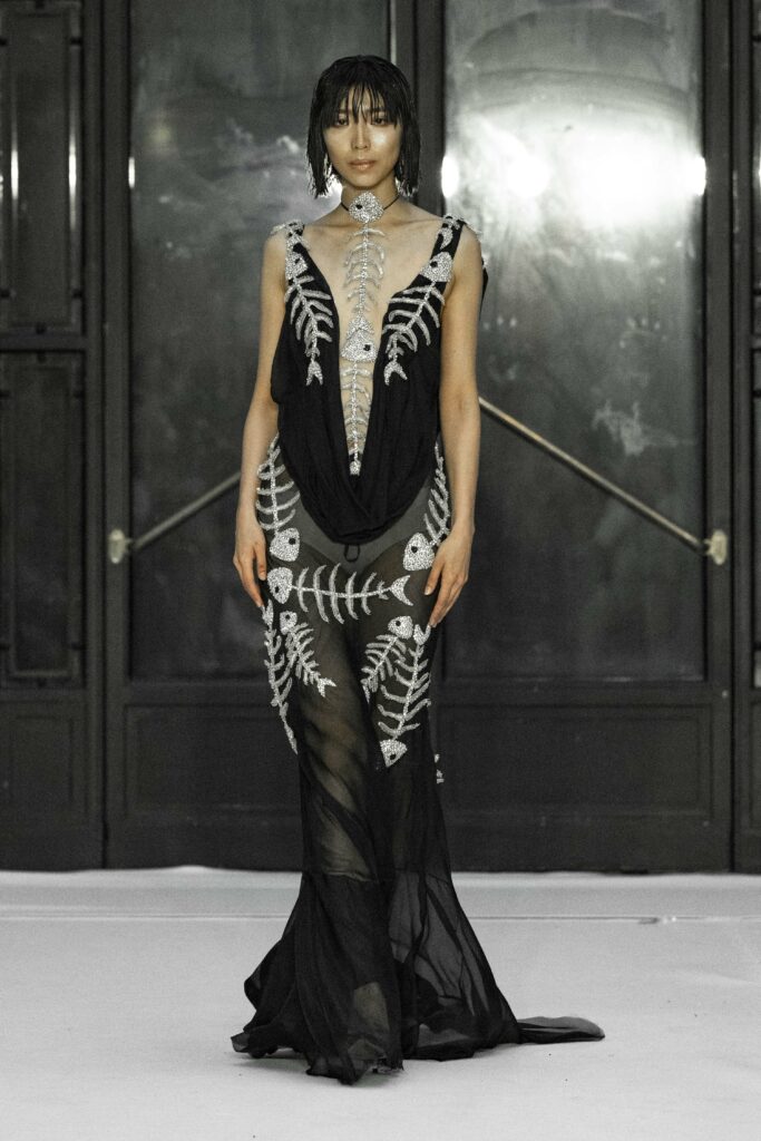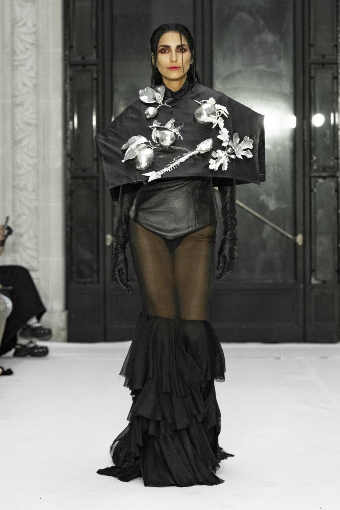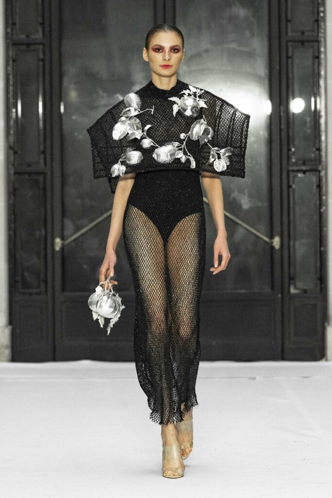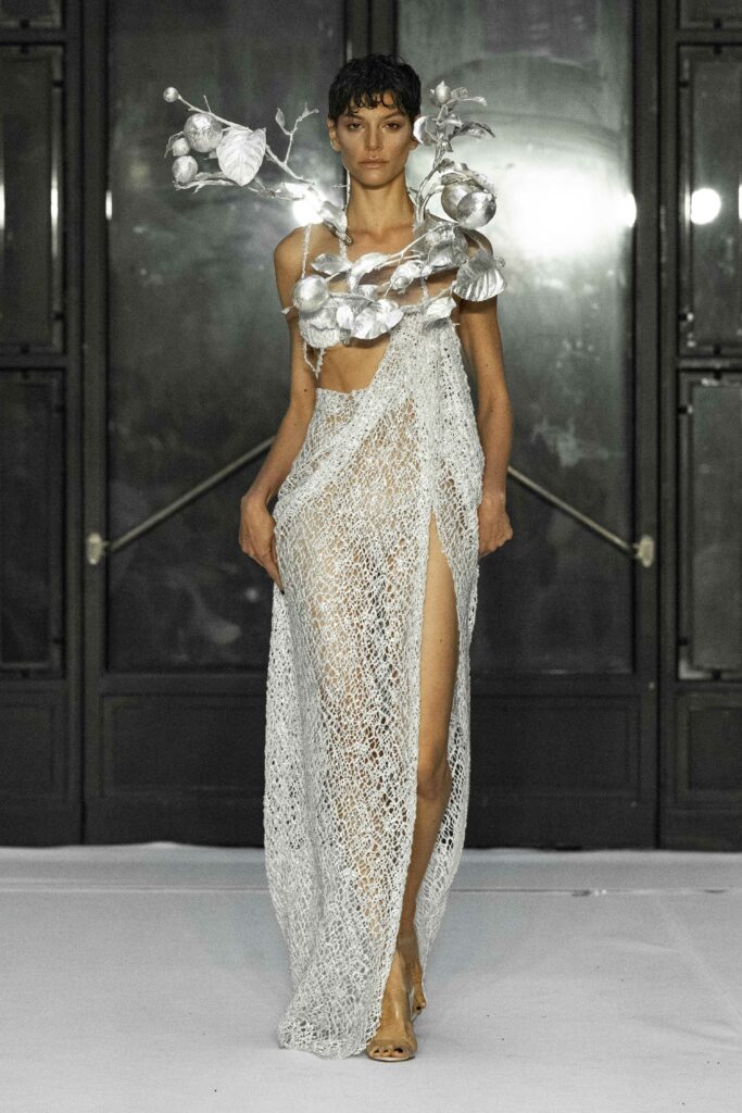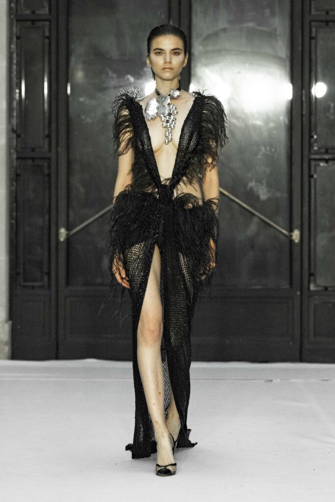Le fruit du péché, symbole universel de la tentation, se manifeste abondamment à travers les détails luxuriants de la collection. Des plumes délicates, de la dentelle Chantilly qui épouse le corps, et des voiles de gaze qui semblent couler comme une rivière, créent une atmosphère à la fois divine et charnelle. La silhouette féminine est magnifiée par des transparences suggestives, qui flirtent avec le désir et la beauté dans une danse presque sacrilège.