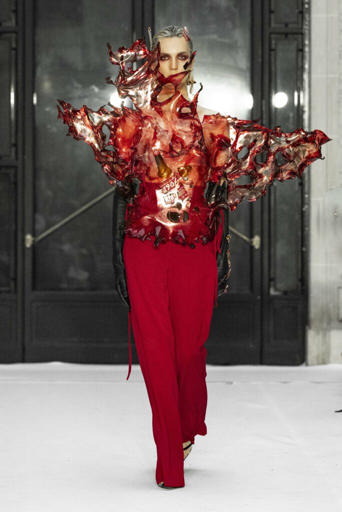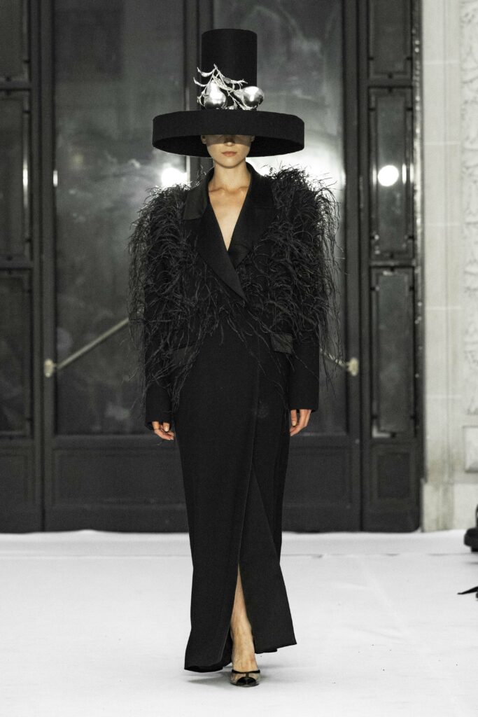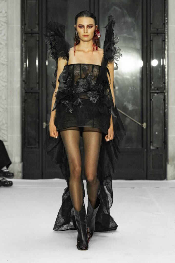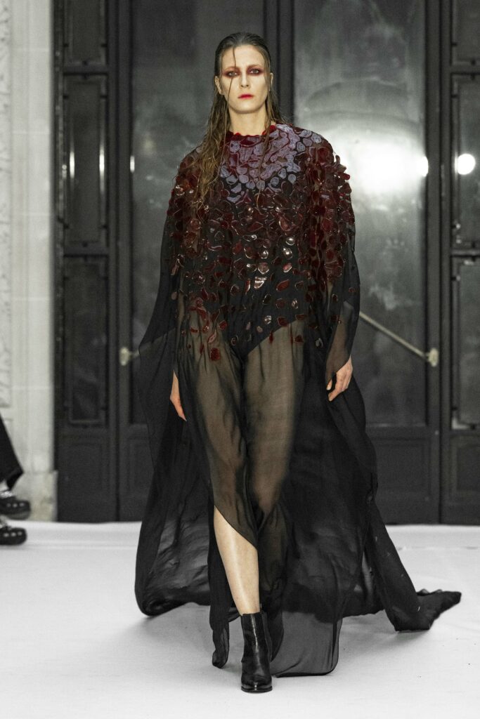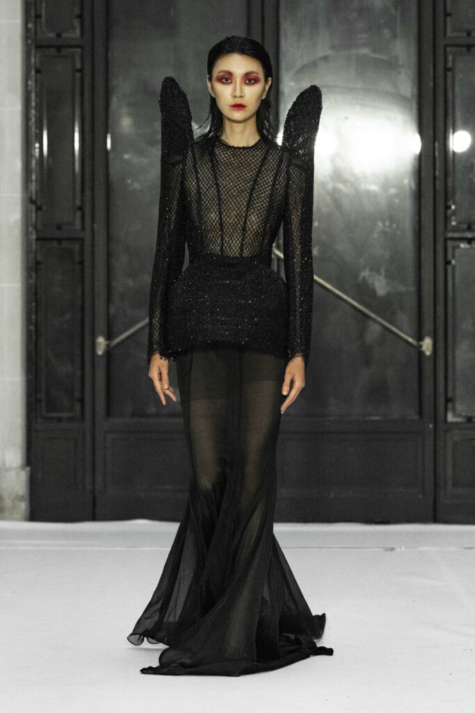 Le fruit du péché, symbole universel de la tentation, se manifeste abondamment à travers les détails luxuriants de la collection. Des plumes délicates, de la dentelle Chantilly qui épouse le corps, et des voiles de gaze qui semblent couler comme une rivière, créent une atmosphère à la fois divine et charnelle. La silhouette féminine est magnifiée par des transparences suggestives, qui flirtent avec le désir et la beauté dans une danse presque sacrilège.