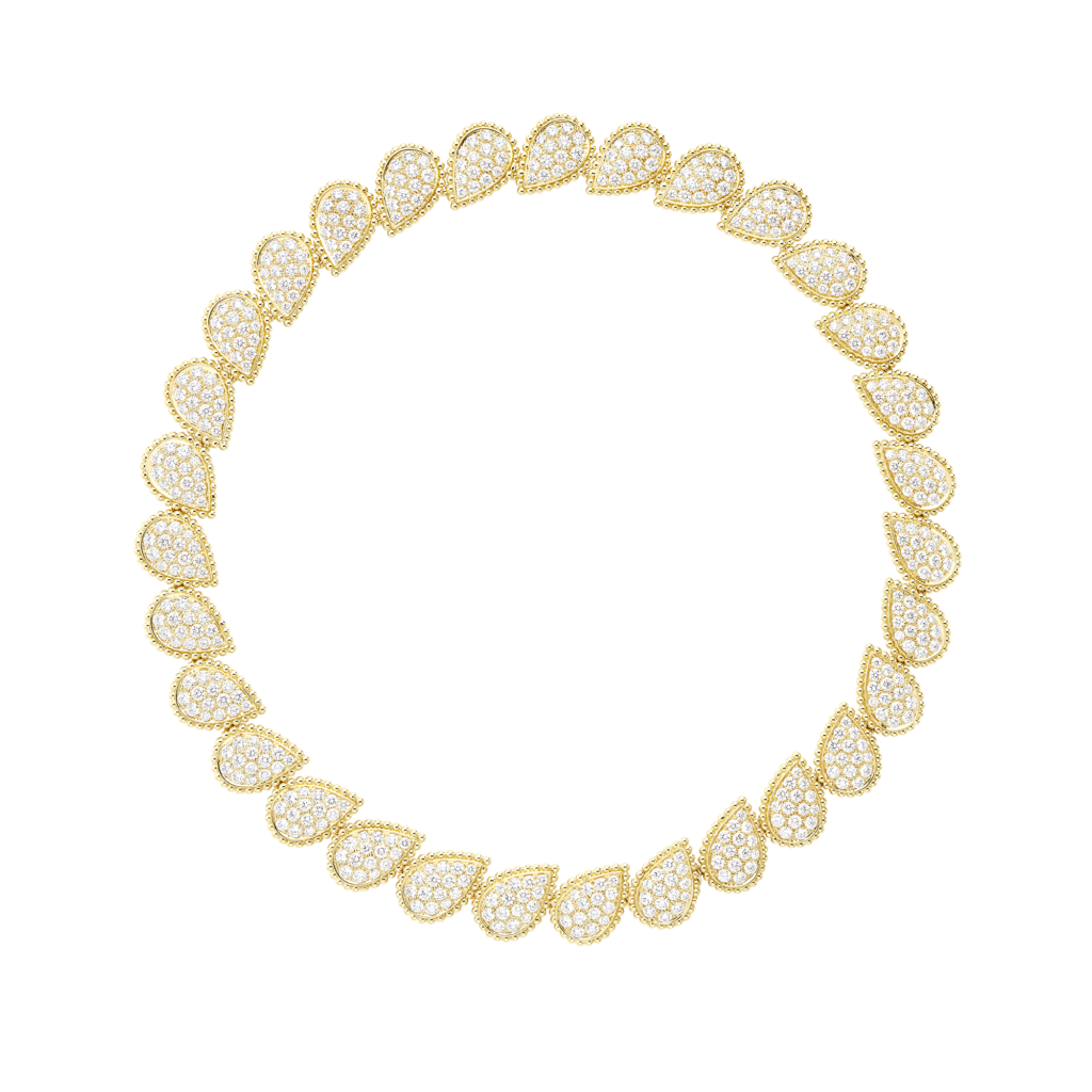 Le collier Serpent Bohème, composé de 31 motifs pavés de diamants, sur or jaune, a enveloppé son cou d’une élégance sans égale, ajoutant une dimension supplémentaire à sa tenue. Ce collier, véritable œuvre d’art, illustre parfaitement le mariage harmonieux entre tradition et modernité, si cher à la Maison Boucheron.