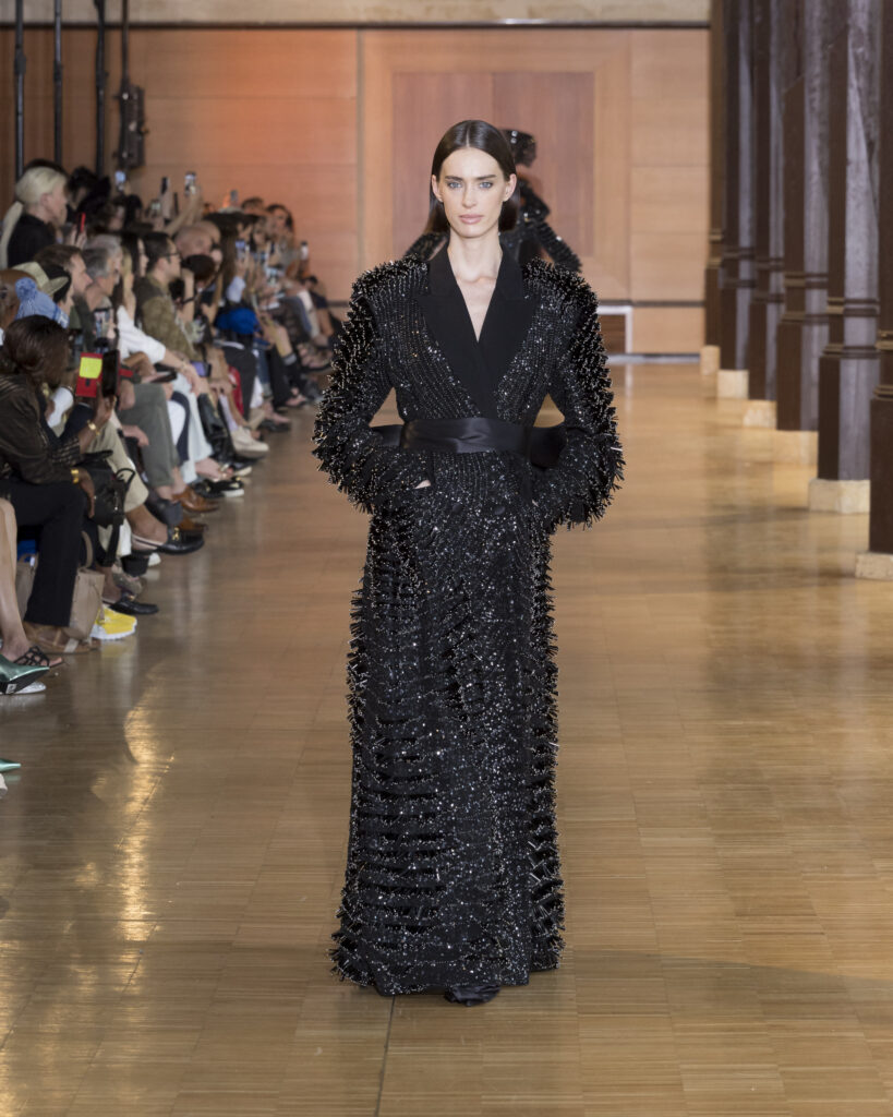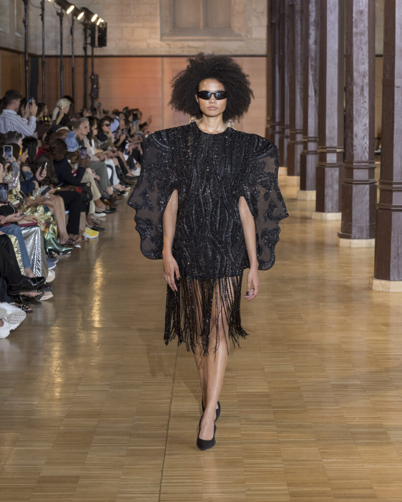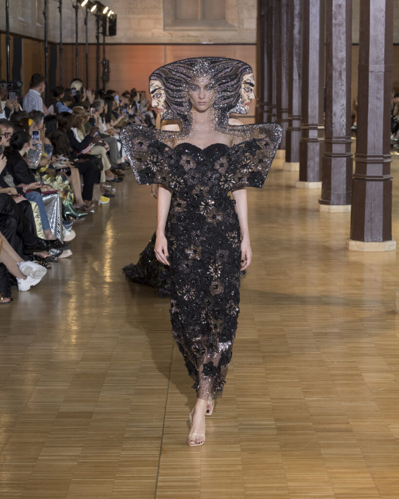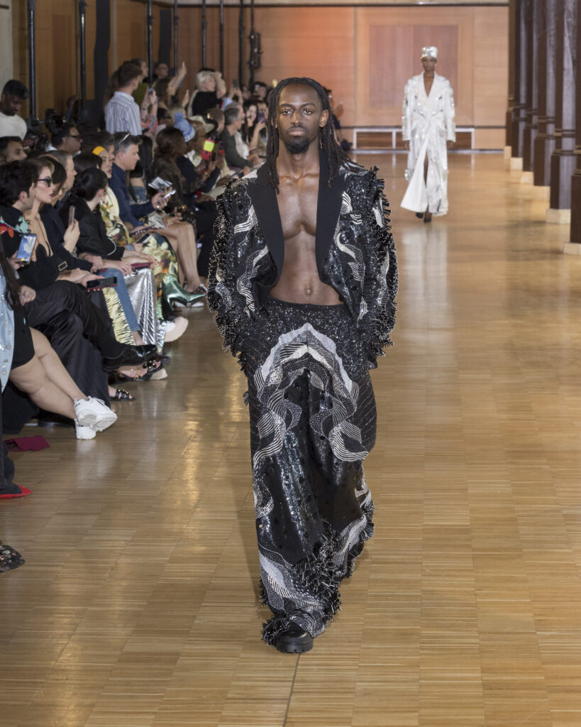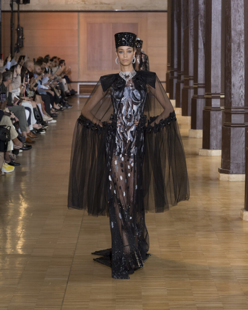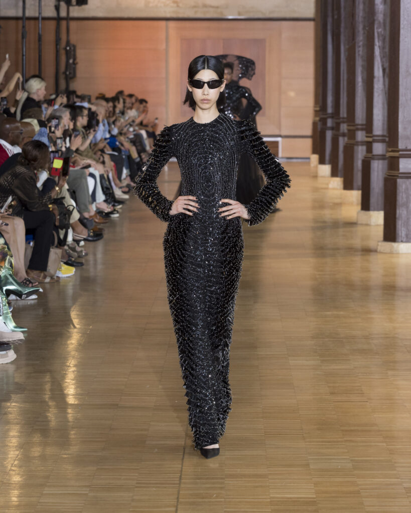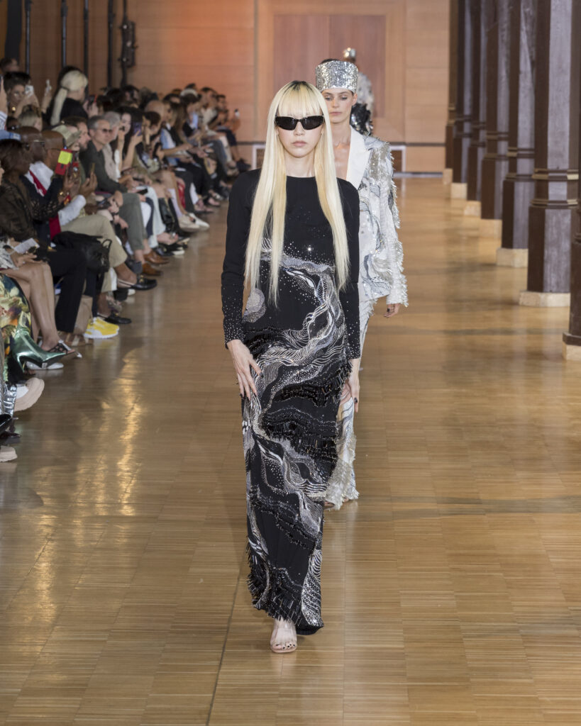 Les teintes profondes de noir et de gris, omniprésentes dans la collection, évoquent l’infinité du cosmos, une toile où la lumière et l’obscurité se rencontrent. Elles symbolisent le mystère et la profondeur de l’aura, cette force invisible mais palpable qui émane des êtres vivants. Les silhouettes, fluides et organiques, sont parsemées de broderies minutieuses, de perles de verre, de sequins et de strass, qui captent la lumière et la rediffusent, comme autant d’éclats de cette énergie primordiale.