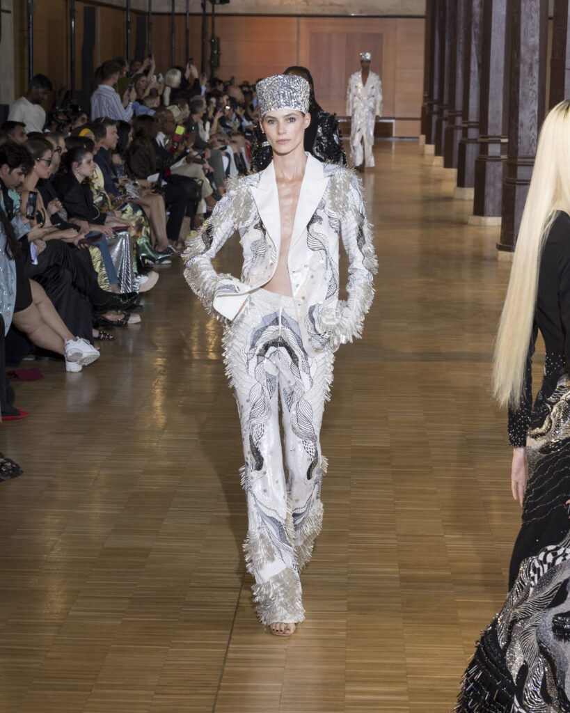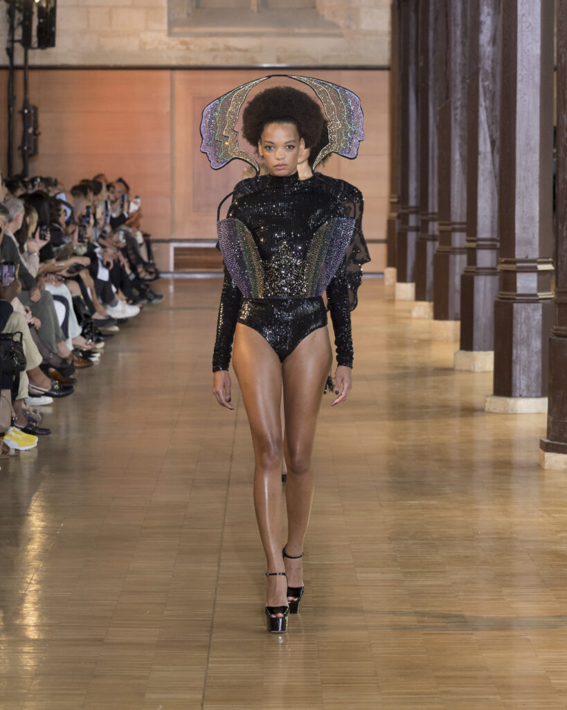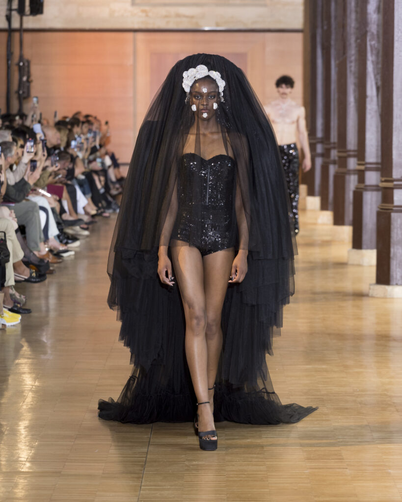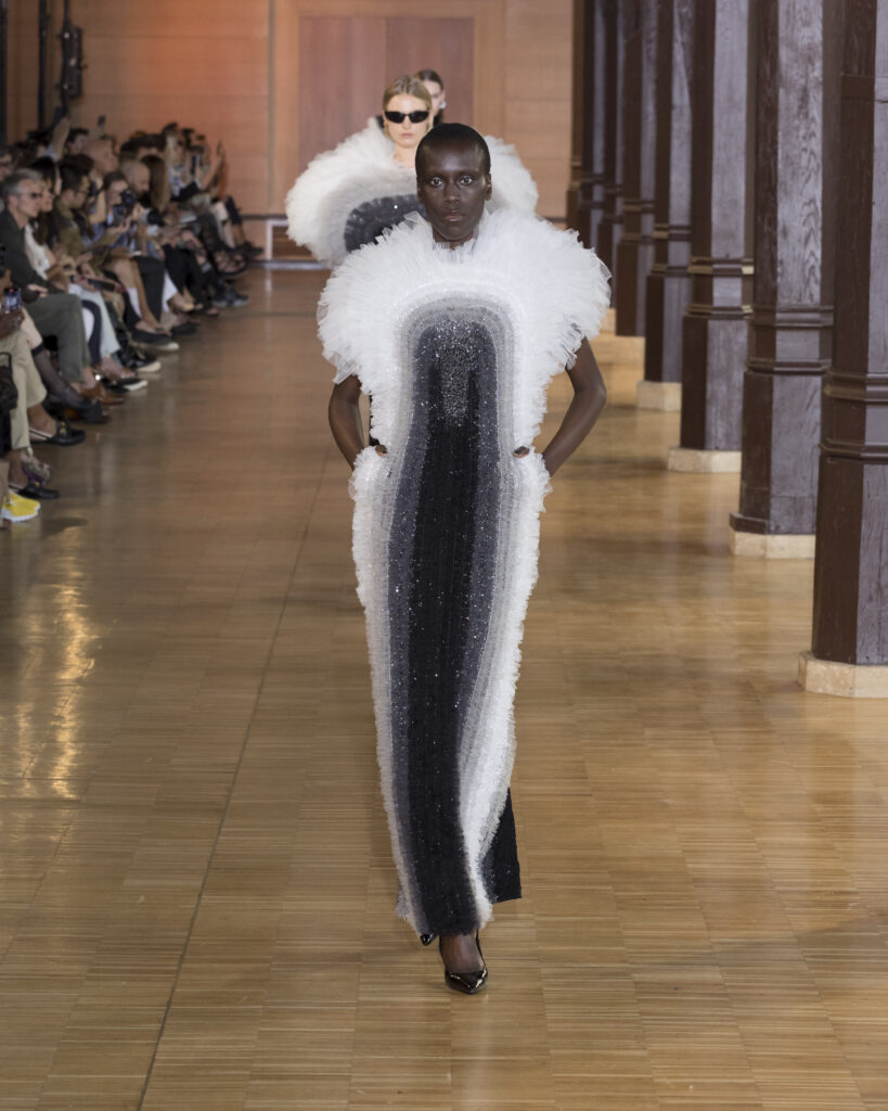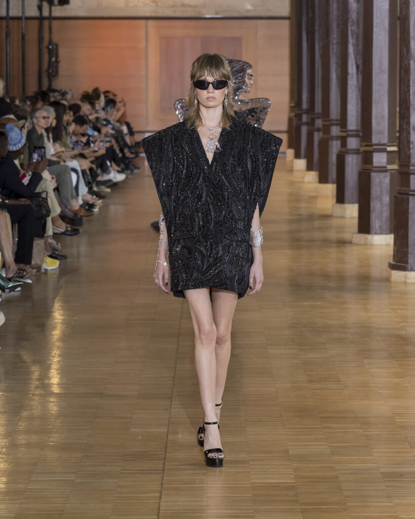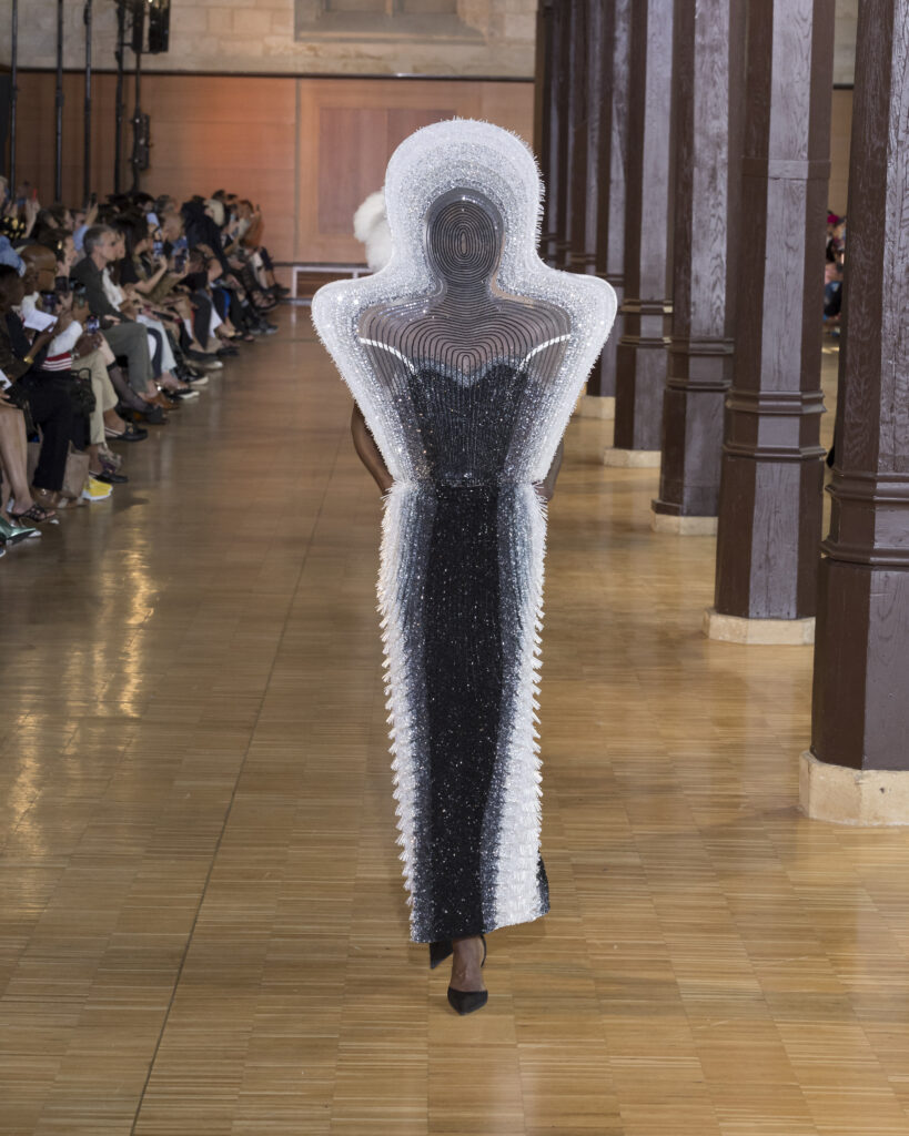 Les teintes profondes de noir et de gris, omniprésentes dans la collection, évoquent l’infinité du cosmos, une toile où la lumière et l’obscurité se rencontrent. Elles symbolisent le mystère et la profondeur de l’aura, cette force invisible mais palpable qui émane des êtres vivants. Les silhouettes, fluides et organiques, sont parsemées de broderies minutieuses, de perles de verre, de sequins et de strass, qui captent la lumière et la rediffusent, comme autant d’éclats de cette énergie primordiale.