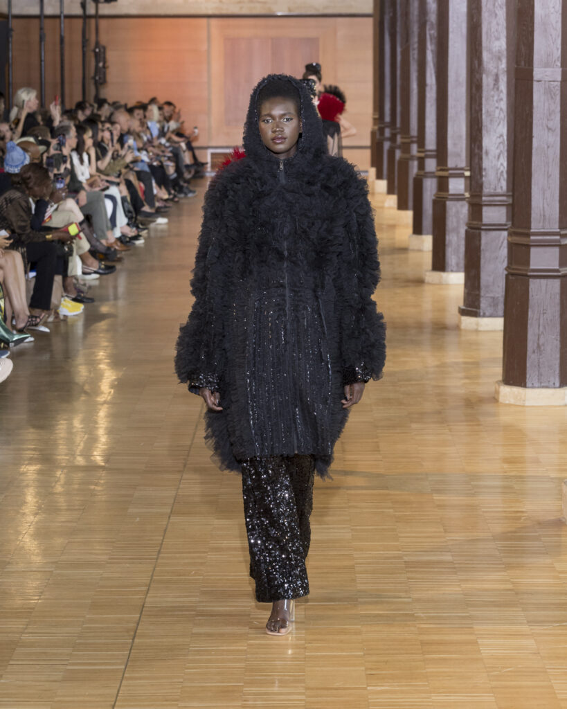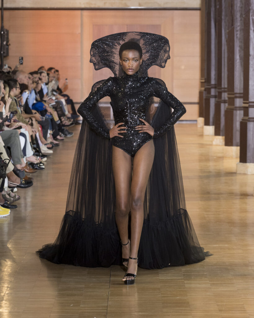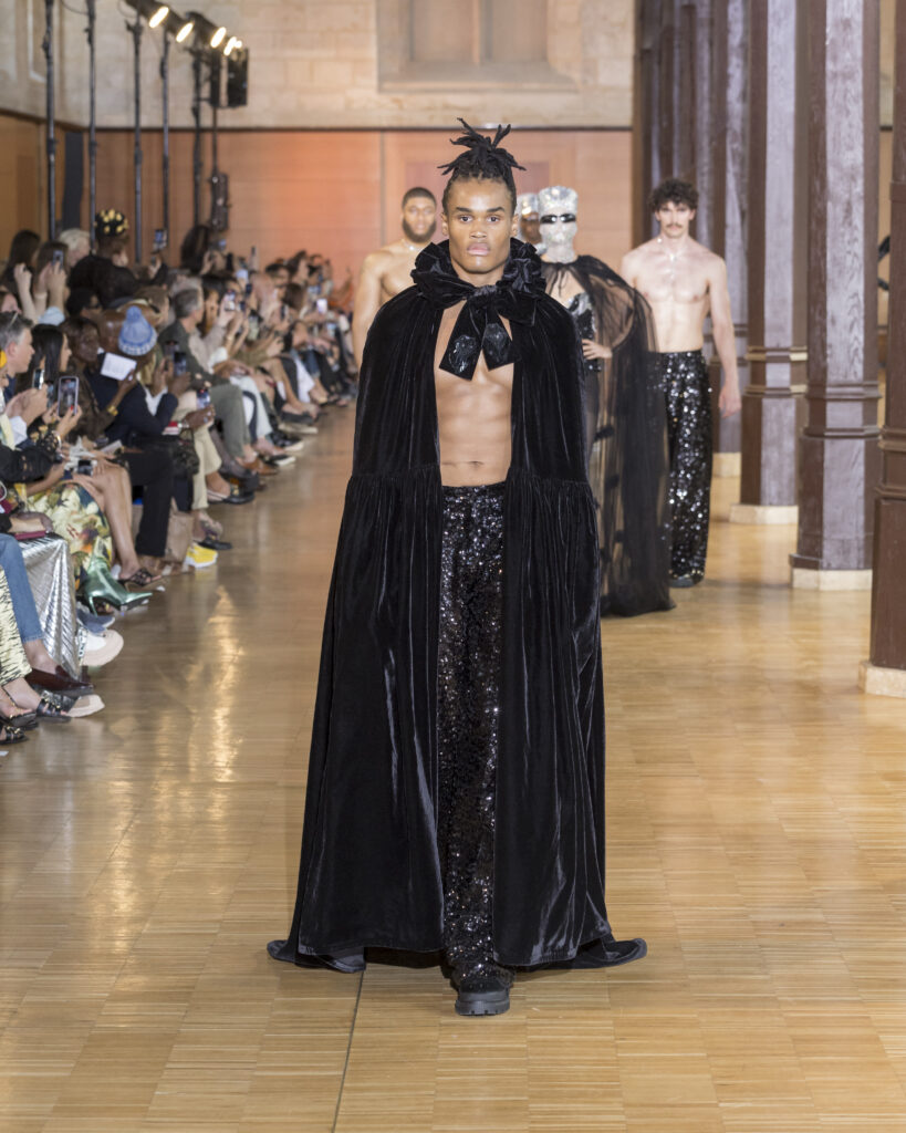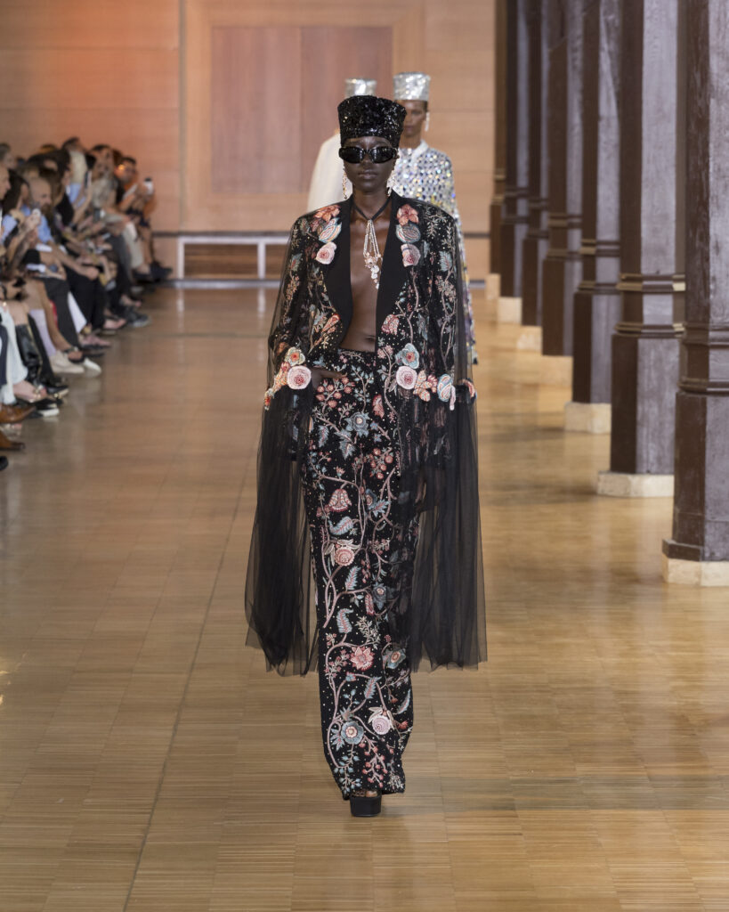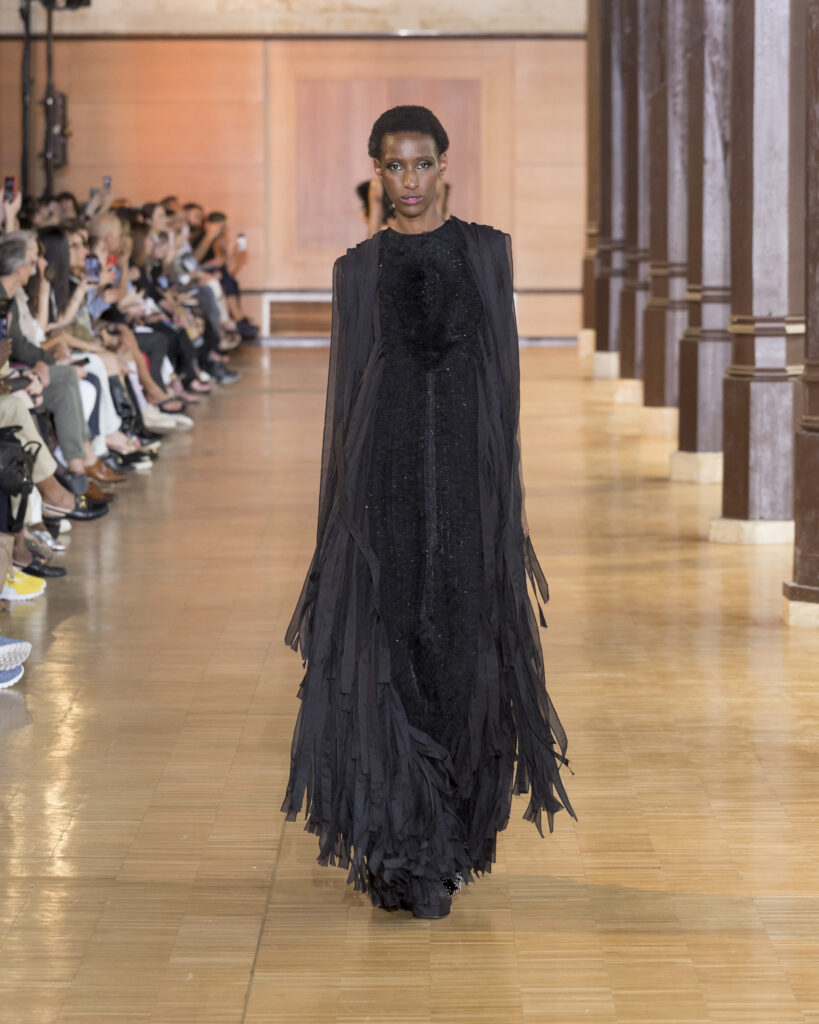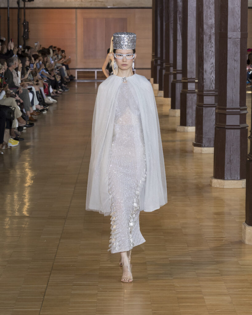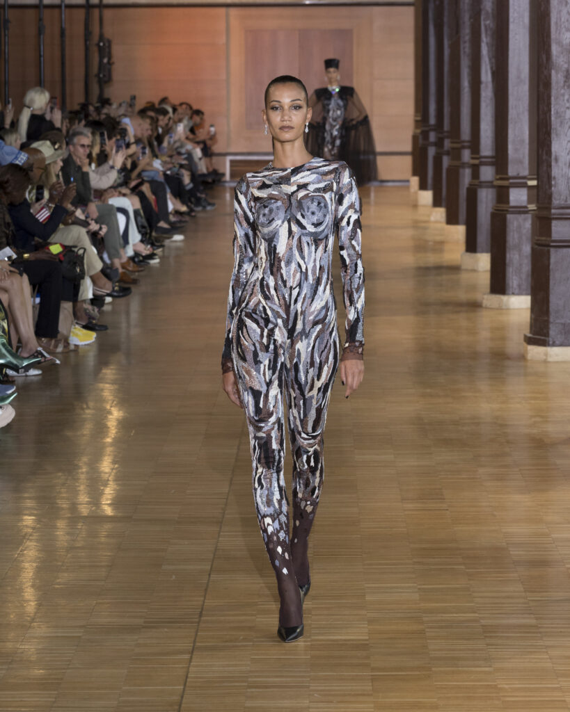 Les teintes profondes de noir et de gris, omniprésentes dans la collection, évoquent l’infinité du cosmos, une toile où la lumière et l’obscurité se rencontrent. Elles symbolisent le mystère et la profondeur de l’aura, cette force invisible mais palpable qui émane des êtres vivants. Les silhouettes, fluides et organiques, sont parsemées de broderies minutieuses, de perles de verre, de sequins et de strass, qui captent la lumière et la rediffusent, comme autant d’éclats de cette énergie primordiale.