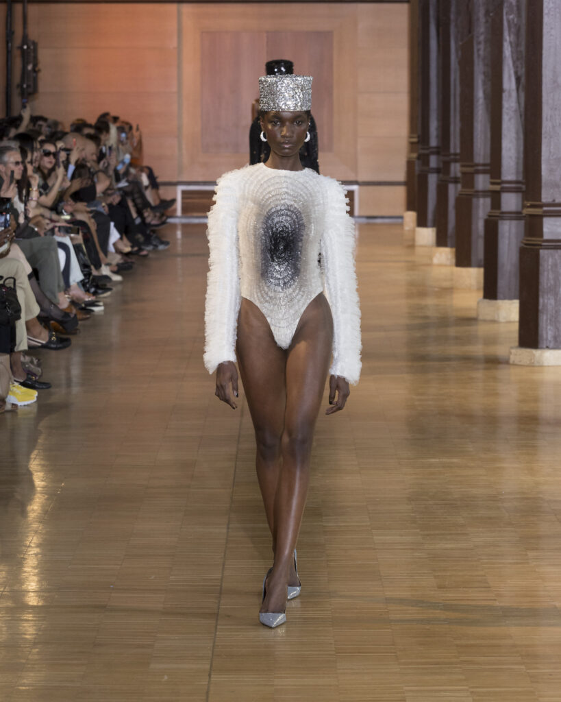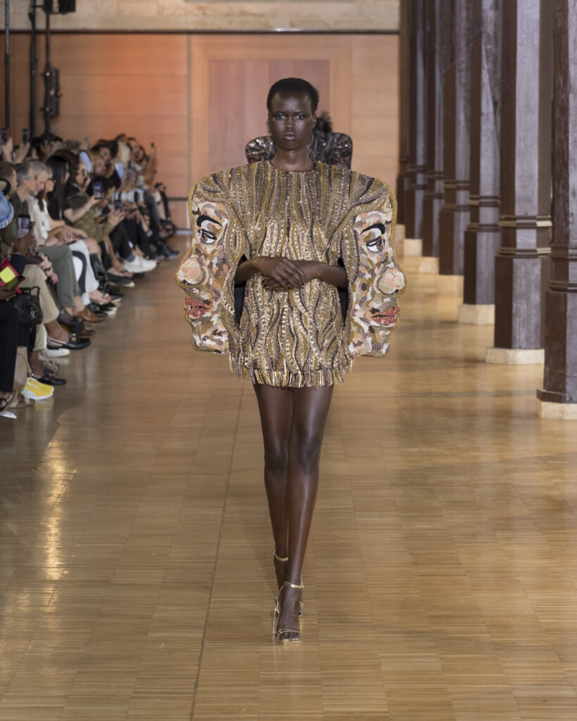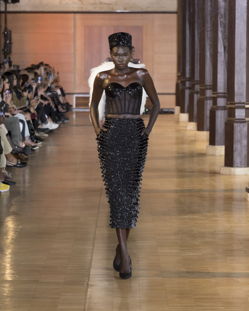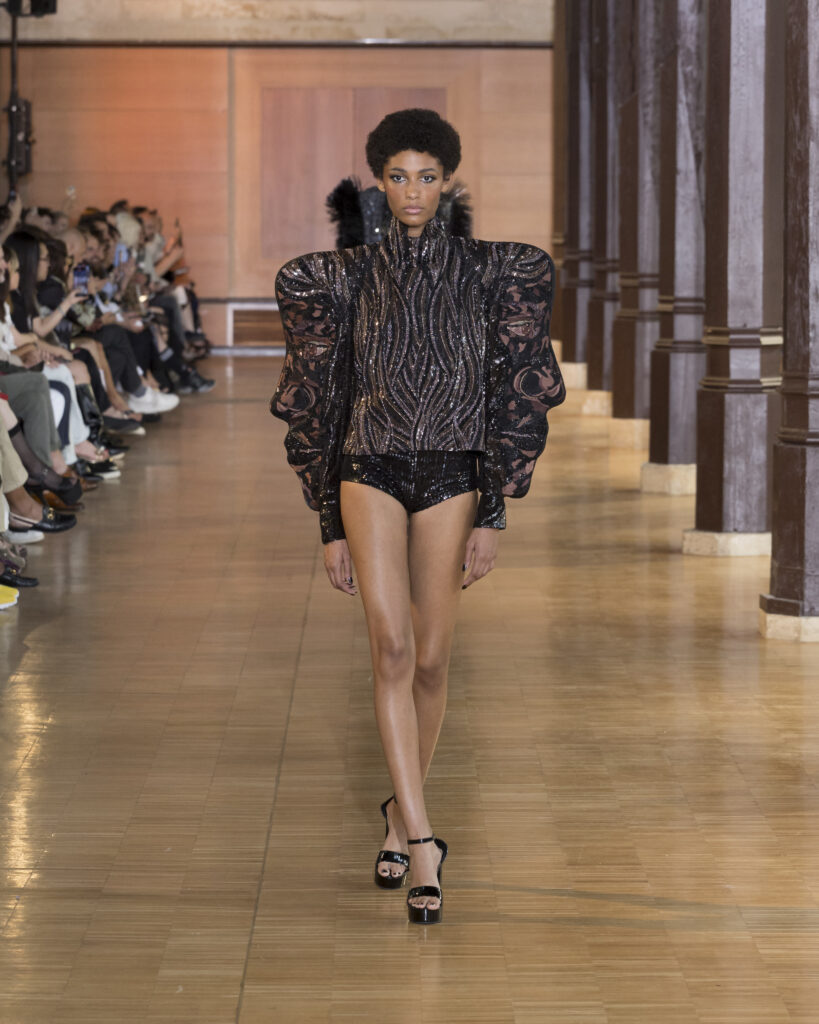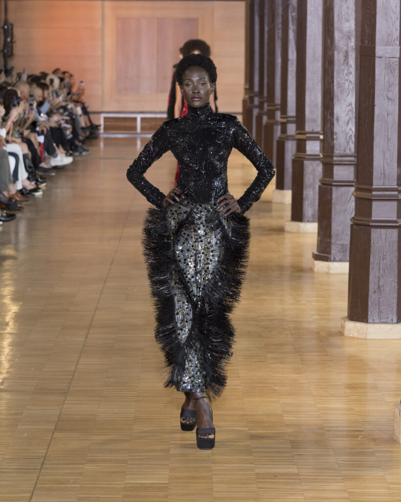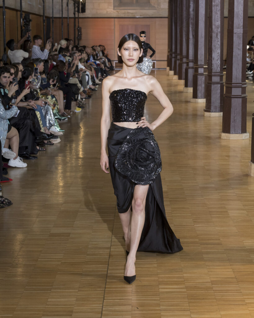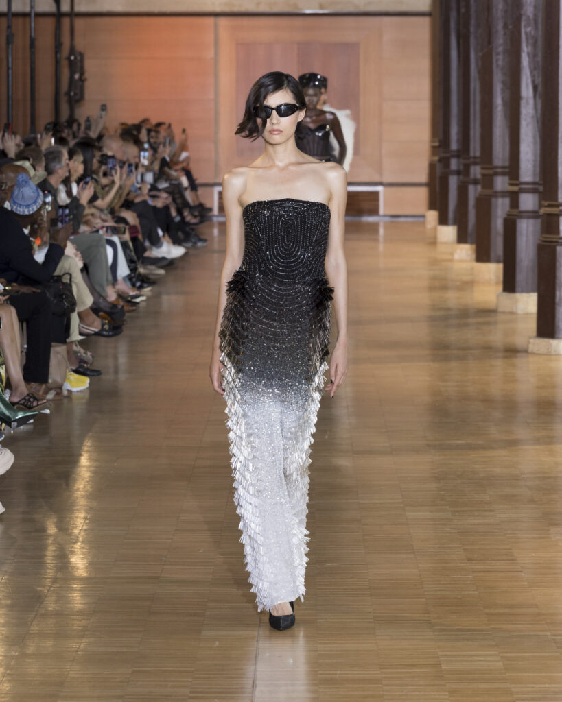 Les teintes profondes de noir et de gris, omniprésentes dans la collection, évoquent l’infinité du cosmos, une toile où la lumière et l’obscurité se rencontrent. Elles symbolisent le mystère et la profondeur de l’aura, cette force invisible mais palpable qui émane des êtres vivants. Les silhouettes, fluides et organiques, sont parsemées de broderies minutieuses, de perles de verre, de sequins et de strass, qui captent la lumière et la rediffusent, comme autant d’éclats de cette énergie primordiale.