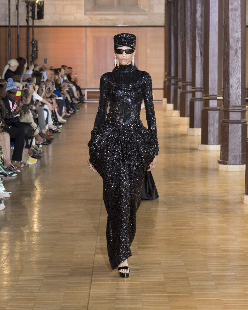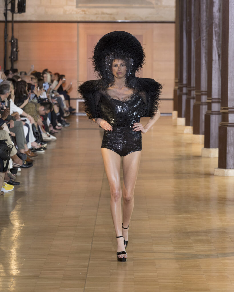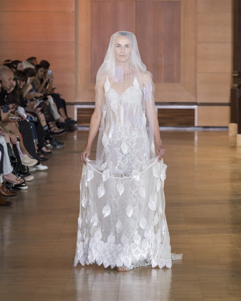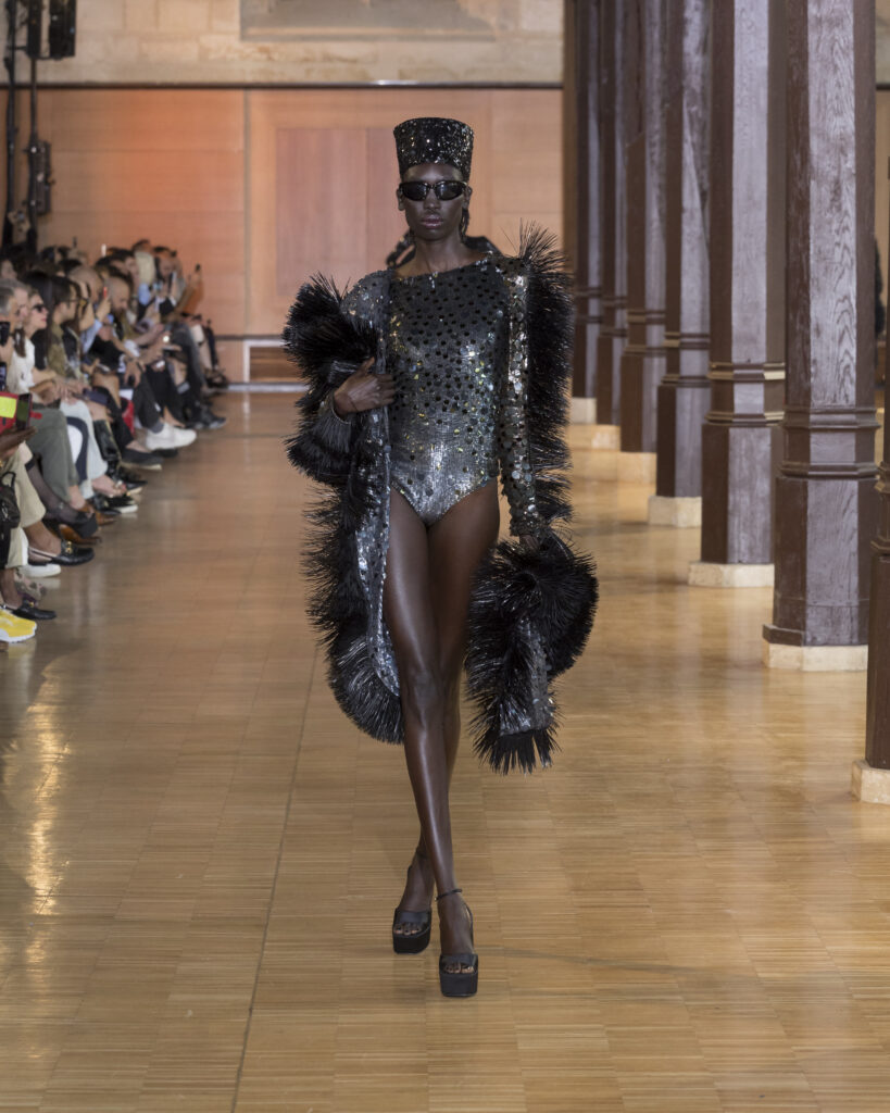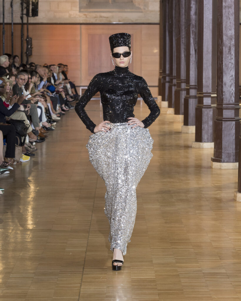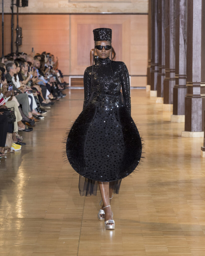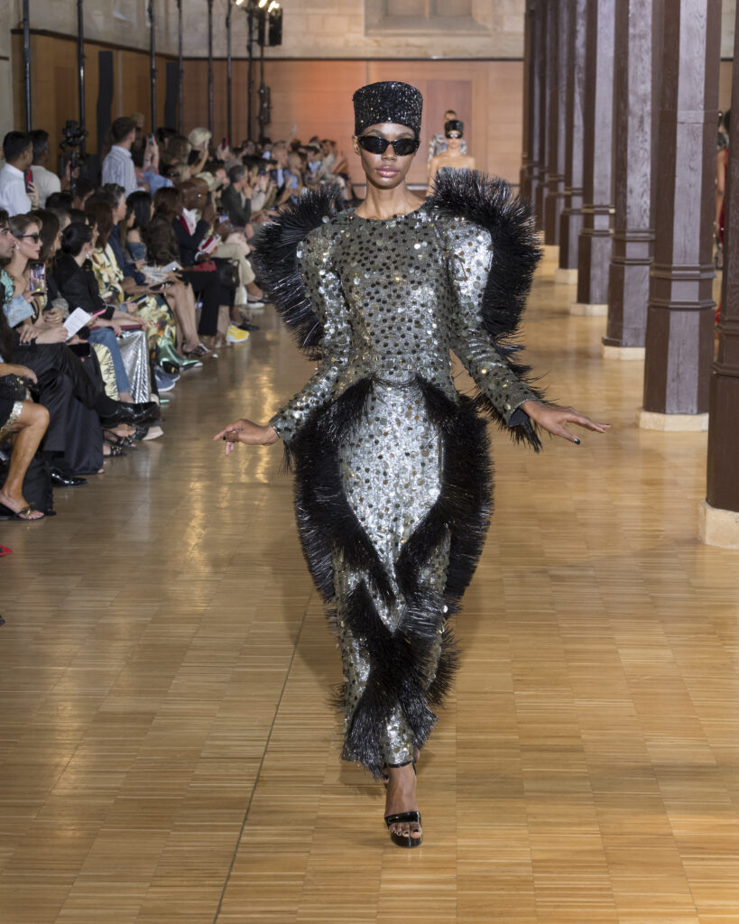 Les teintes profondes de noir et de gris, omniprésentes dans la collection, évoquent l’infinité du cosmos, une toile où la lumière et l’obscurité se rencontrent. Elles symbolisent le mystère et la profondeur de l’aura, cette force invisible mais palpable qui émane des êtres vivants. Les silhouettes, fluides et organiques, sont parsemées de broderies minutieuses, de perles de verre, de sequins et de strass, qui captent la lumière et la rediffusent, comme autant d’éclats de cette énergie primordiale.