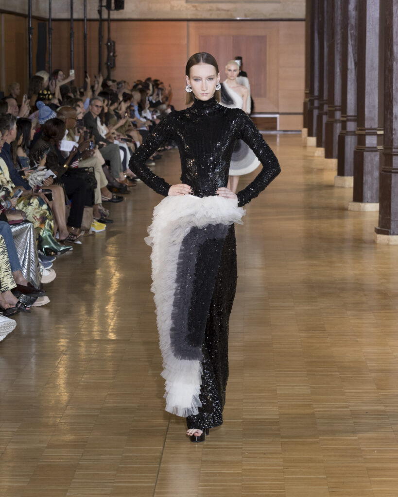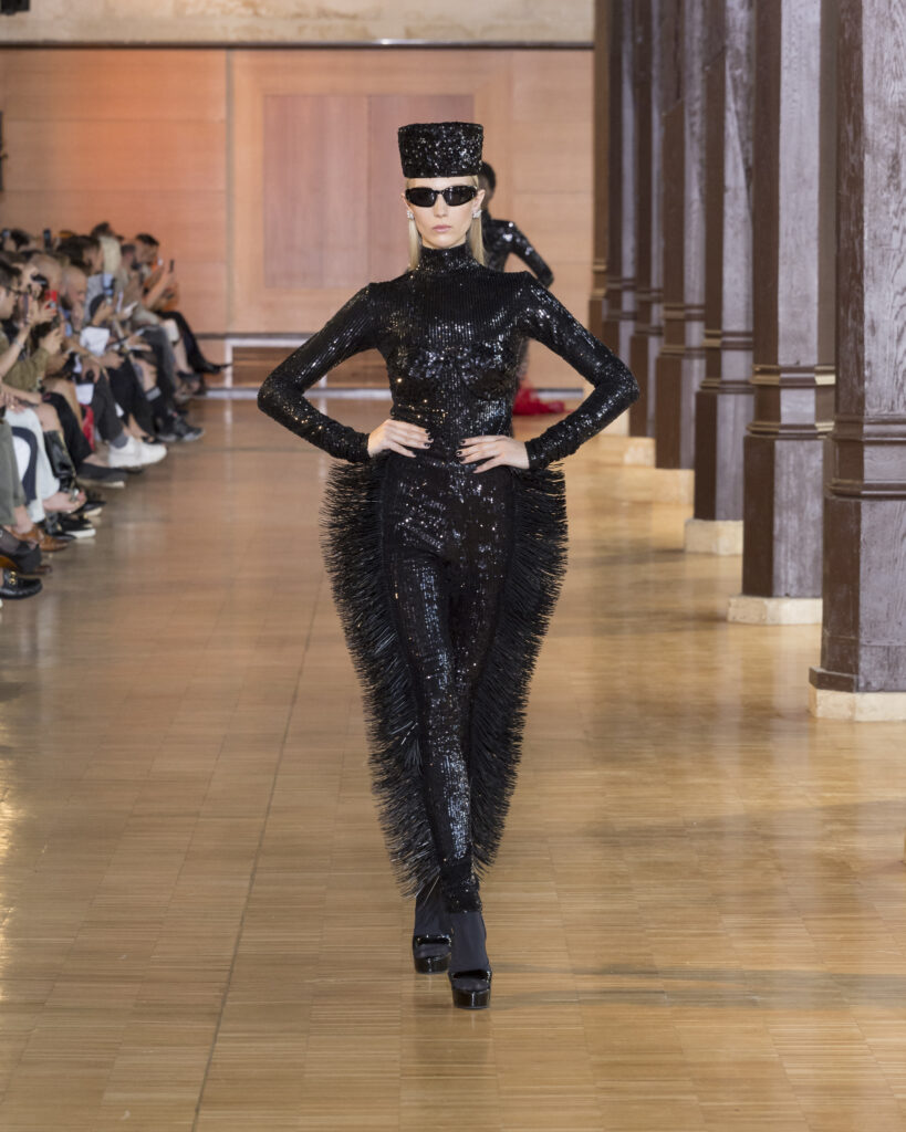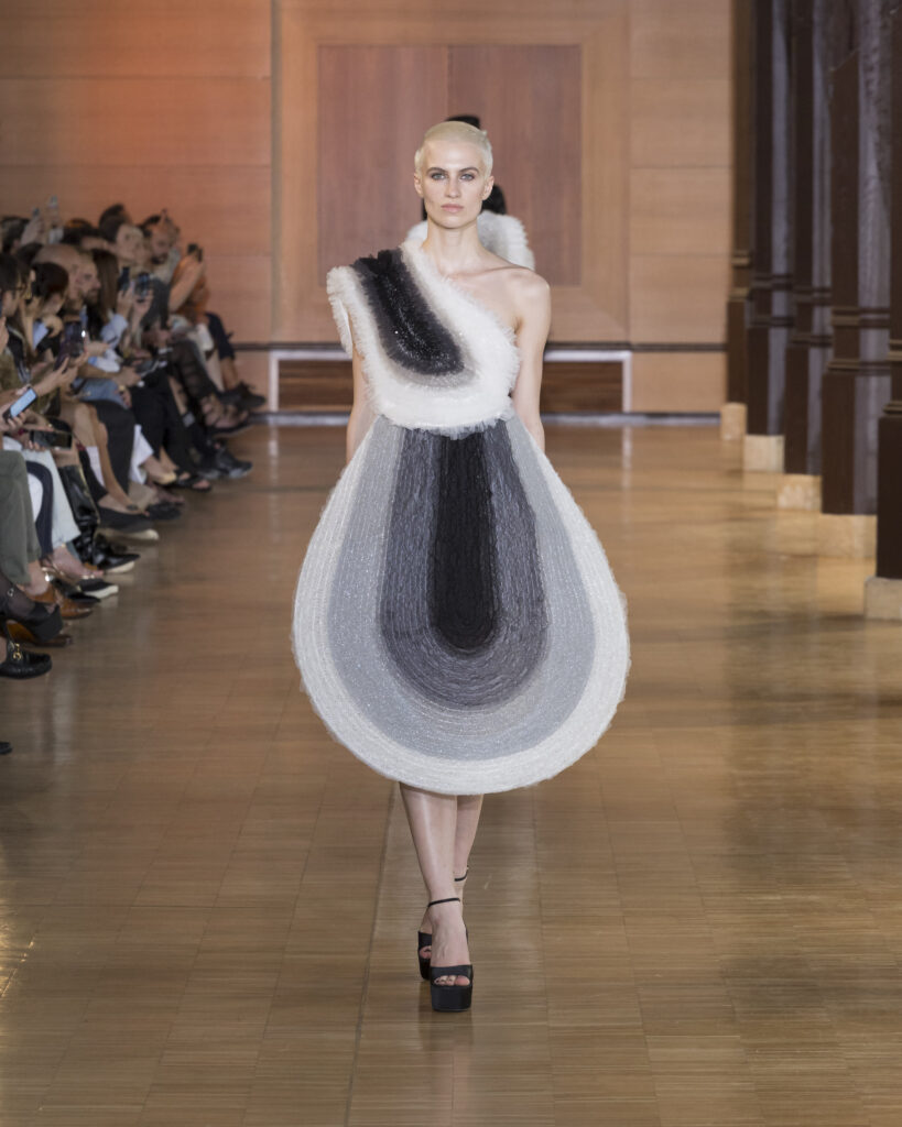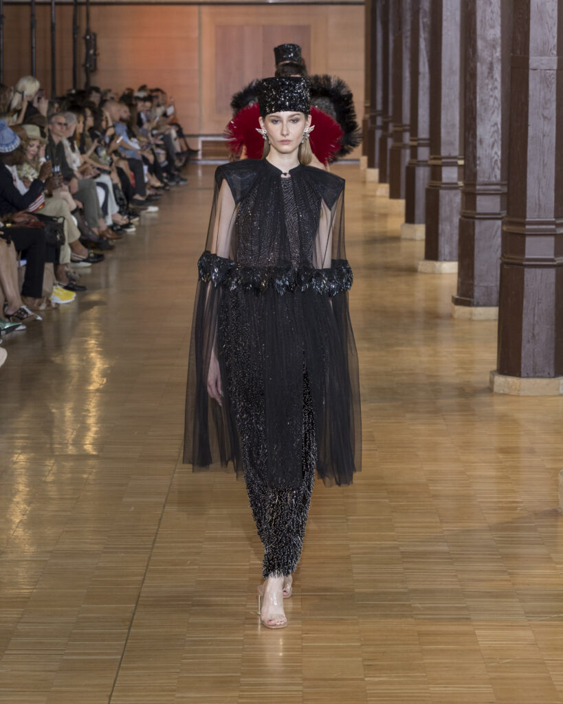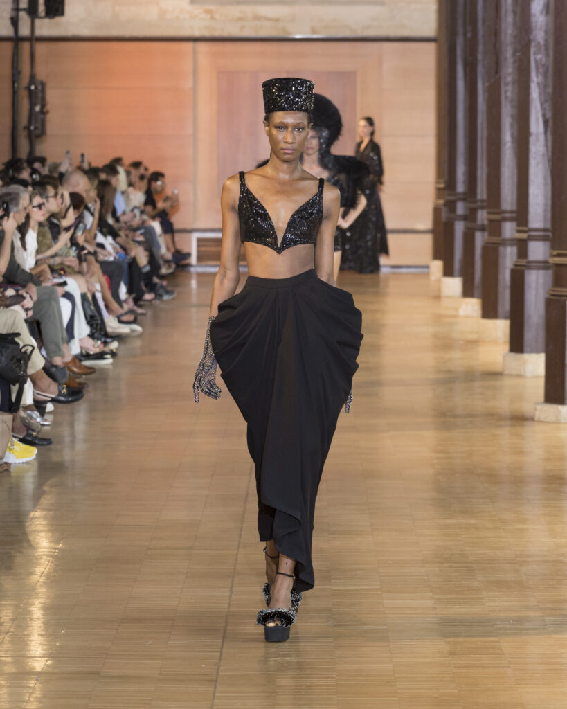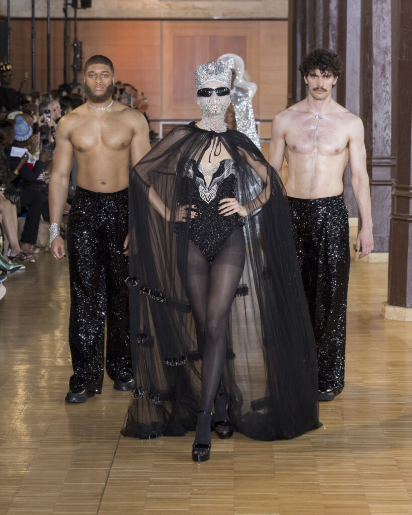Les teintes profondes de noir et de gris, omniprésentes dans la collection, évoquent l’infinité du cosmos, une toile où la lumière et l’obscurité se rencontrent. Elles symbolisent le mystère et la profondeur de l’aura, cette force invisible mais palpable qui émane des êtres vivants. Les silhouettes, fluides et organiques, sont parsemées de broderies minutieuses, de perles de verre, de sequins et de strass, qui captent la lumière et la rediffusent, comme autant d’éclats de cette énergie primordiale.