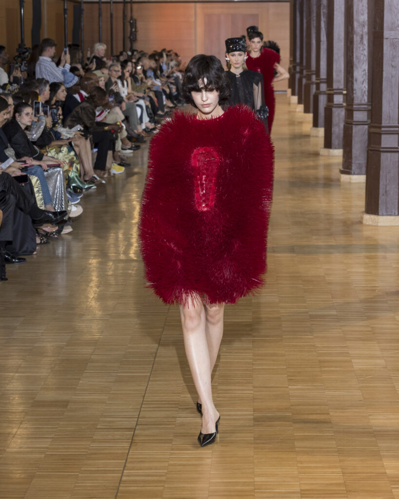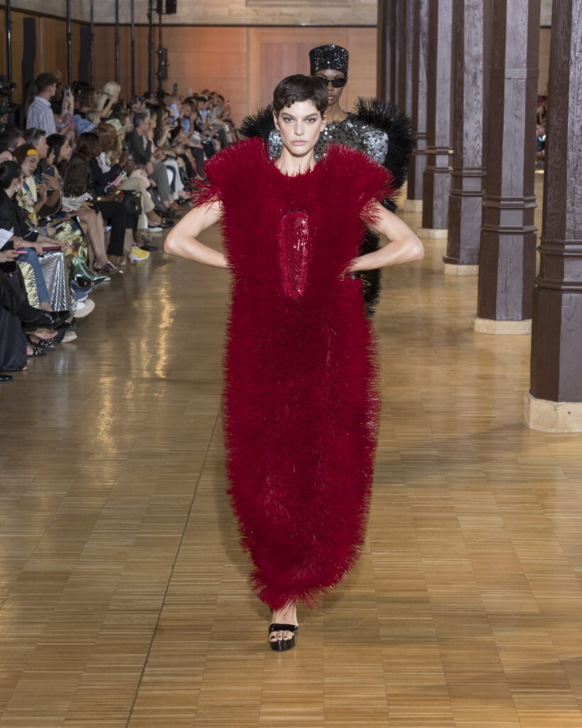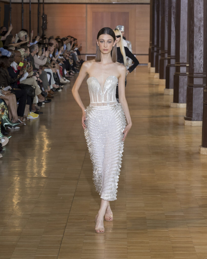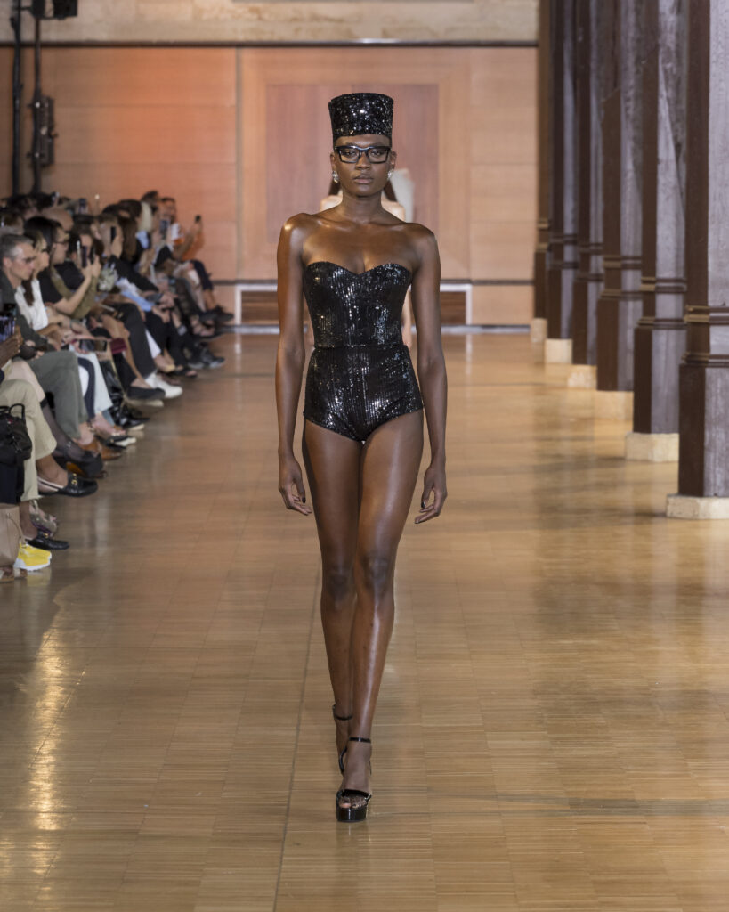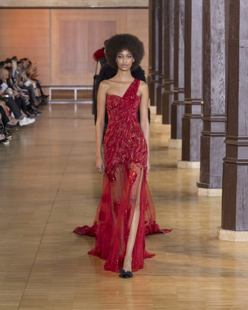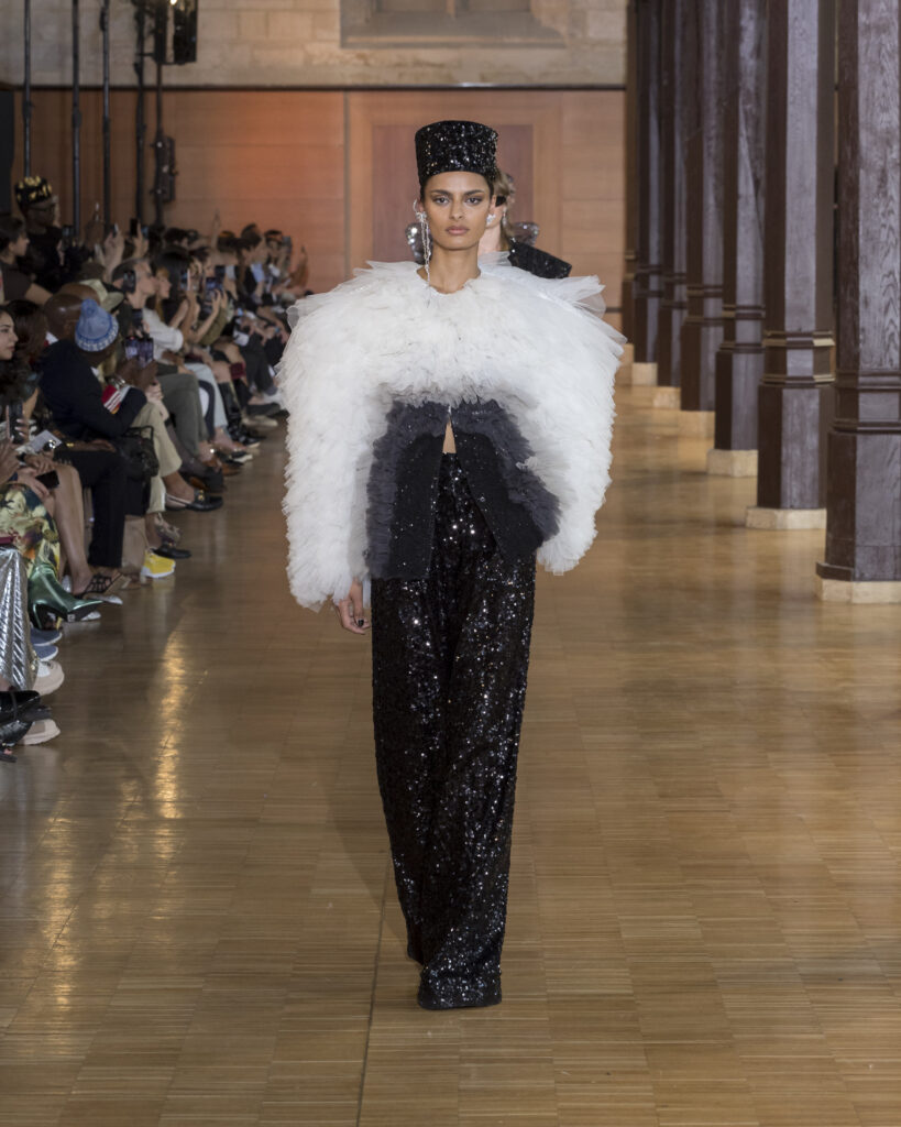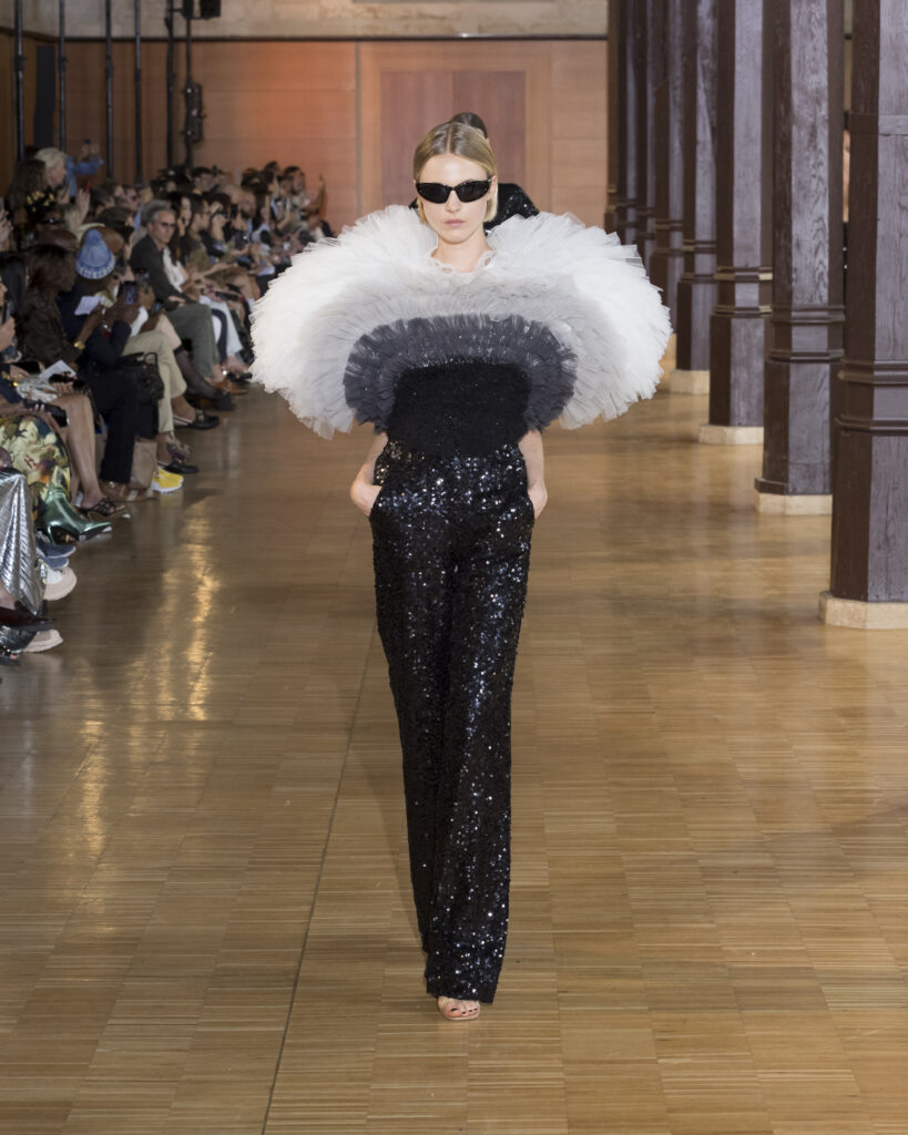 Les teintes profondes de noir et de gris, omniprésentes dans la collection, évoquent l’infinité du cosmos, une toile où la lumière et l’obscurité se rencontrent. Elles symbolisent le mystère et la profondeur de l’aura, cette force invisible mais palpable qui émane des êtres vivants. Les silhouettes, fluides et organiques, sont parsemées de broderies minutieuses, de perles de verre, de sequins et de strass, qui captent la lumière et la rediffusent, comme autant d’éclats de cette énergie primordiale.