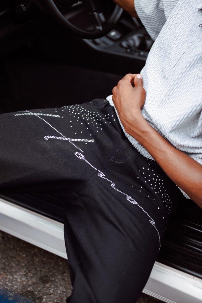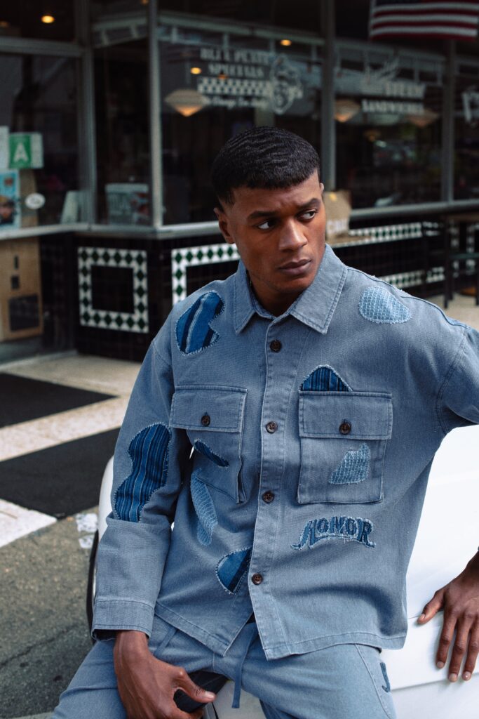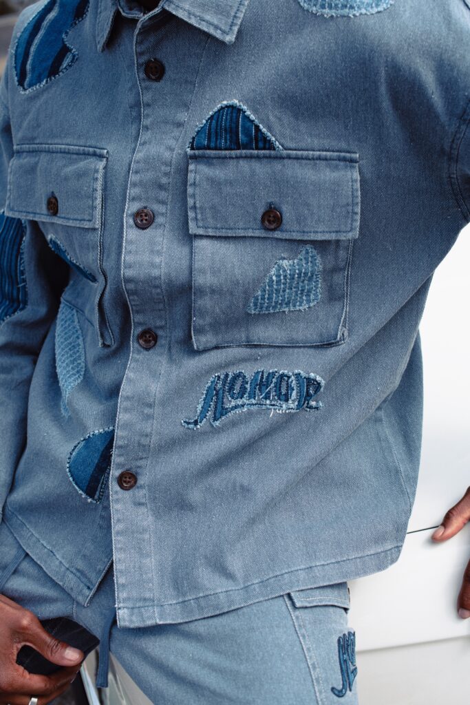 Les motifs en patchwork indigo multicolores, déjà aperçus dans la collection Printemps-Été 2024, font leur retour, mais cette fois-ci avec des améliorations notables. Les motifs imprimés sur denim, ornés de strass et d’accents graphiques, captivent l’attention tout en évoquant une imagerie profondément ancrée dans le streetwear des années 90. L’ajout de détails subtils, comme les passepoils contrastants sur les manches et les rayures personnalisées en fil sur les chemises à col cubain, renforce l’authenticité de chaque pièce.