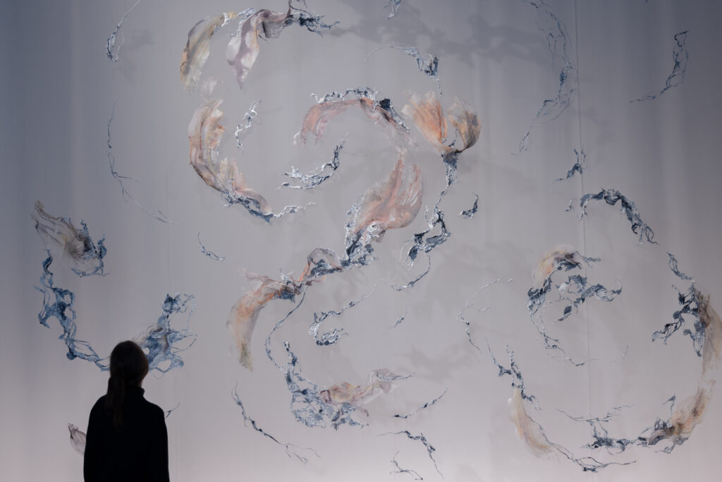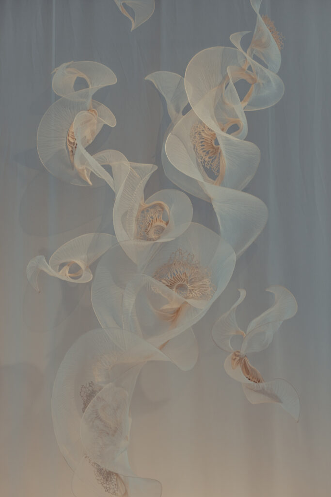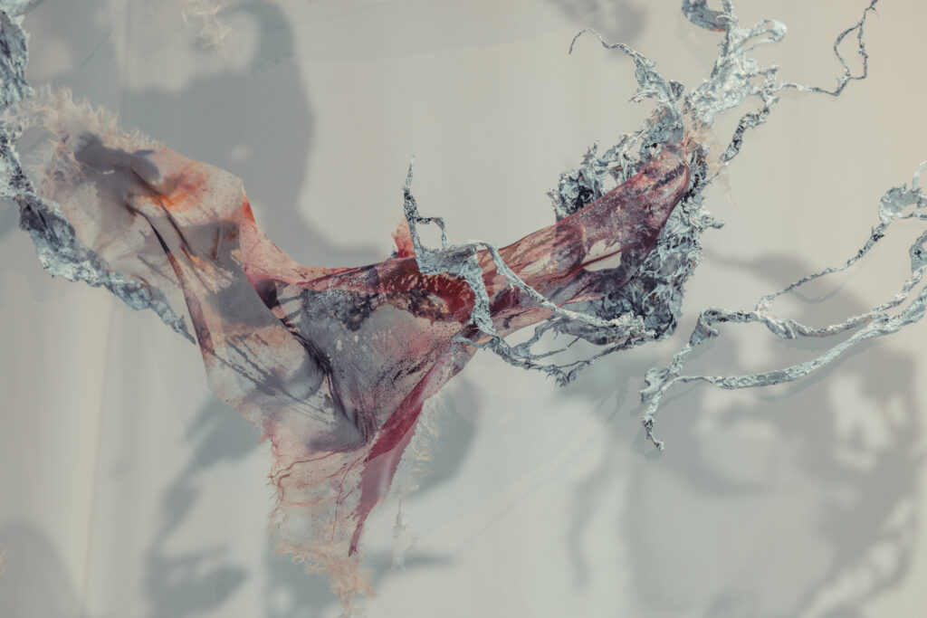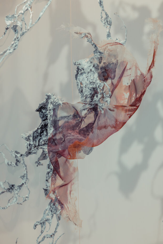 Les œuvres, dont les plus imposantes, Weightlessness of the Unknown et Embers of the Mind, révèlent la vision intérieure de l’artiste à travers des formes ambivalentes évoquant le renouvellement et la destruction. En parallèle, les fragments de soie peinte, cousus main sur une base de tulle, créent des compositions cycloniques, tandis que les textures riches et volcaniques rappellent l’impasto dense des peintures gestuelles de Kazuo Shiraga. L’influence des expressionnistes abstraits comme Joan Mitchell ou encore des ambiances oniriques et inquiétantes de Jérôme Bosch se fait sentir dans ces créations aériennes.