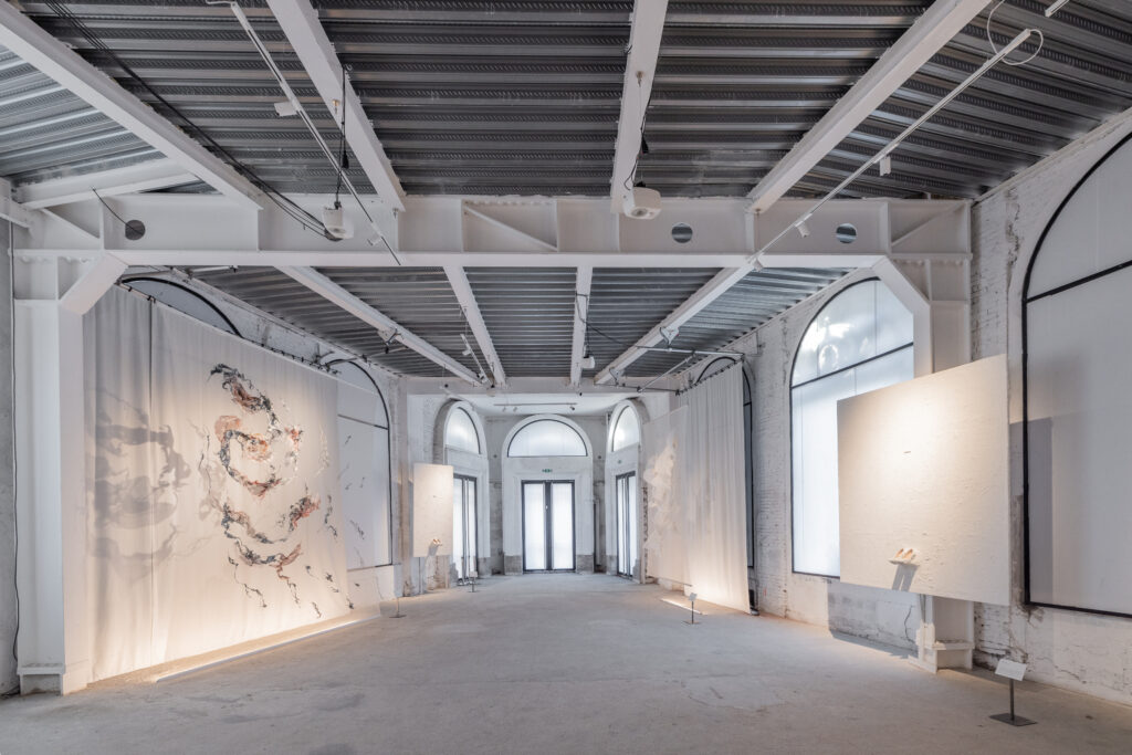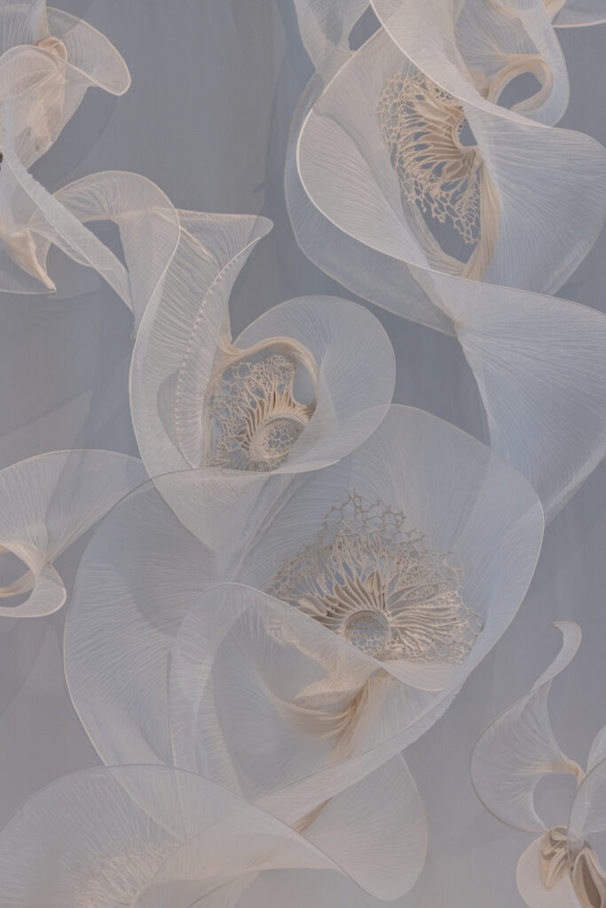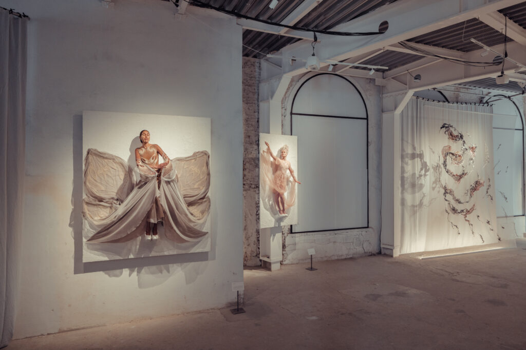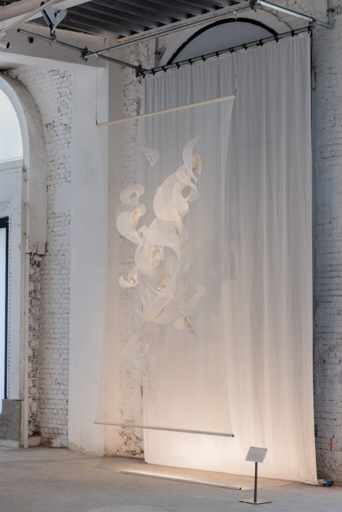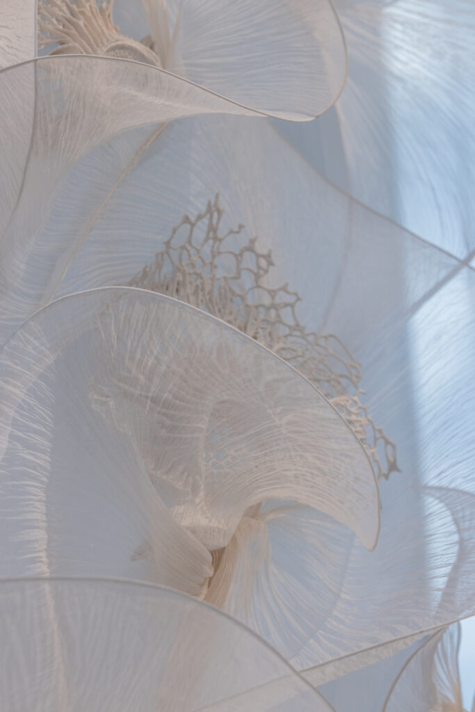 Les œuvres, dont les plus imposantes, Weightlessness of the Unknown et Embers of the Mind, révèlent la vision intérieure de l’artiste à travers des formes ambivalentes évoquant le renouvellement et la destruction. En parallèle, les fragments de soie peinte, cousus main sur une base de tulle, créent des compositions cycloniques, tandis que les textures riches et volcaniques rappellent l’impasto dense des peintures gestuelles de Kazuo Shiraga. L’influence des expressionnistes abstraits comme Joan Mitchell ou encore des ambiances oniriques et inquiétantes de Jérôme Bosch se fait sentir dans ces créations aériennes.