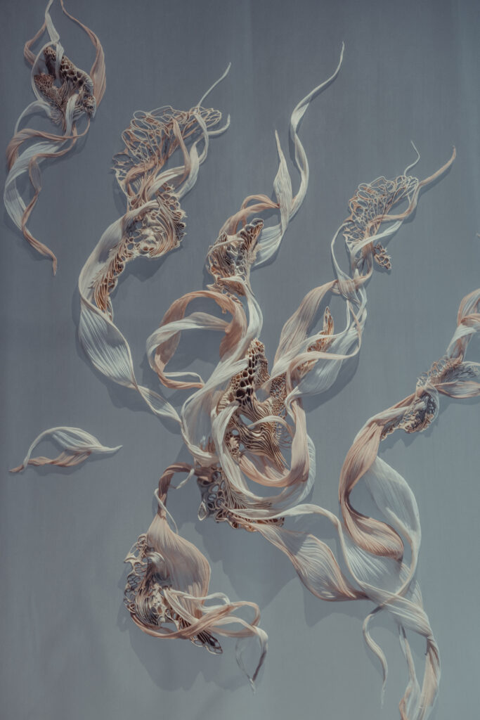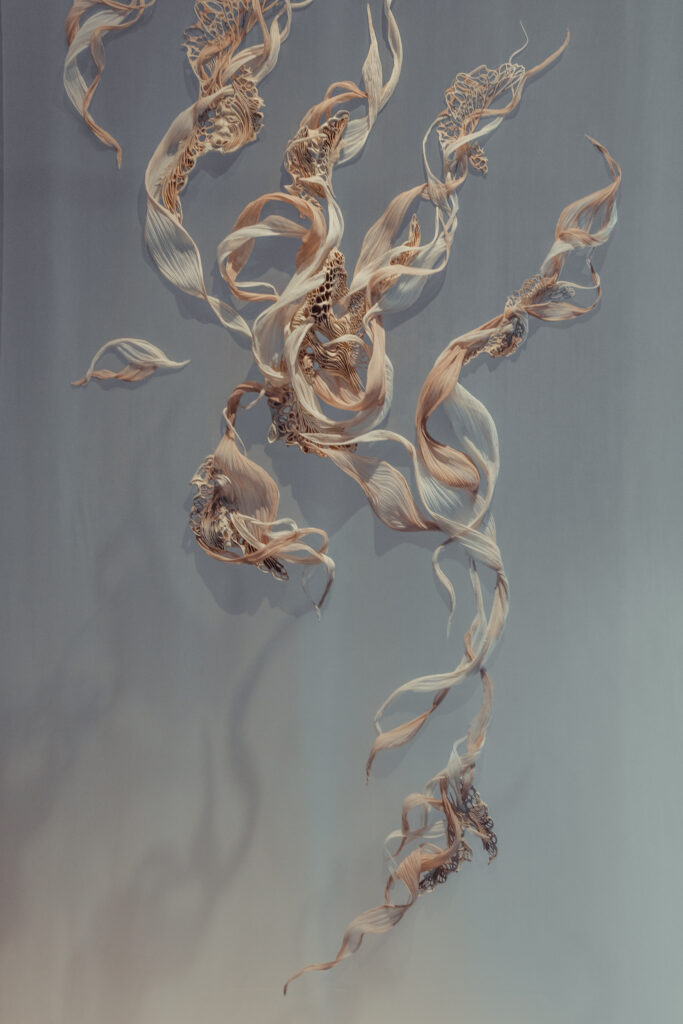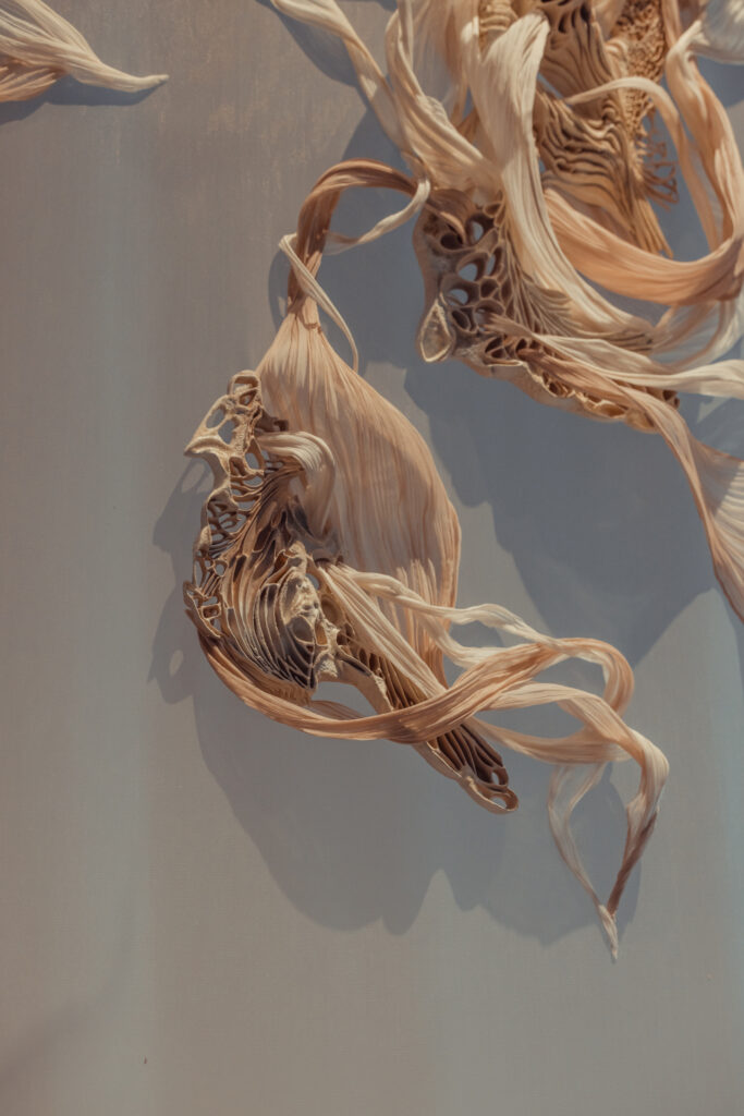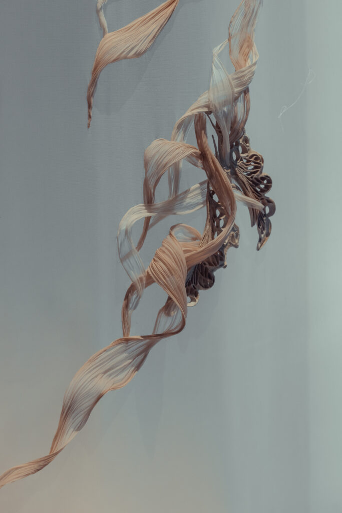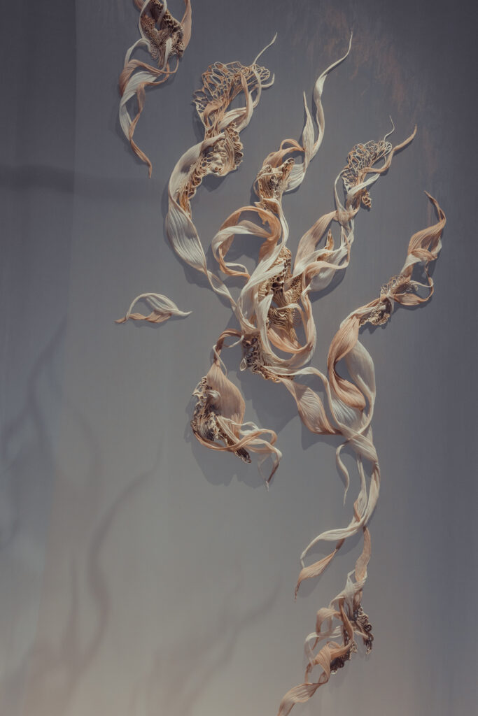 Les sculptures de van Herpen, réalisées sur une année entière, célèbrent non seulement son retour à la nature, mais aussi la liberté immense qu’elle a retrouvée en ralentissant son processus créatif. Ces œuvres capturent le chaos et la beauté de l’idéation, symbolisant la catharsis que l’artiste vit à travers son travail minutieux. « C’est dans cette phase de libération, où l’on se dégage de la contrainte temporelle, qu’une forme de transcendance se matérialise », explique van Herpen.