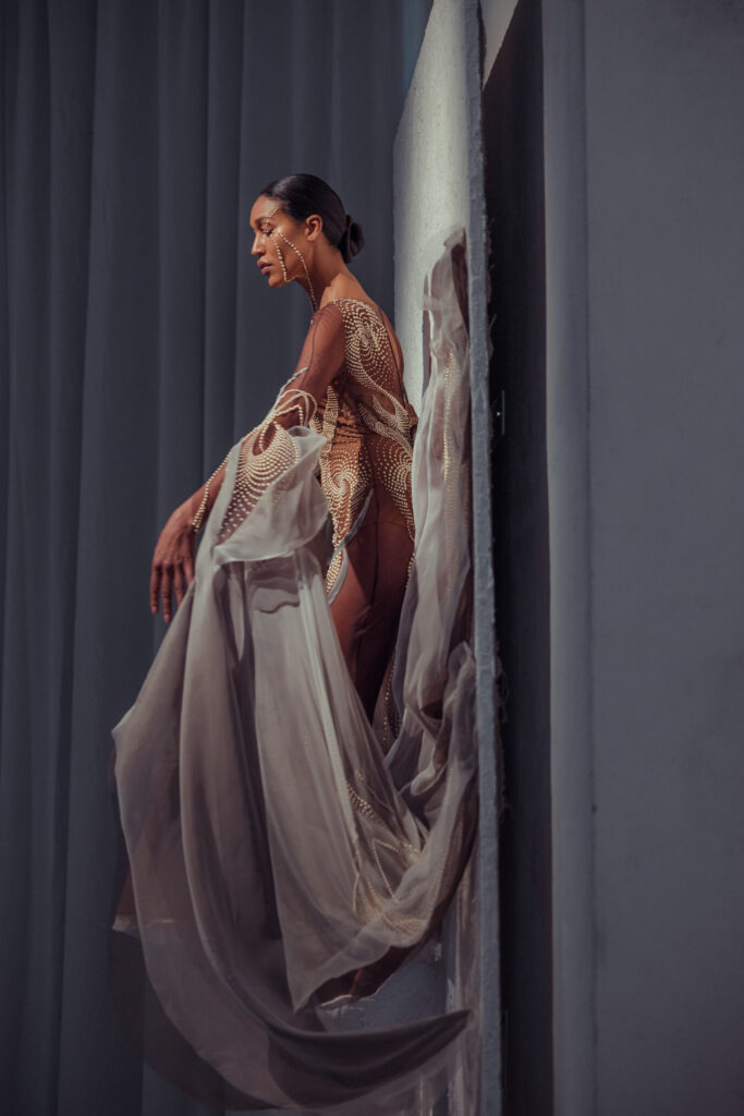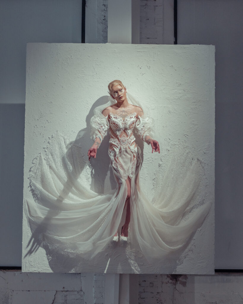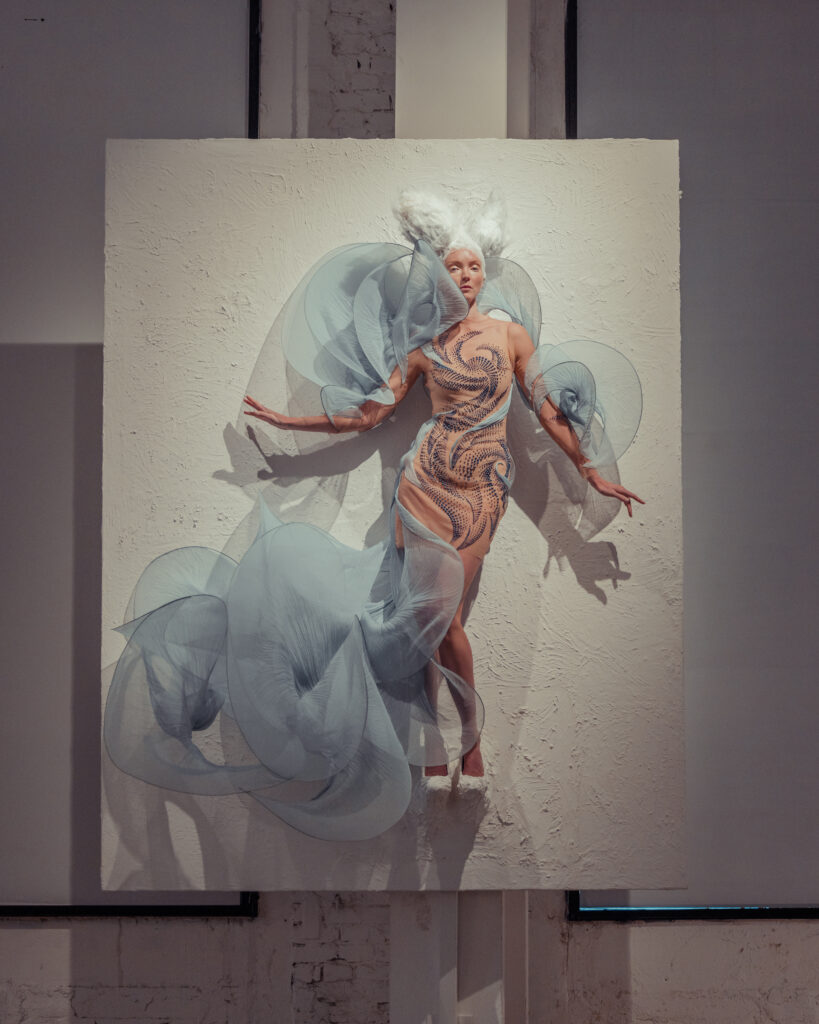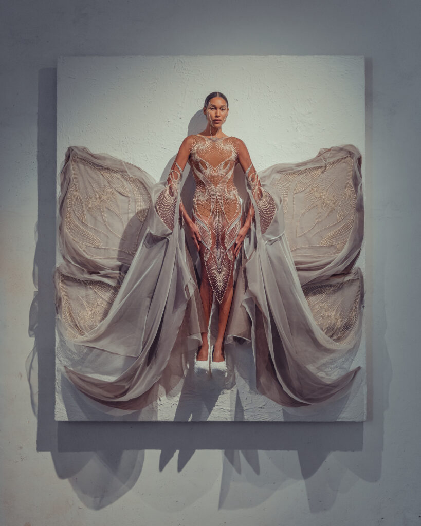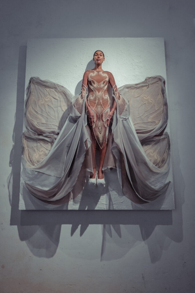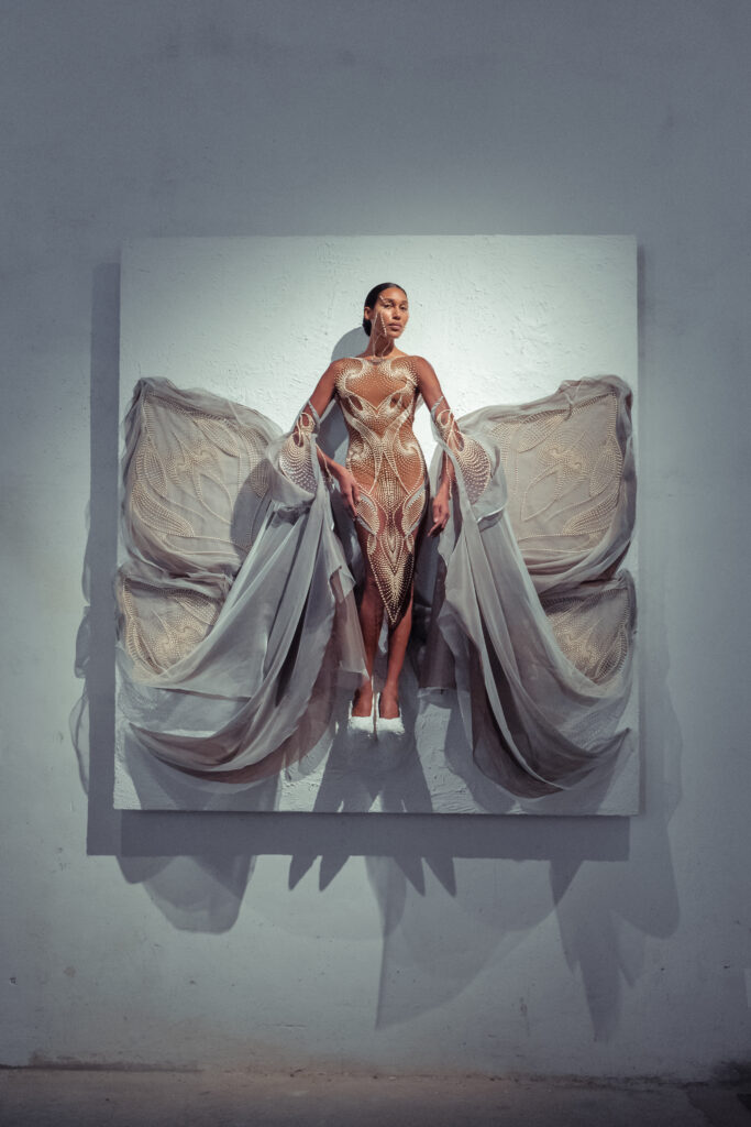 Pour van Herpen, l’extension naturelle de sa pratique se traduit par une exploration des formes tridimensionnelles, allant au-delà des tissus et des textiles pour toucher à l’univers de la sculpture. La créatrice perçoit ses processus de moulage – cette technique de drapage directement sur le mannequin – comme une forme de sculpture, une discipline qui, pour elle, est intrinsèquement liée à l’Haute Couture. « Même si l’on distingue la ‘Haute Couture’ de l’art, pour moi, c’est un univers unique », confie-t-elle.