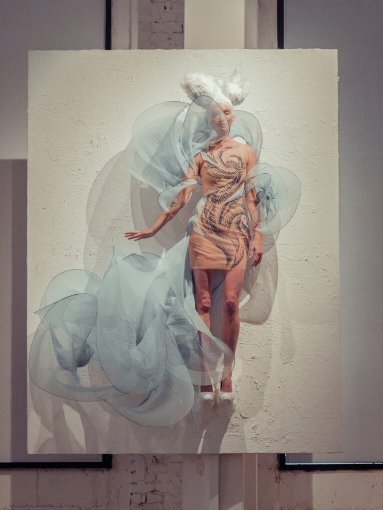 Van Herpen a toujours été une pionnière dans l’intégration de nouvelles technologies dans son processus de création. Les robes Umwelt et Aeromorphosis, qui se distinguent par un subtil dégradé de perles évoquant les compositions cycloniques de ses sculptures, ou encore la robe transparente Ataraxy, sculptée à l’aide d’un pistolet à chaleur, sont autant de preuves de cette innovation incessante. Avec la robe Sensorium, composée de tissu obi provenant de sa collection de kimonos, van Herpen rend hommage à l’artisanat japonais, à la précision et à la spiritualité qui imprègnent la vie quotidienne au Japon.