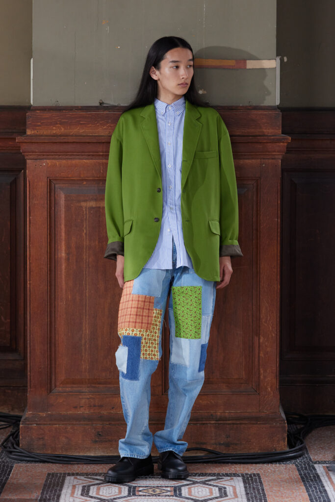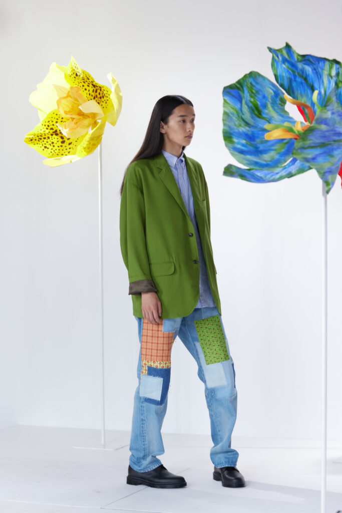 La collection Shunkashuutou est fortement inspirée des imprimés et textiles japonais anciens, reflétant un souci de préserver l’artisanat traditionnel tout en le réinterprétant de manière contemporaine. Yuki Yagi a collaboré avec un propriétaire de boutique vintage japonaise pour intégrer des tissus de deadstock, créant des pièces de patchwork uniques. Cette approche a permis de marier l’héritage japonais avec des silhouettes modernes et décontractées, tout en respectant un ajustement dual-gender.