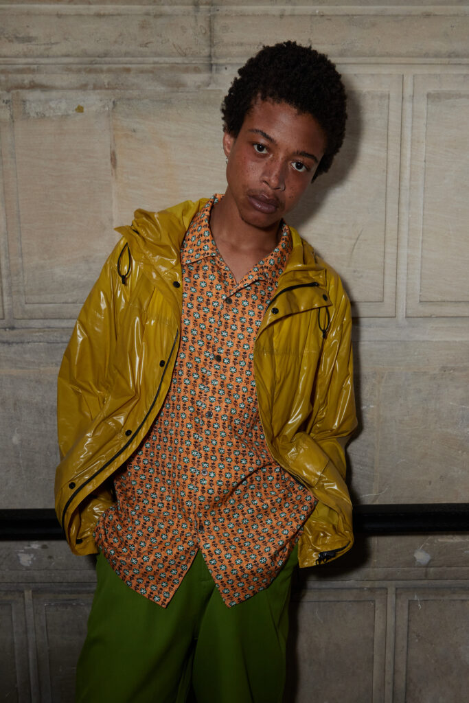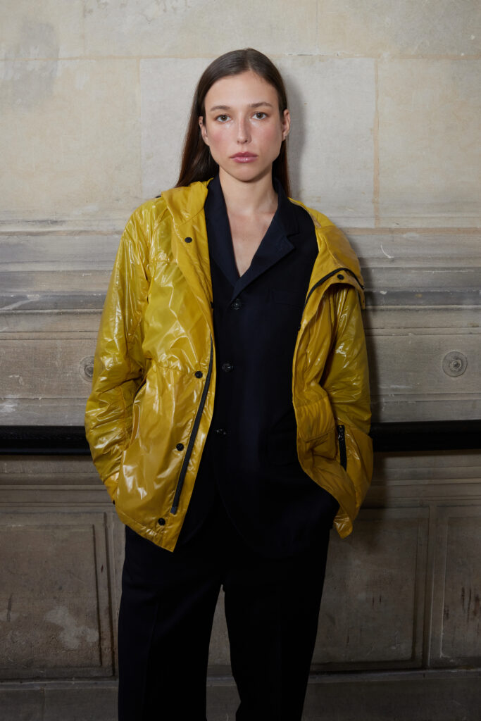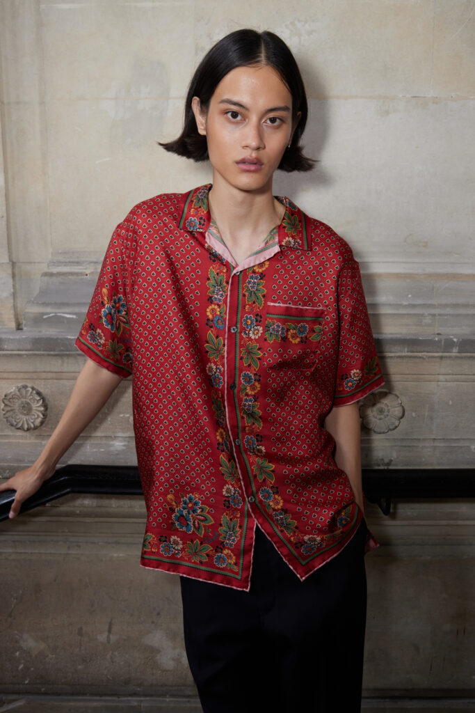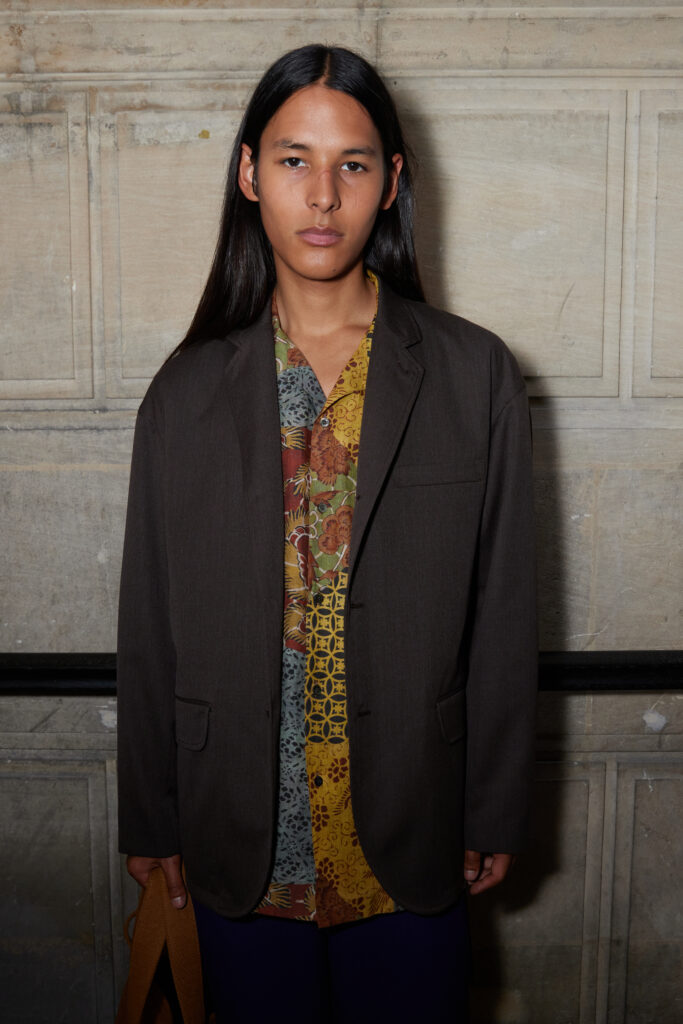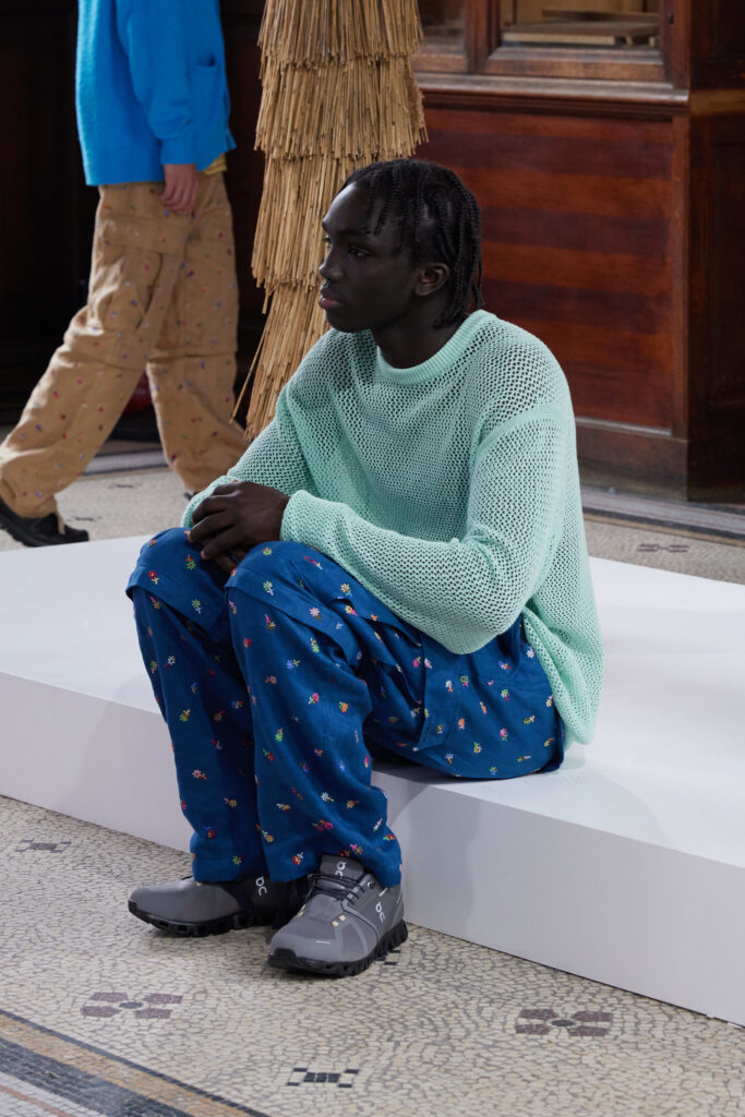 Le décor de printemps, conçu par Nikki Lavollay, présentait des fleurs surdimensionnées, peintes à la main par Margaux Dereume, ajoutant une touche poétique à la scène. Cette approche immersive reflétait l’engagement de Yagi à fusionner l’art et la mode tout en explorant la fluidité des saisons.