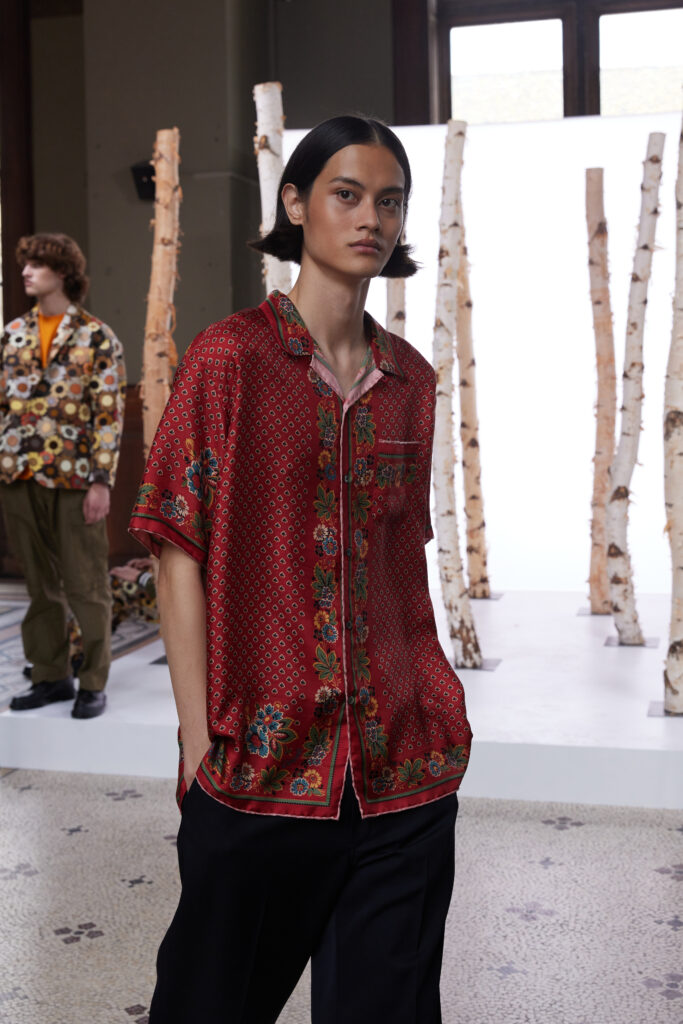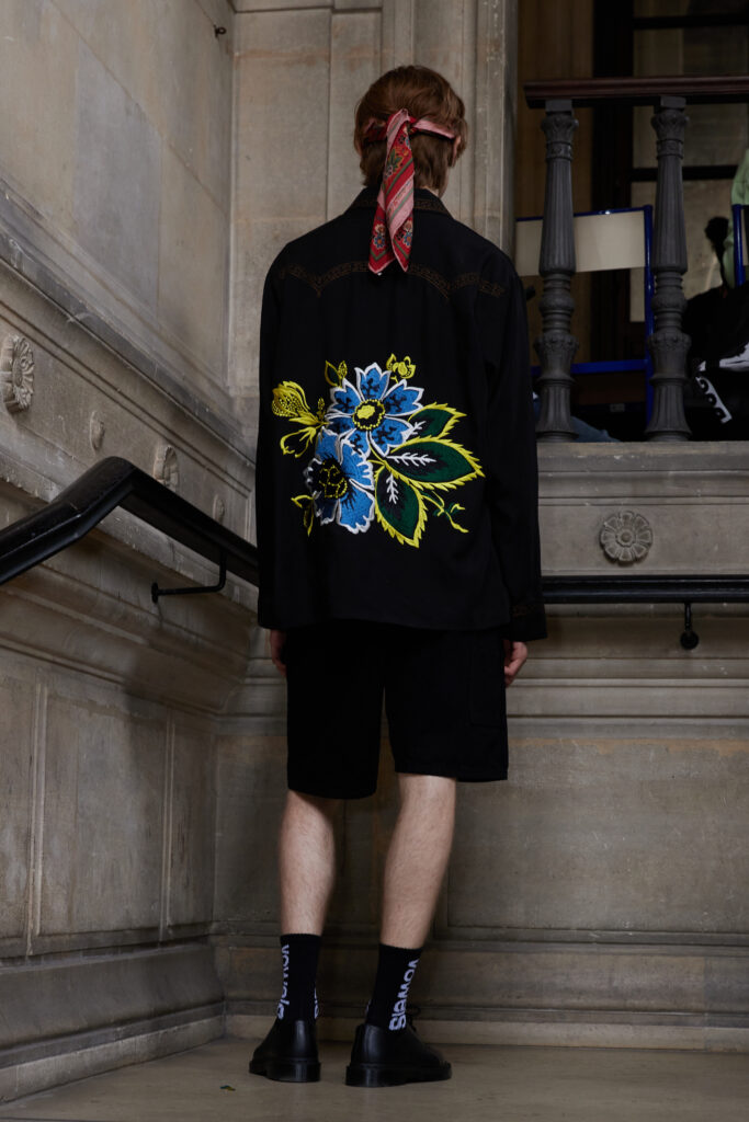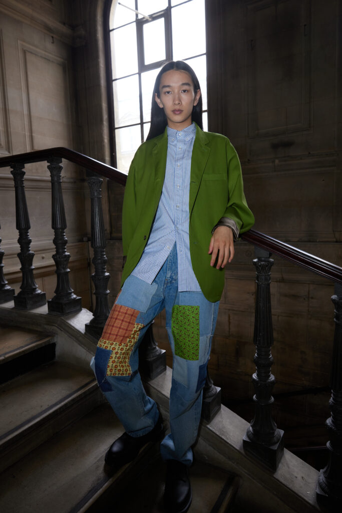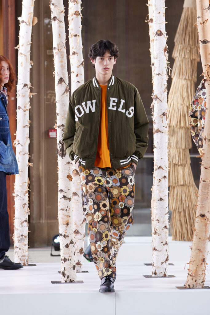 Les accessoires de la collection reflètent l’attention portée aux détails, allant des chapeaux de baseball classiques aux écharpes en soie et sacs utilitaires en toile. Les pantalons varient entre le denim patchwork et les pantalons imprimés avec des motifs floraux récurrents, renforçant la thématique saisonnière.