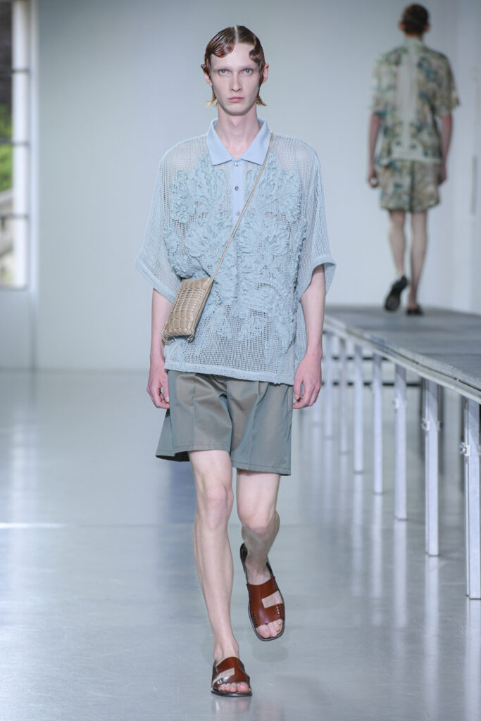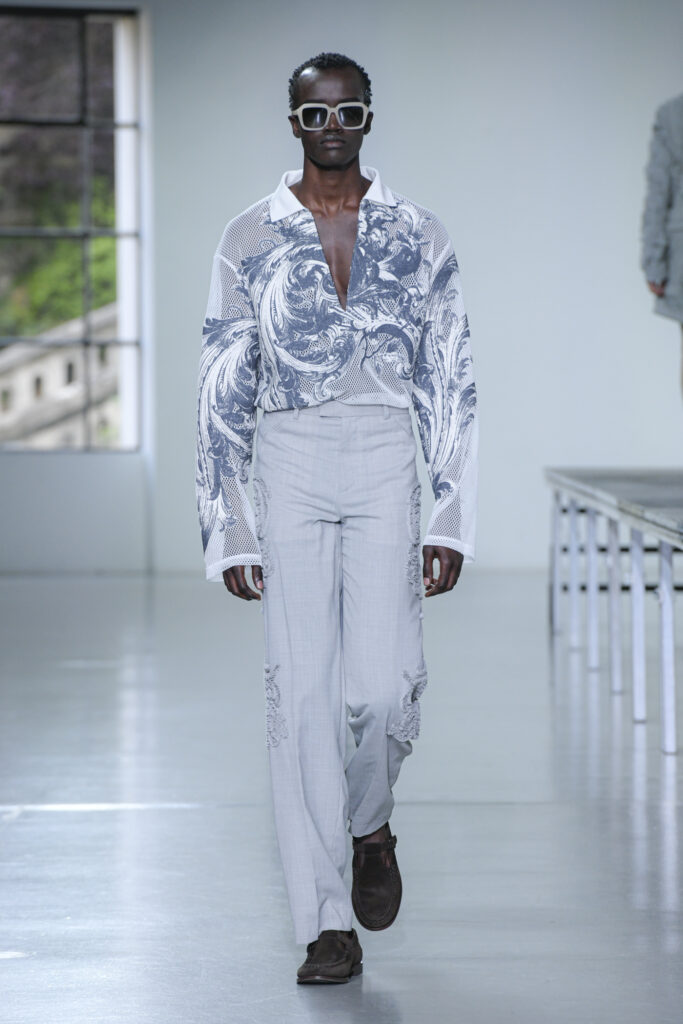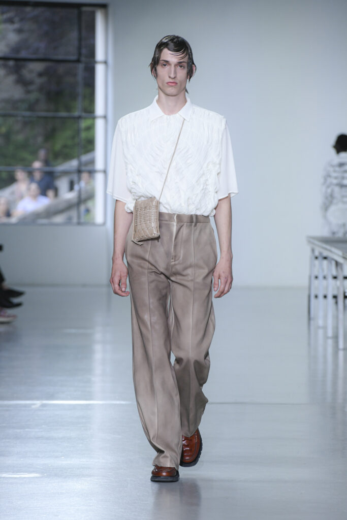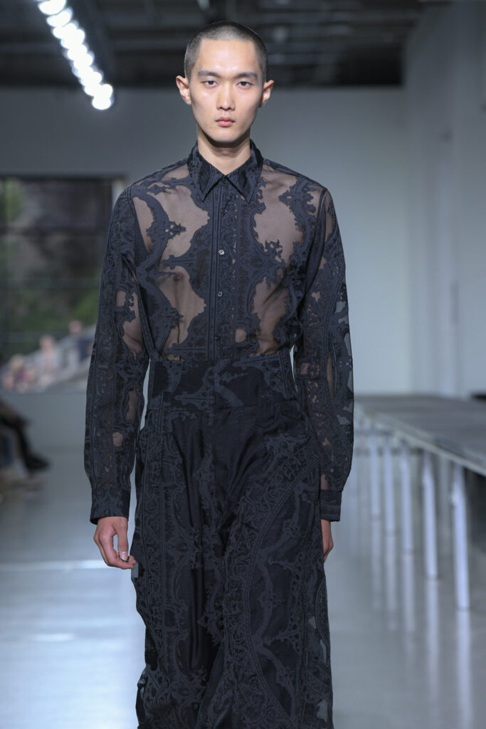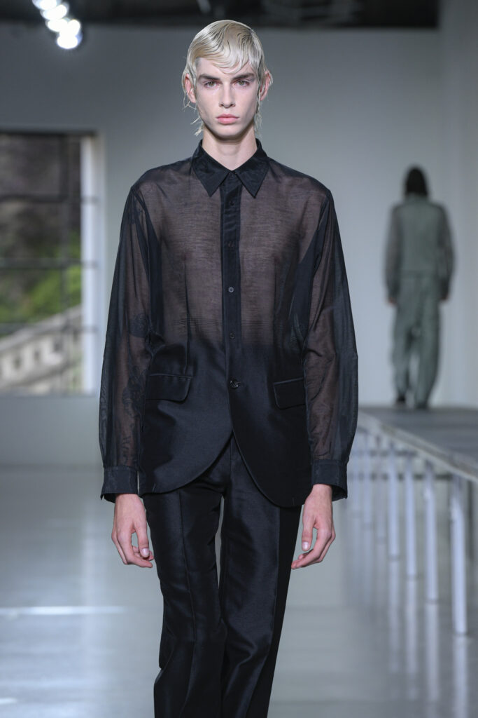Le choix des tissus joue un rôle central dans cette quête. Le « Gradient Woven Fabric » est une des innovations les plus marquantes de cette collection. Ce tissu, qui commence comme un voile de coton translucide pour se transformer progressivement en laine et en lin, crée des pièces hybrides où se mêlent la légèreté d’une chemise et la structure d’une veste. Cette transition entre les matériaux rappelle l’étrangeté surréaliste d’un tableau de Magritte, où l’ordinaire se mue en une expression artistique inattendue.
