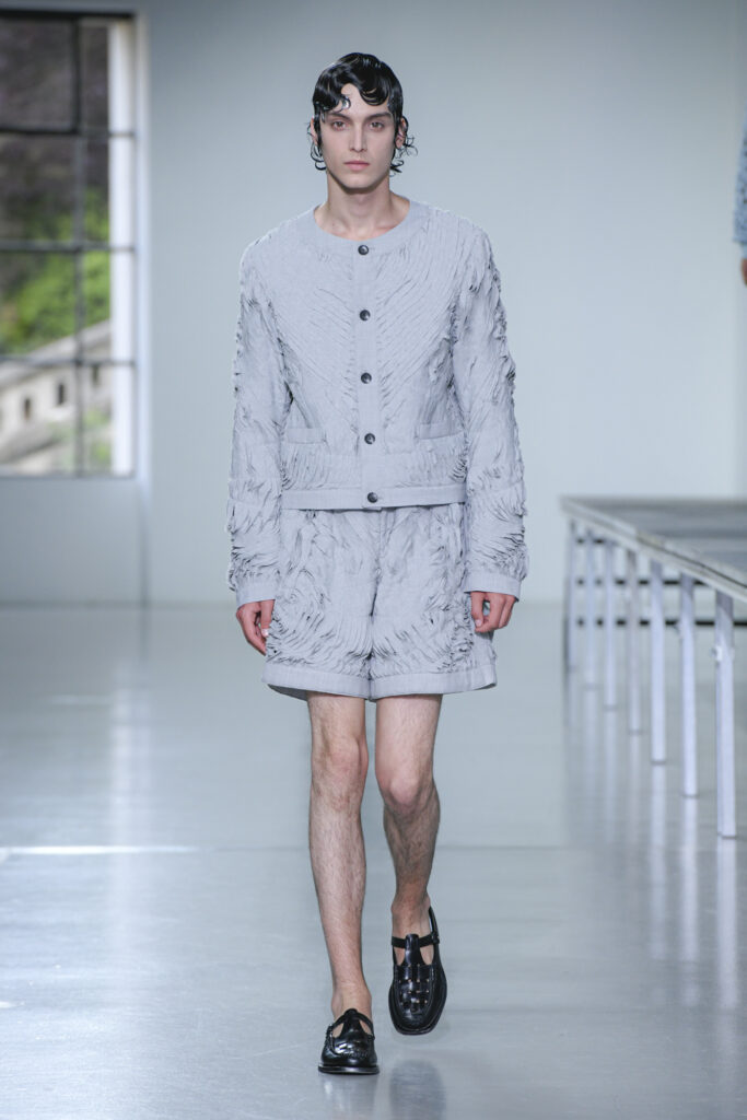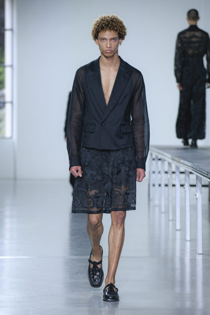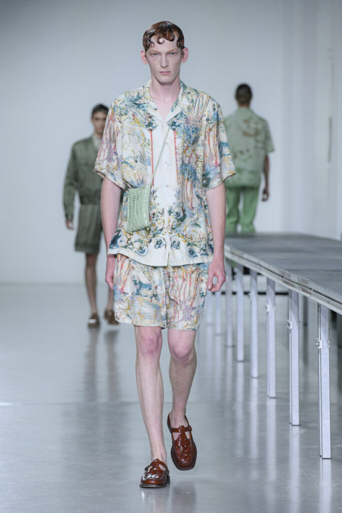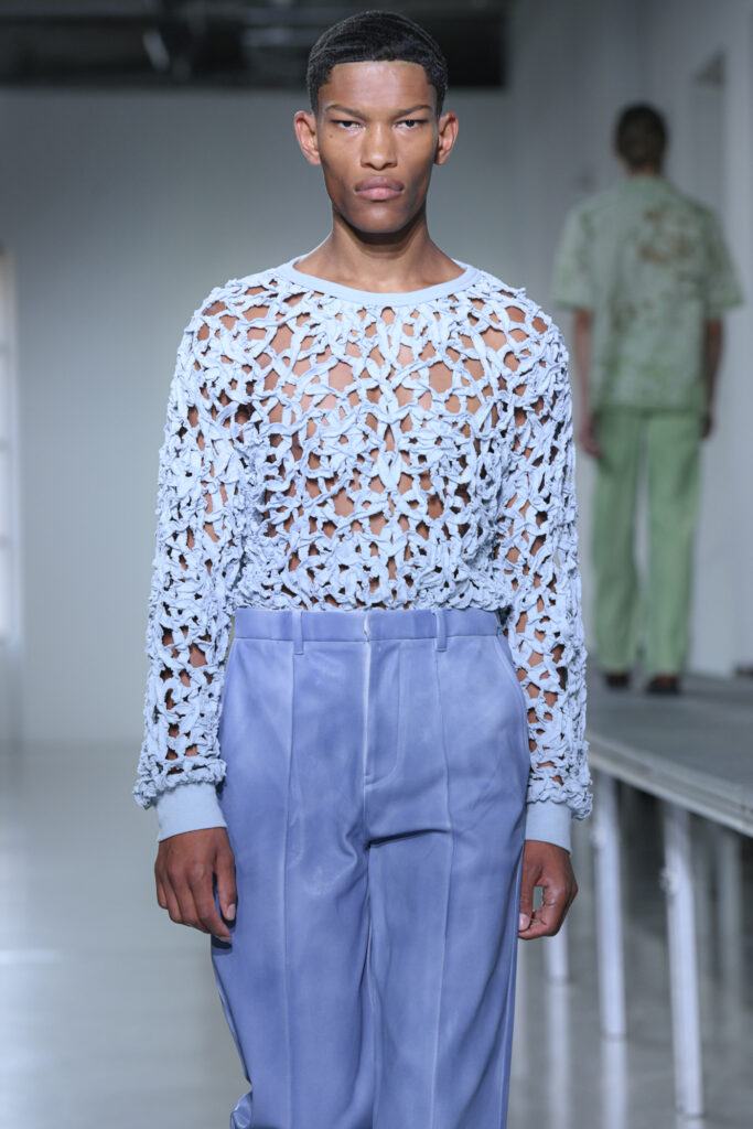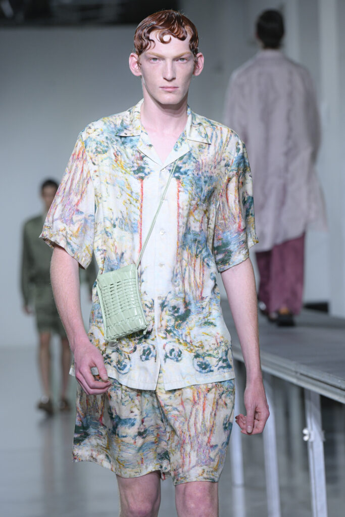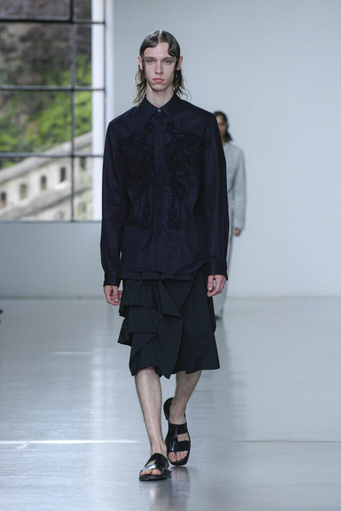 Le choix des tissus joue un rôle central dans cette quête. Le « Gradient Woven Fabric » est une des innovations les plus marquantes de cette collection. Ce tissu, qui commence comme un voile de coton translucide pour se transformer progressivement en laine et en lin, crée des pièces hybrides où se mêlent la légèreté d’une chemise et la structure d’une veste. Cette transition entre les matériaux rappelle l’étrangeté surréaliste d’un tableau de Magritte, où l’ordinaire se mue en une expression artistique inattendue.