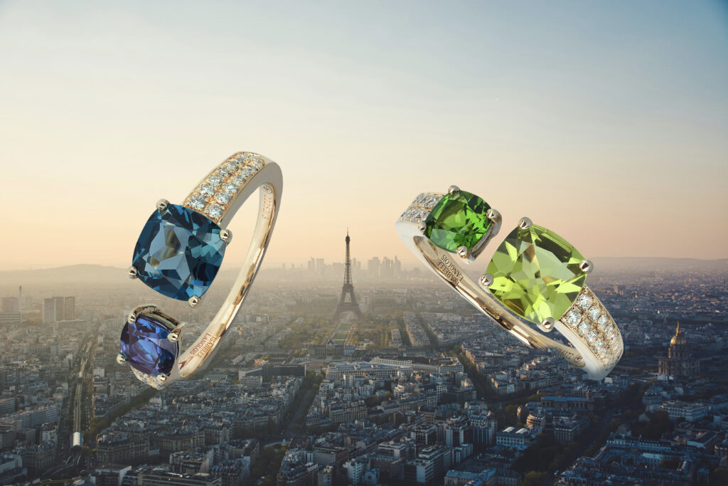 La bague Pavé de Paris trouve son inspiration dans les pavés historiques de la capitale française. Ces pavés, témoins silencieux des révolutions et des histoires d’amour, sont réinterprétés dans cette pièce de haute joaillerie. Façonnée en or rose scintillant de diamants, la bague juxtapose deux gemmes de forme coussin, évoquant les pavés parisiens. La topaze bleue London et la cordiérite, ou le péridot et le diopside, dialoguent dans une élégance épurée, créant un contraste harmonieux et captivant.