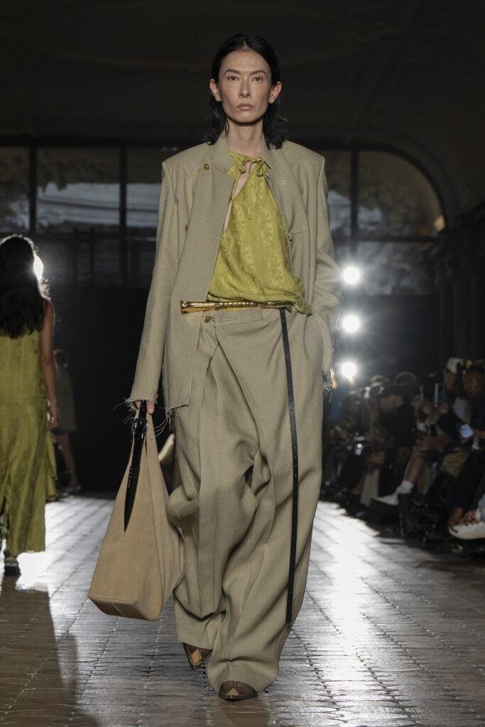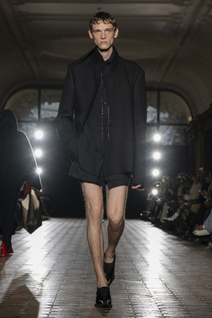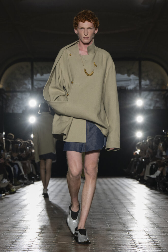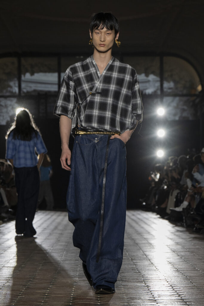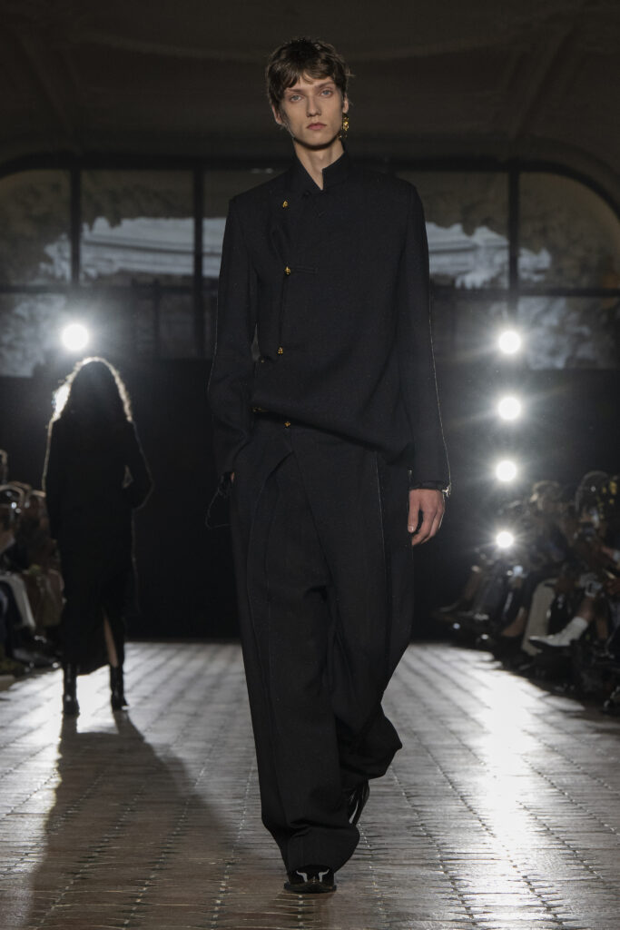 Cette saison, SANKUANZ réinterprète le tailoring traditionnel en mêlant des formes occidentales à des éléments culturels asiatiques. Les costumes et vestes arborent des cols croisés, des ceintures qui soulignent les hanches, et des manches volumineuses qui redéfinissent les proportions classiques. Les cols allongés descendent le long des manches, rappelant l’élégance des châles asiatiques.