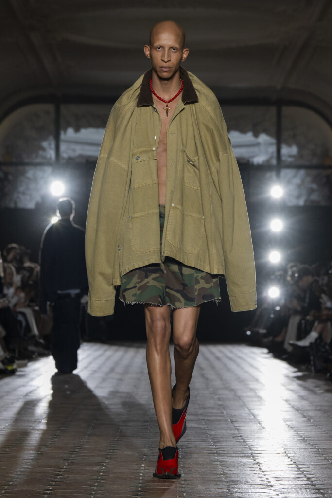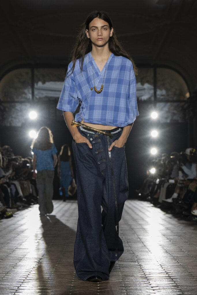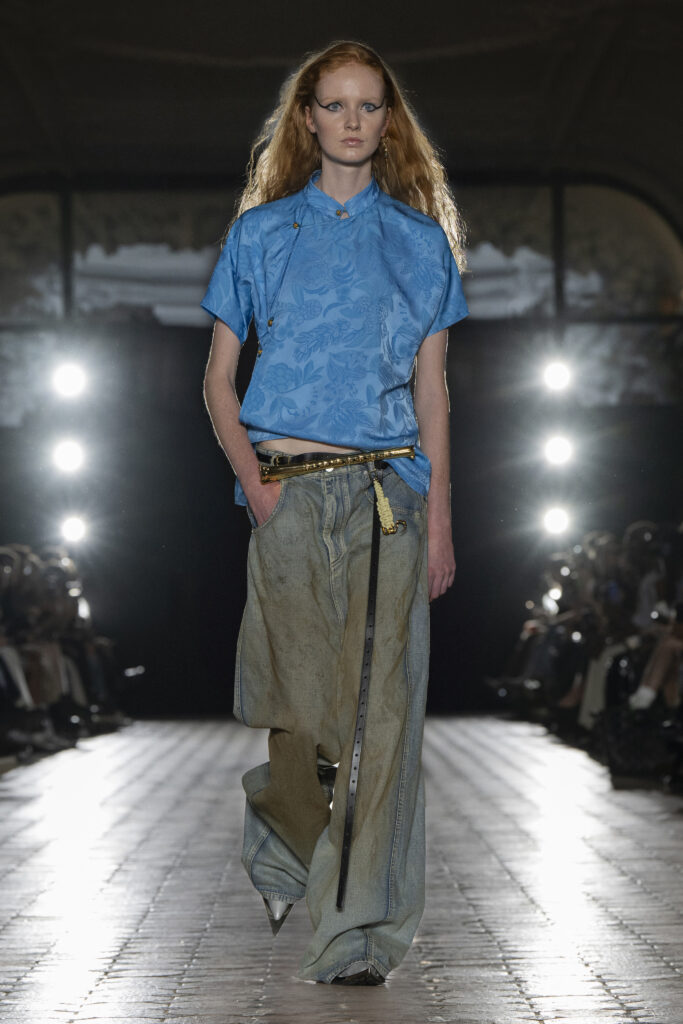 Le denim, élément phare de cette collection, est décliné dans des versions aux ourlets non finis et imité par du nylon brillant. Les tissus plus raffinés comme le jacquard de soie et le taffetas, inspirés des brocarts chinois, apportent une dimension luxueuse. SANKUANZ juxtapose ces matériaux asiatiques avec des imprimés occidentaux tels que des carreaux et l’emblématique camouflage signature de la marque.