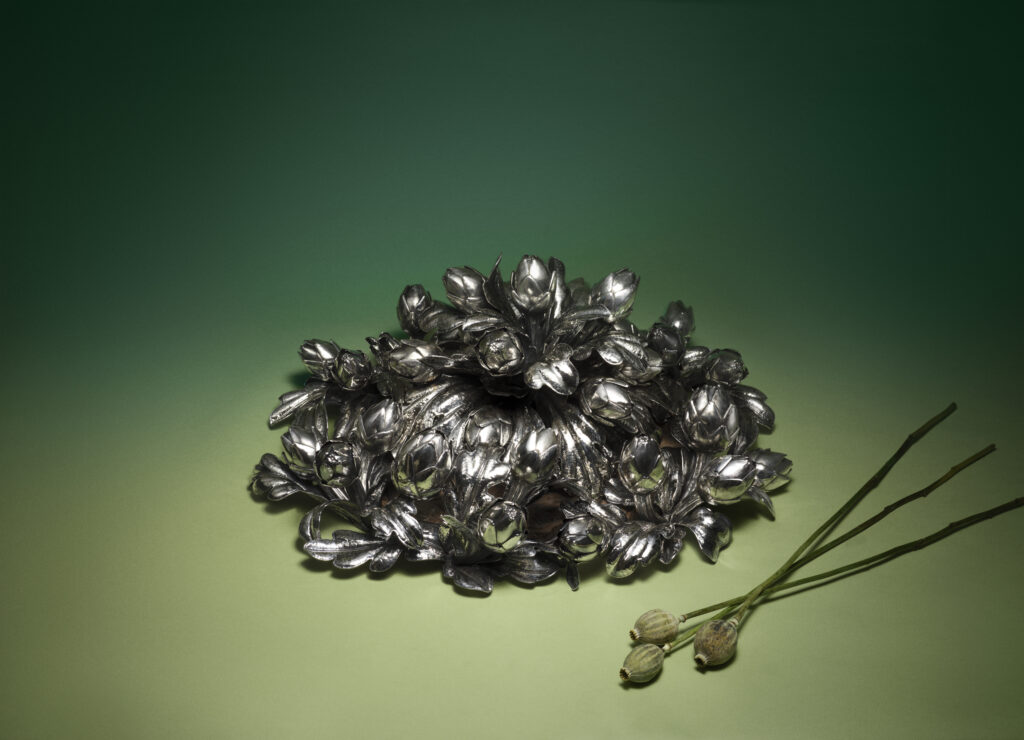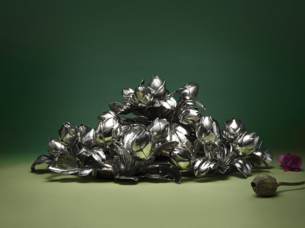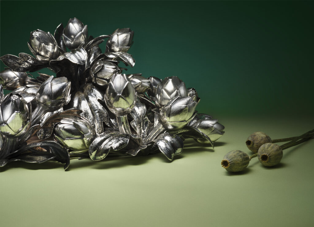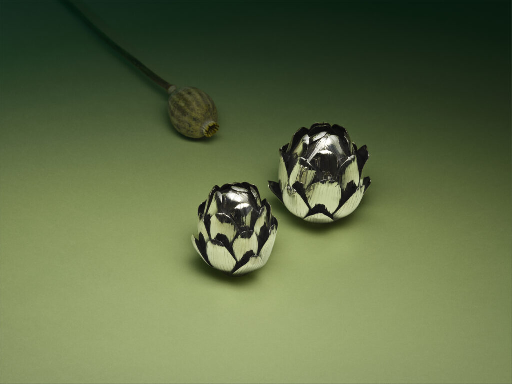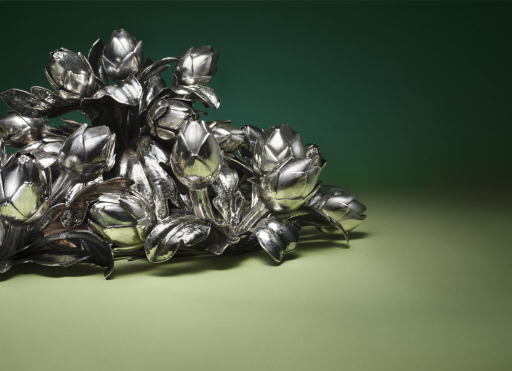 L’une des pièces maîtresses présentées par Buccellati dans la salle du Cenacolo Palladiano est Armatae Flores, un centre de table majestueux représentant une couronne d’artichauts en argent, symbolisant la richesse et la complexité de la nature. Inspirée de la mythologie grecque et des récits autour de l’artichaut, cette pièce célèbre la beauté intemporelle de la nature tout en mettant en avant l’ingéniosité artisanale de la maison. Ce centre de table, pensé pour embellir les grandes occasions, est complété par une série limitée d’artichauts individuels.