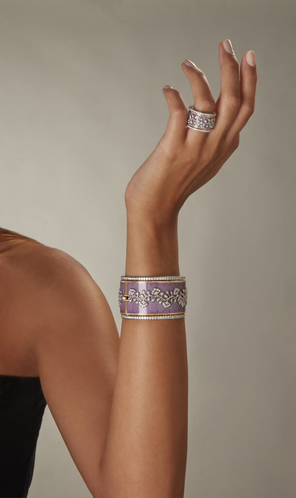 Dans la salle des Arazzi, Buccellati présente Idyllium Floralis, une collection de bijoux dédiée à l’amour éternel. Les bagues Eternelle, dont la forme circulaire parfaite symbolise l’infini, sont ornées de motifs floraux et de techniques complexes telles que la gravure en tulle. Les visiteurs pourront assister à une démonstration en direct par un maître joaillier, révélant les secrets de fabrication de ces pièces d’exception. Parmi elles, un bracelet serti de diamants, véritable chef-d’œuvre célébrant l’union et l’éternité.