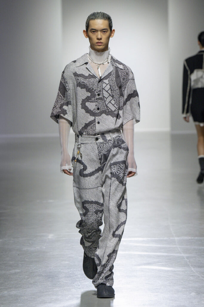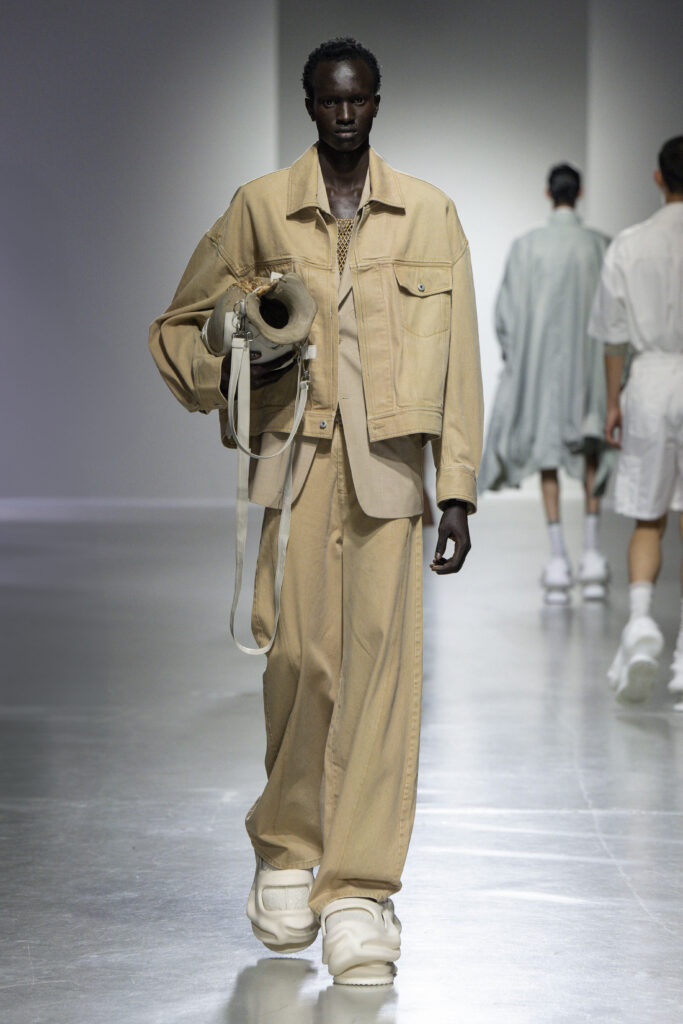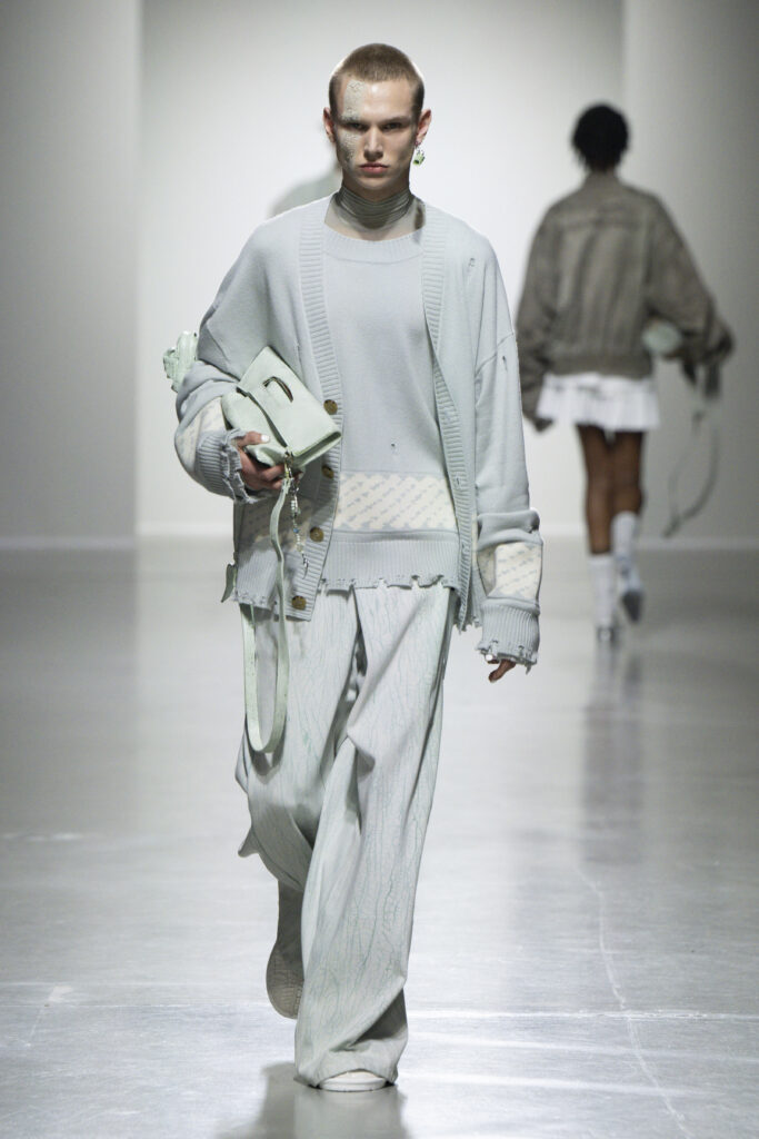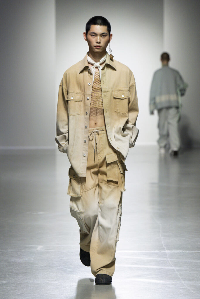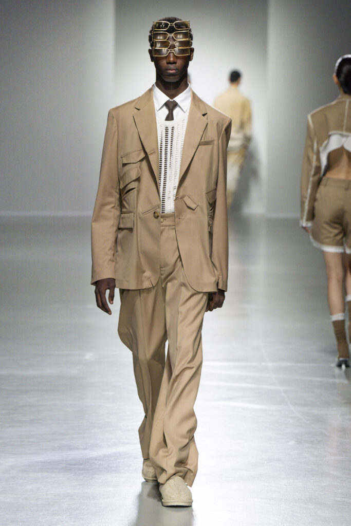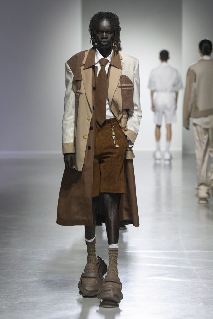 Feng Chen Wang, fascinée par les artefacts anciens et les textures minutieuses qu’ils révèlent, puise son inspiration dans ces objets sculptés par le temps. Sa collection SS25 reprend des éléments visuels tels que les craquelures des céramiques faites à la main, qu’elle incorpore dans les textures de ses tissus, créant des pièces à la fois modernes et empreintes d’une vitalité futuriste.