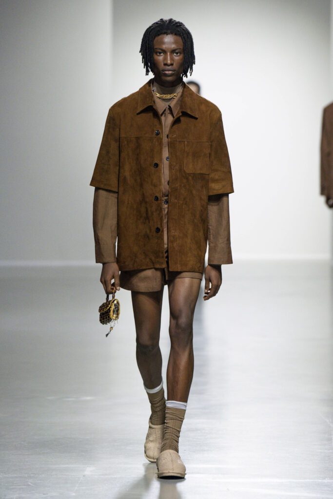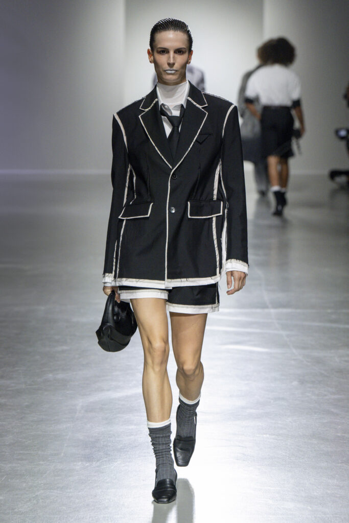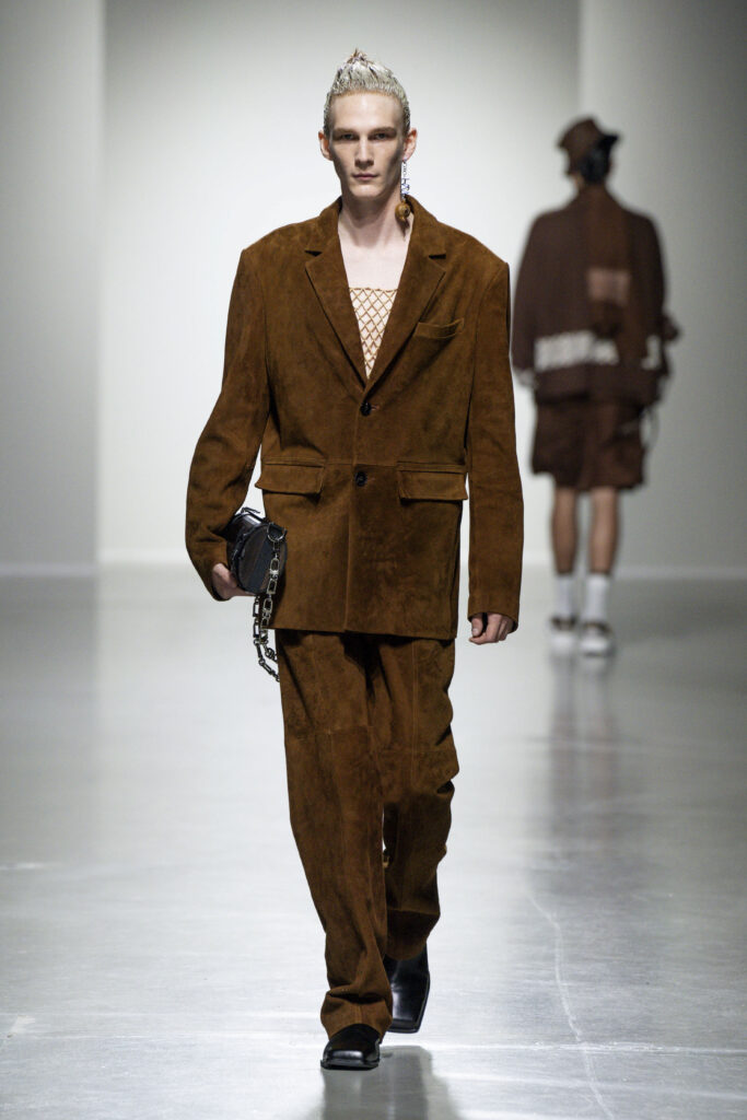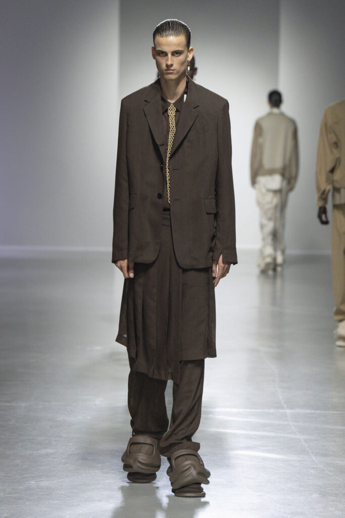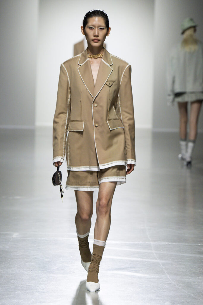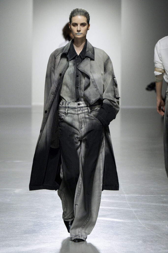 Feng Chen Wang, fascinée par les artefacts anciens et les textures minutieuses qu’ils révèlent, puise son inspiration dans ces objets sculptés par le temps. Sa collection SS25 reprend des éléments visuels tels que les craquelures des céramiques faites à la main, qu’elle incorpore dans les textures de ses tissus, créant des pièces à la fois modernes et empreintes d’une vitalité futuriste.