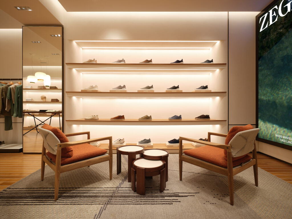 Les meubles de la boutique incarnent le summum de l’artisanat. On y retrouve des tapis de Mariantonia Urru, des sièges raffinés de Minotti, et des tables italiennes fabriquées par Riva 1920. Ces éléments de design ajoutent une touche de sophistication et de confort, faisant de chaque visite une véritable immersion dans l’univers luxueux de ZEGNA.