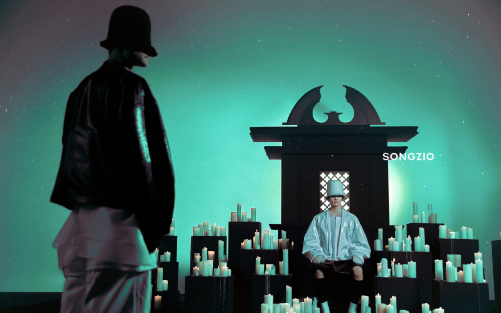 L’identité de Songzio se manifeste à travers un processus créatif unique, où chaque collection commence sur une toile noire. Les œuvres de la saison naissent de coups de pinceau verticaux et horizontaux qui symbolisent l’objet et ses émotions, illustrant la coexistence de l’ordre et du désordre. Cette dualité se retrouve dans chaque aspect de la collection Automne-Hiver 2024. Les silhouettes avant-gardistes, les drapés complexes, et les applications artisanales des œuvres originales de Songzio fusionnent pour créer une esthétique où le modernisme occidental se mêle à une élégance orientale. Les créations sont à la fois massives dans leur immobilité et fluides dans leur mouvement, représentant l’essence de Songzio : un art en tension constante entre des opposés qui s’attirent.