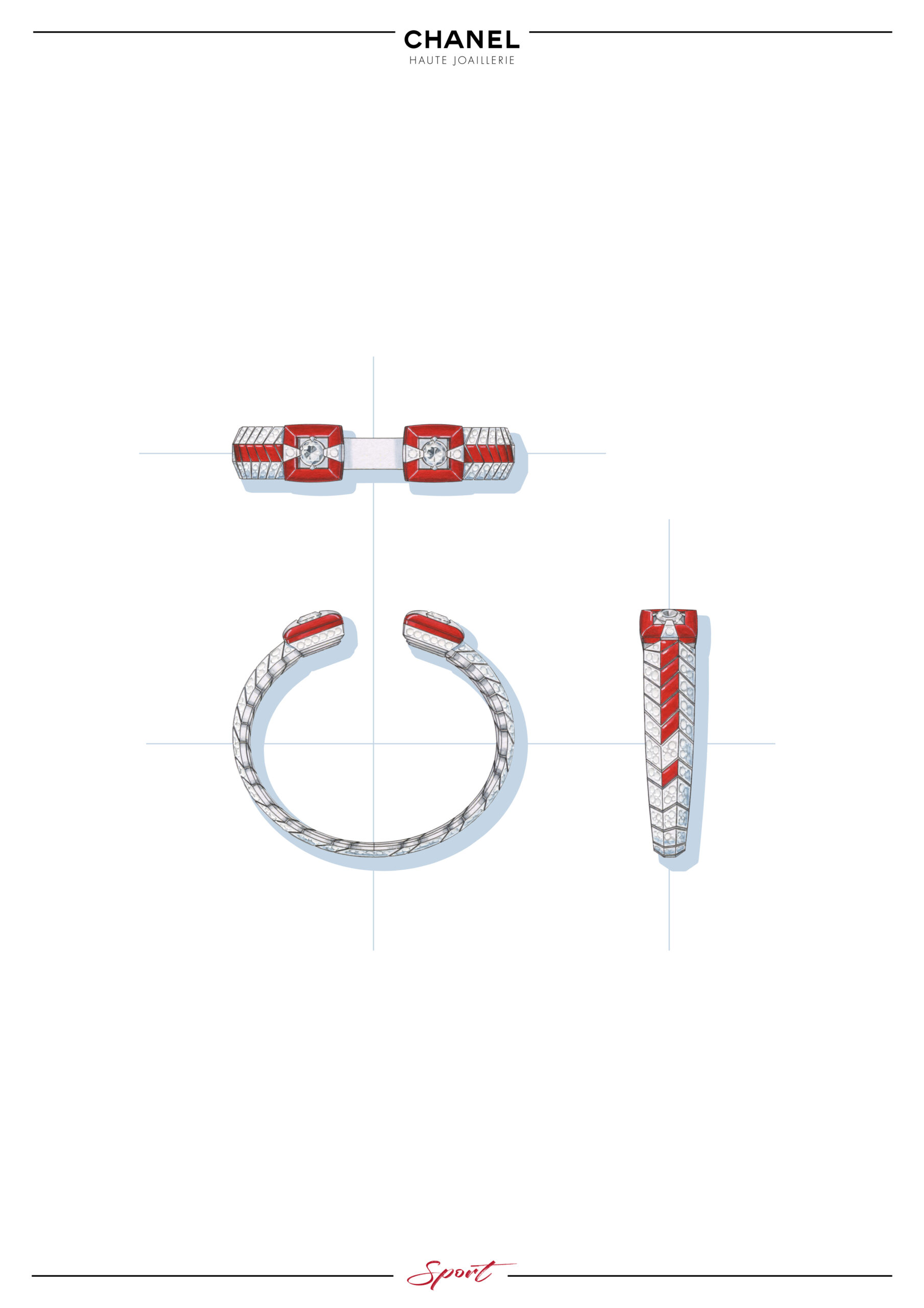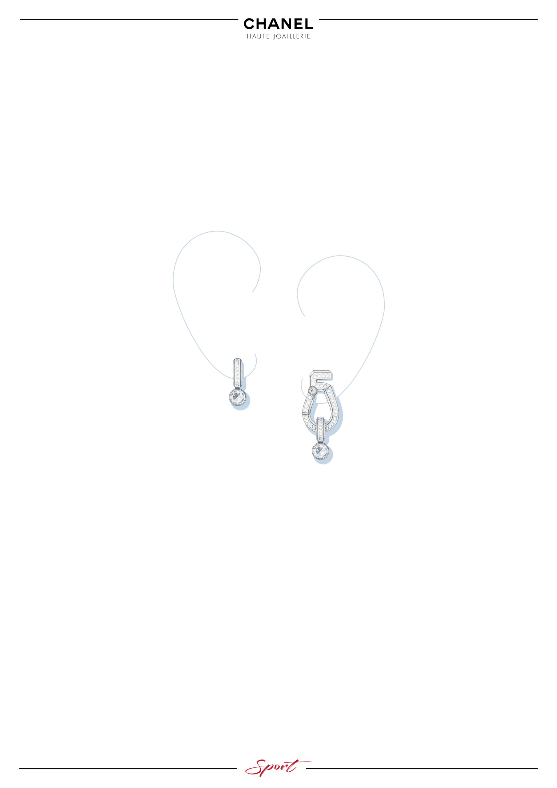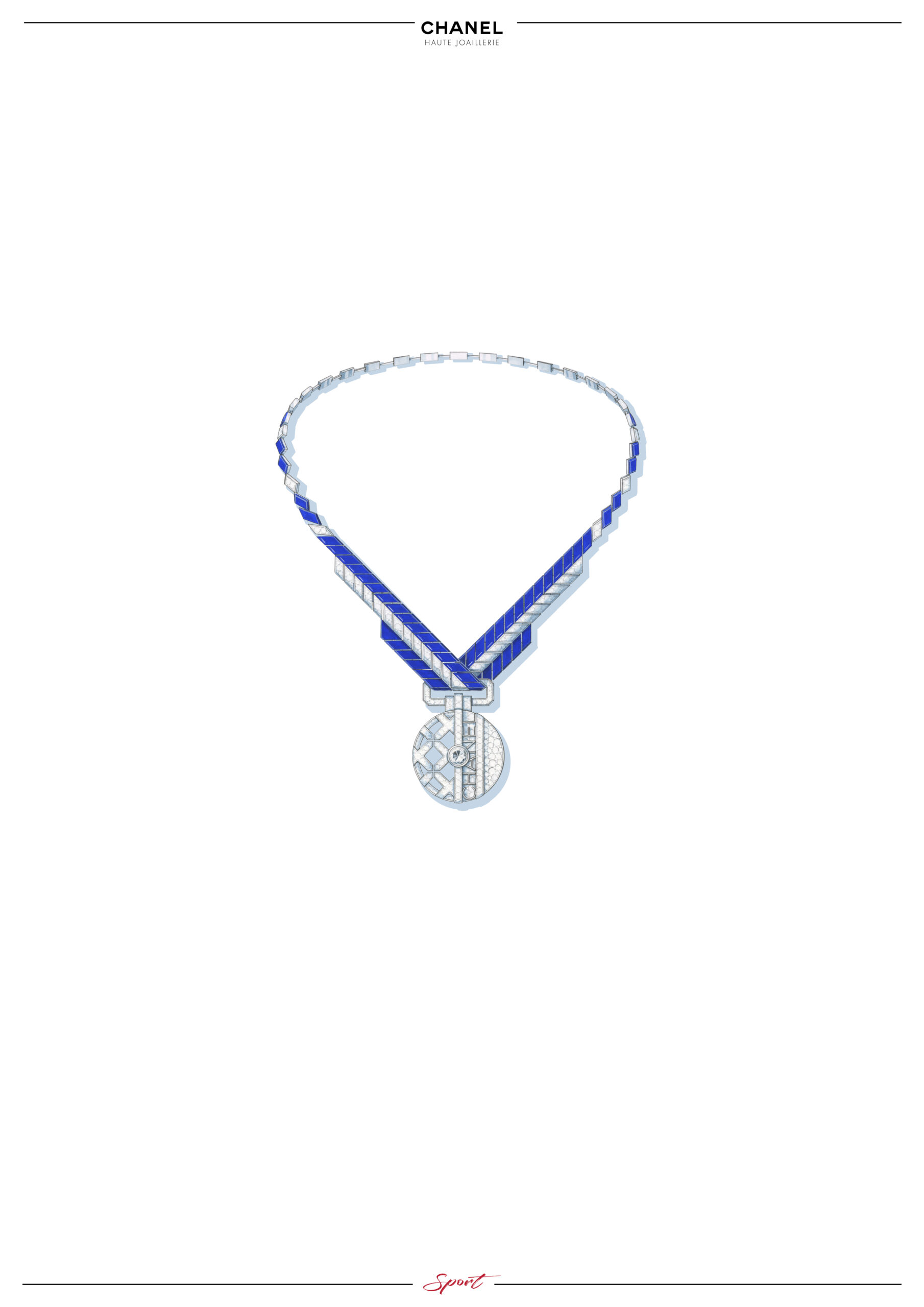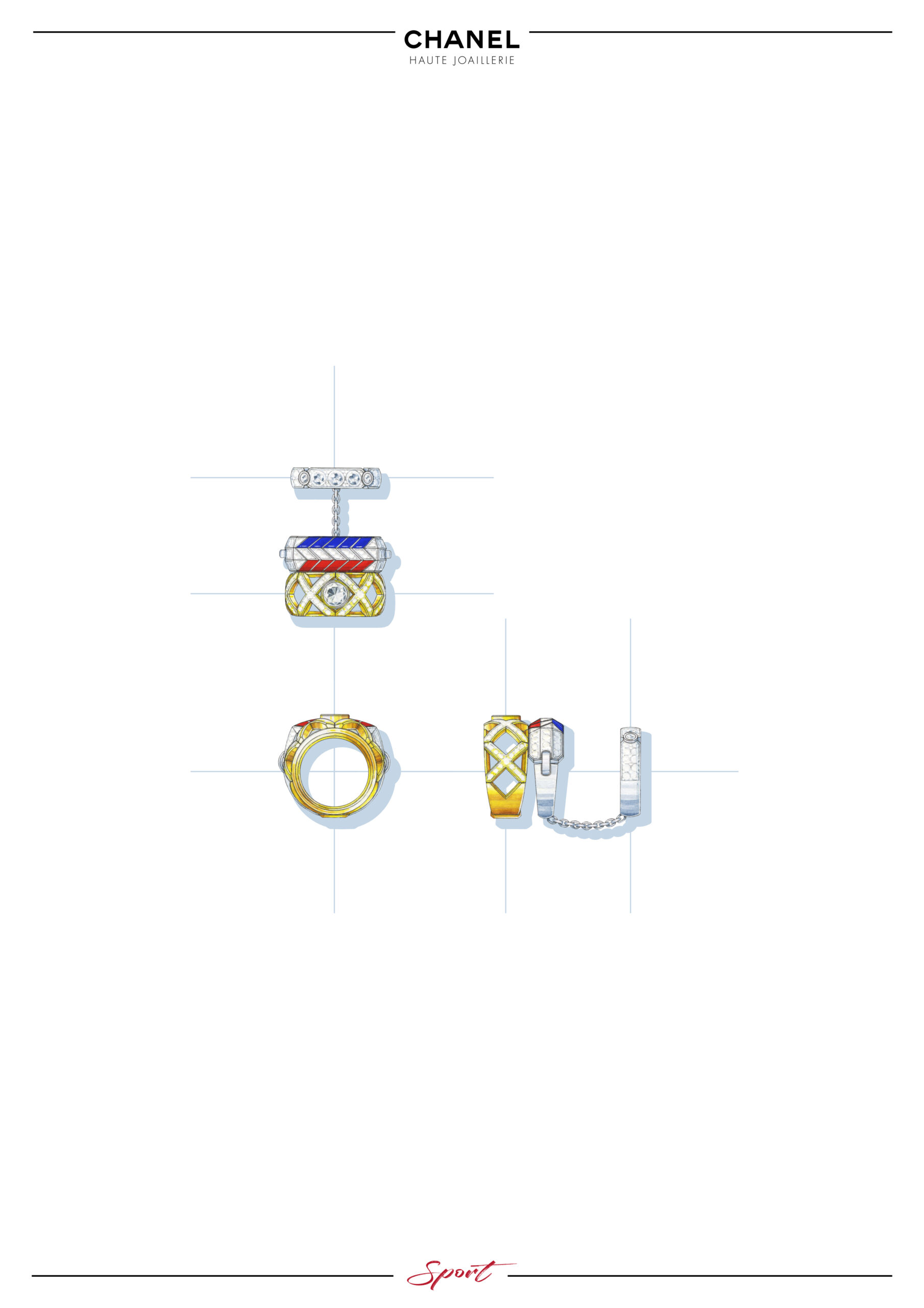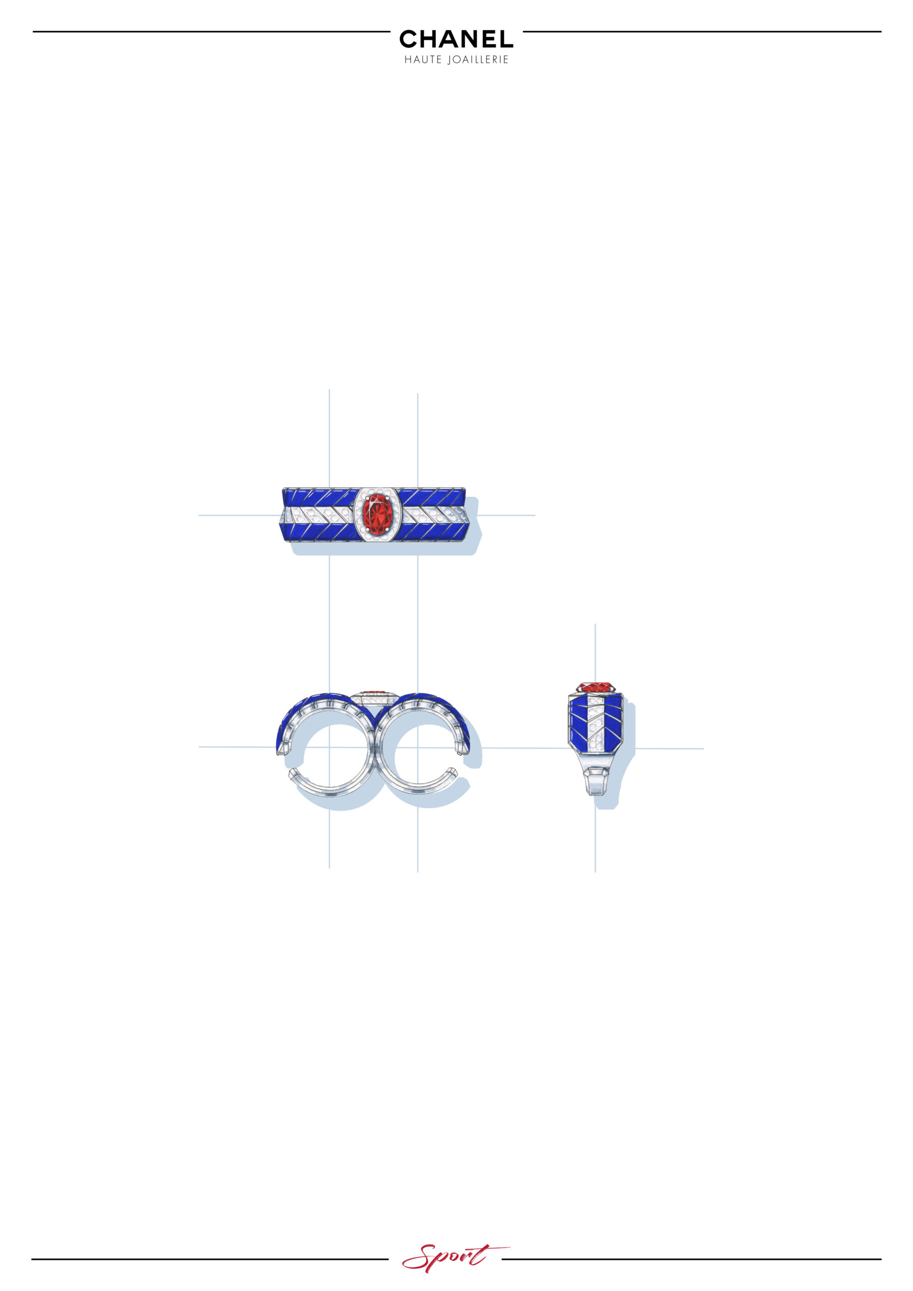 La collection Haute Joaillerie Sport s’inspire des codes de l’univers sportif en intégrant des motifs et des lignes dynamiques. Le chevron, symbole de rythme et de vitesse, est au cœur de cette collection, avec des volumes profilés qui rappellent l’anatomie du corps. Des graphismes et motifs emblématiques de CHANEL, comme le lion ou l’étoile, sont réinterprétés dans une version moderne et sportive. La signature CHANEL s’invite également à travers des imprimés ajourés pour la première fois dans la haute joaillerie.
