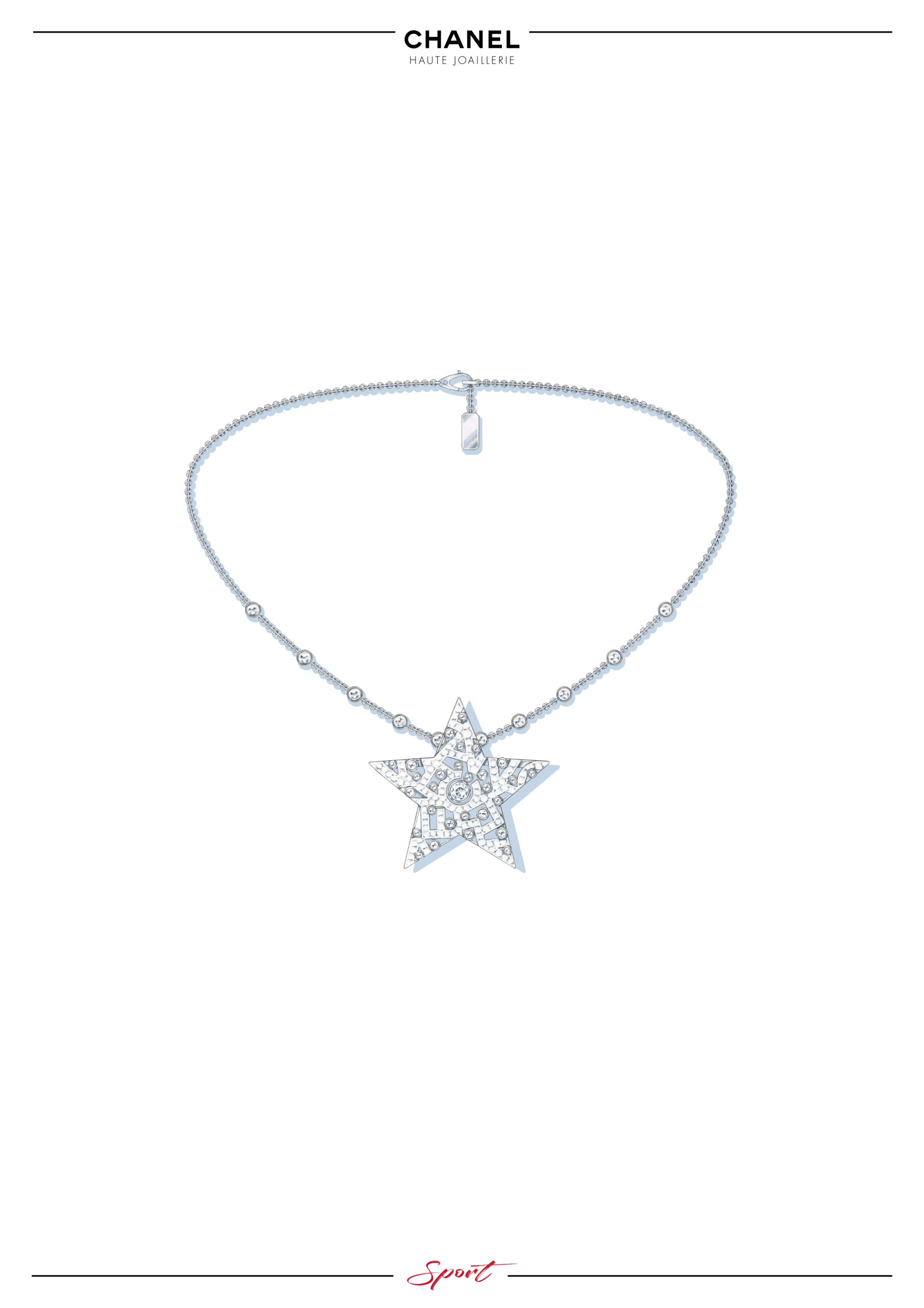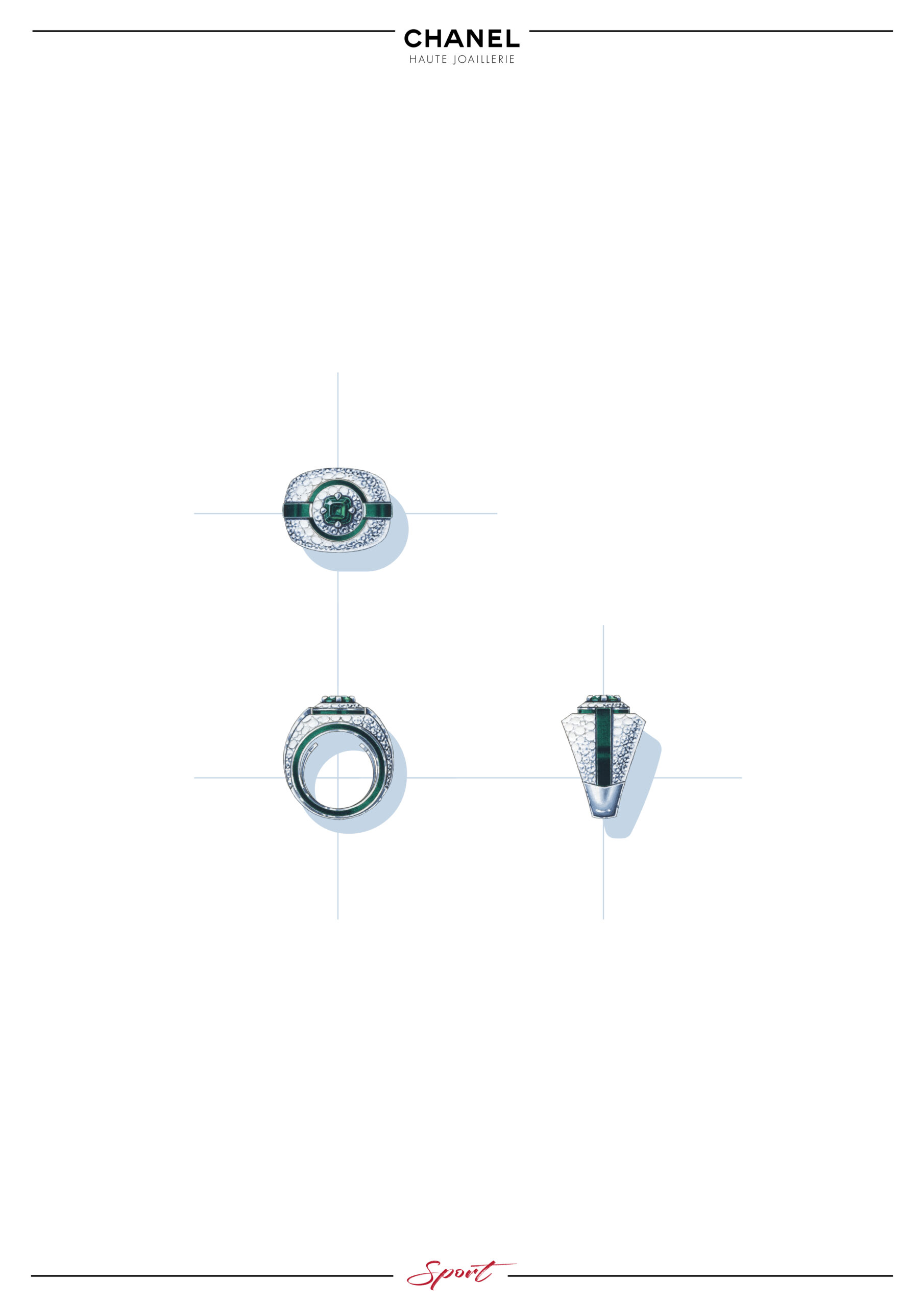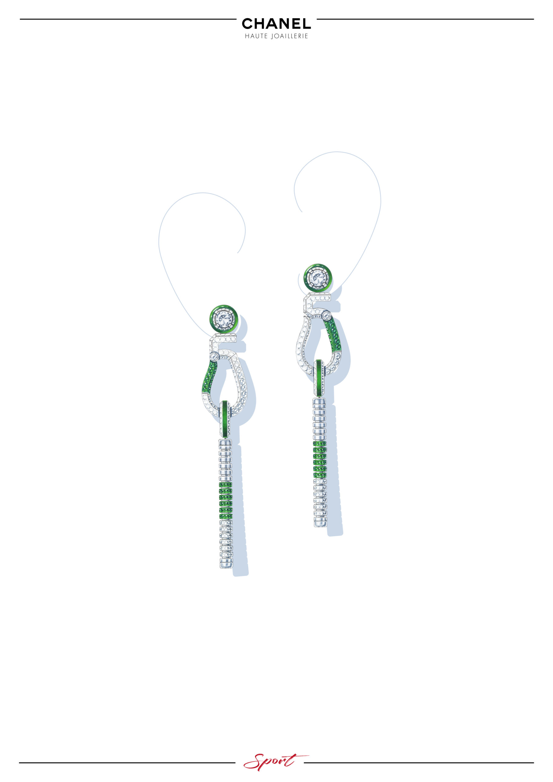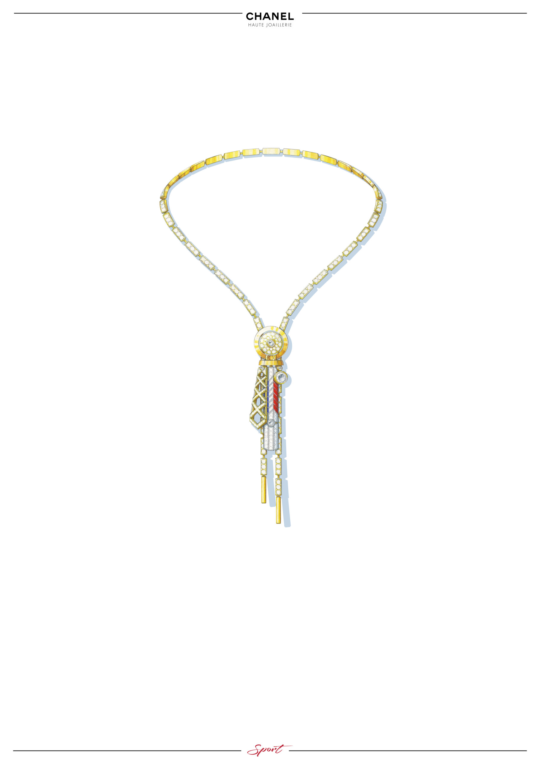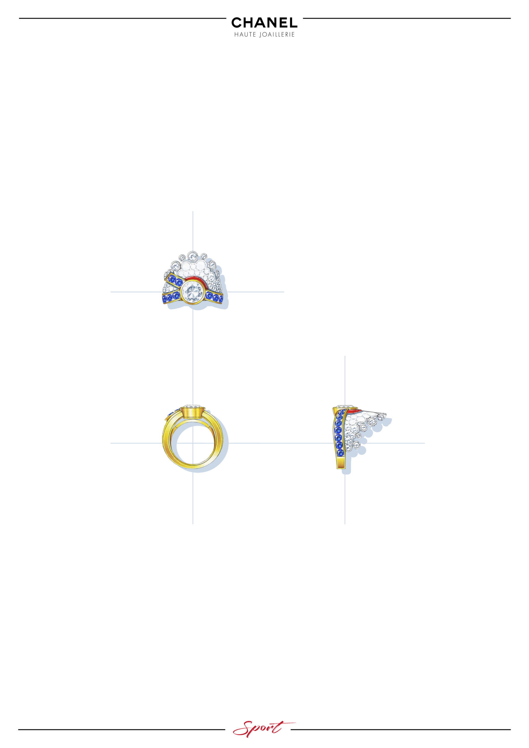 La collection Haute Joaillerie Sport s’inspire des codes de l’univers sportif en intégrant des motifs et des lignes dynamiques. Le chevron, symbole de rythme et de vitesse, est au cœur de cette collection, avec des volumes profilés qui rappellent l’anatomie du corps. Des graphismes et motifs emblématiques de CHANEL, comme le lion ou l’étoile, sont réinterprétés dans une version moderne et sportive. La signature CHANEL s’invite également à travers des imprimés ajourés pour la première fois dans la haute joaillerie.