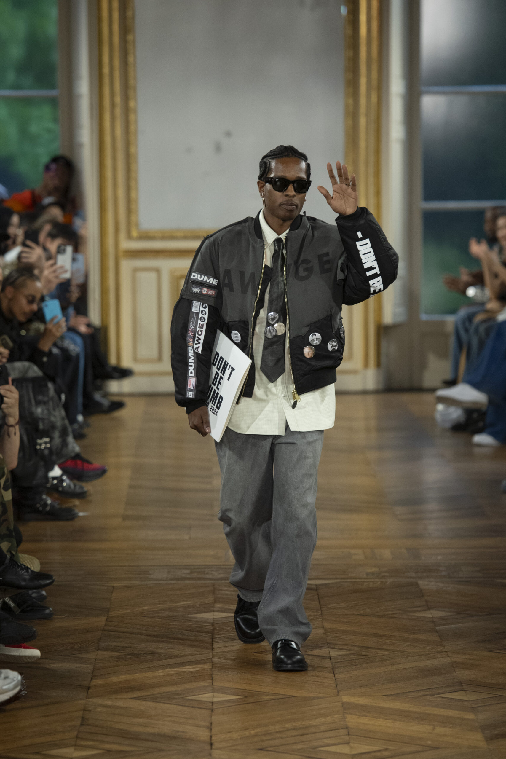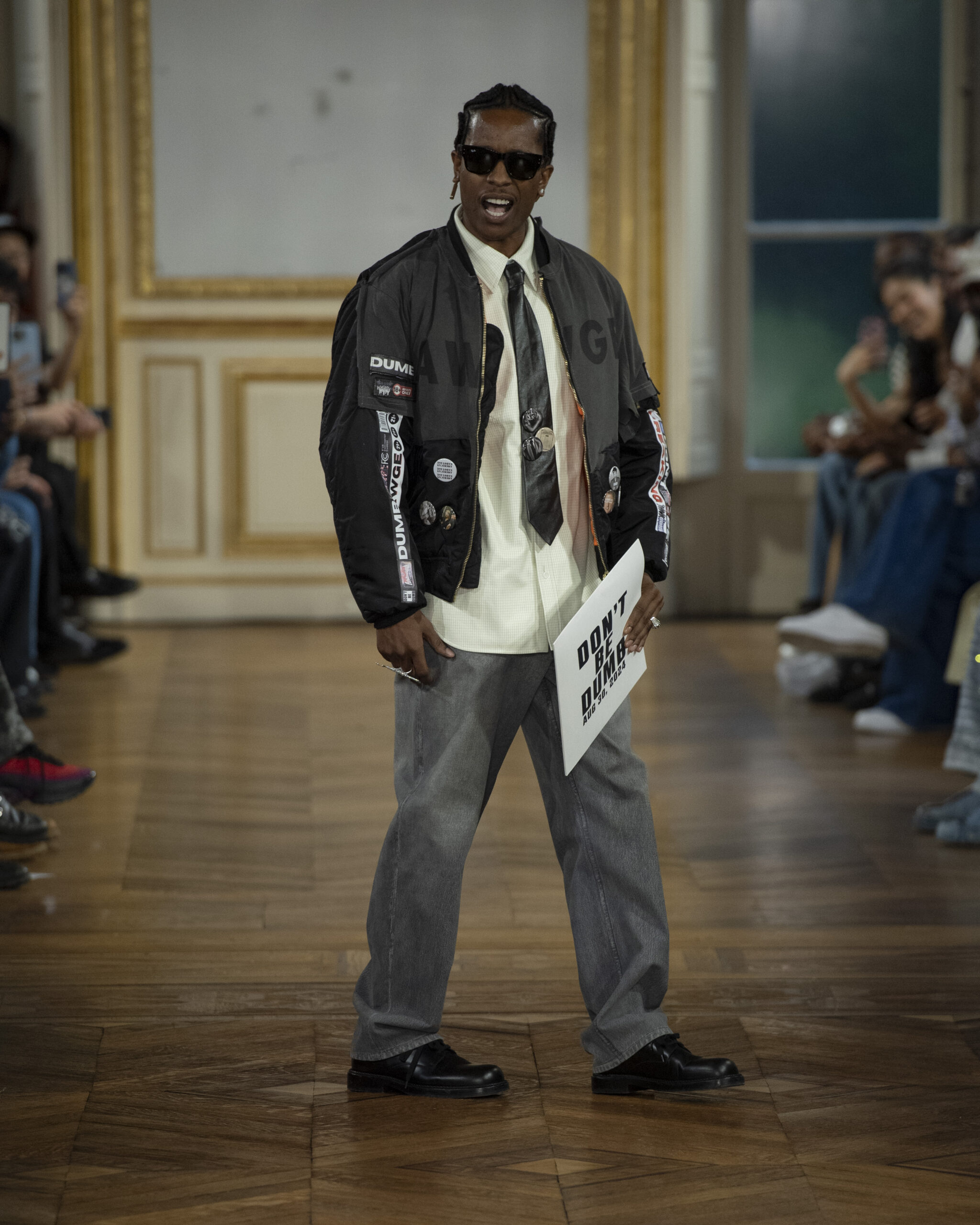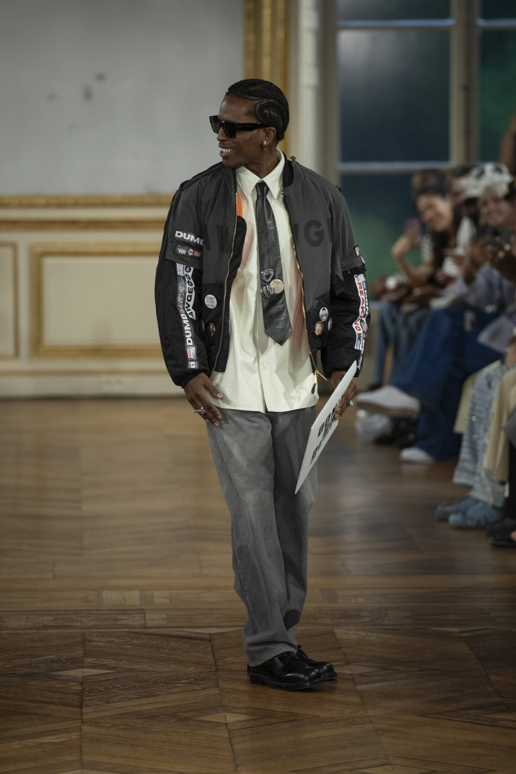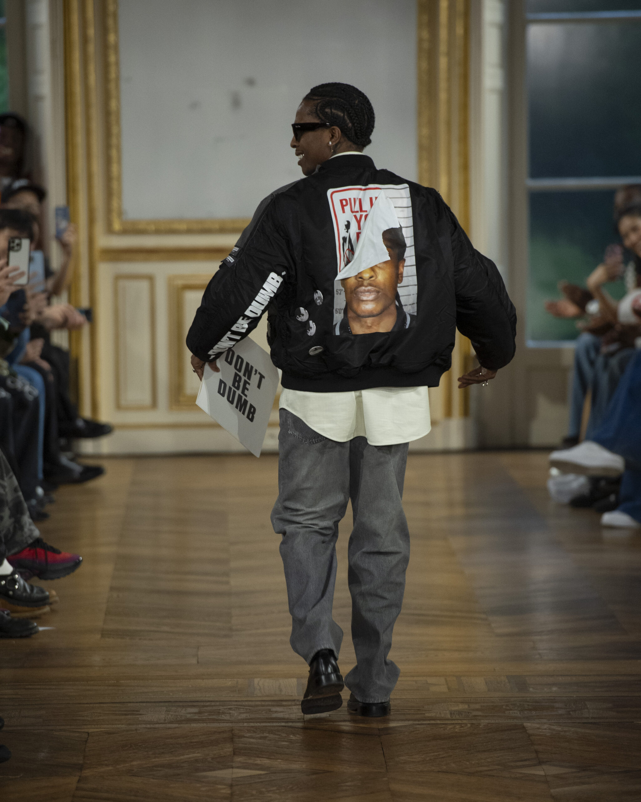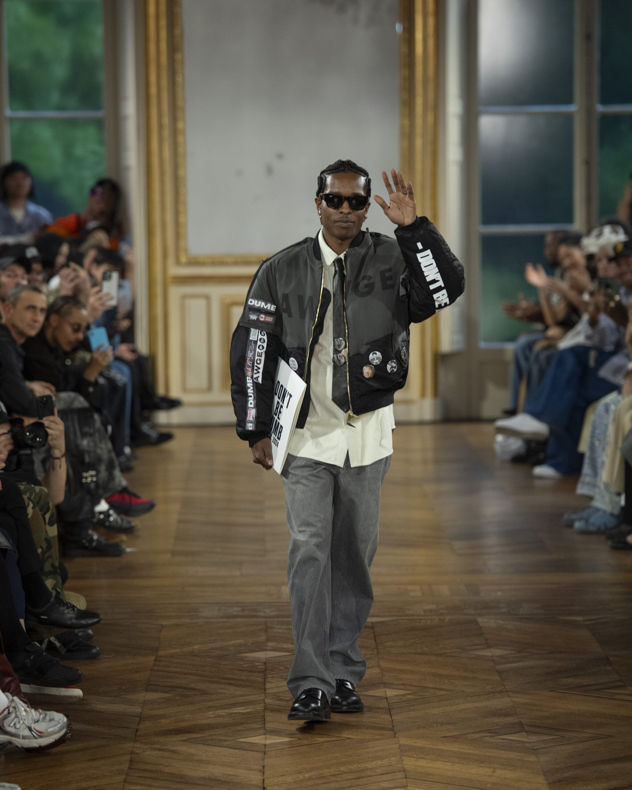 Le décor du défilé, comprenant des sacs poubelles transformés en chaises beanbag issues de la marque de mobilier Hommemade, en collaboration avec Crosby Studios, ajoutait une dimension immersive à cette expérience unique. Le défilé a été rythmé par la bande-son du prochain album d’A$AP Rocky, créant une synergie entre mode et musique.