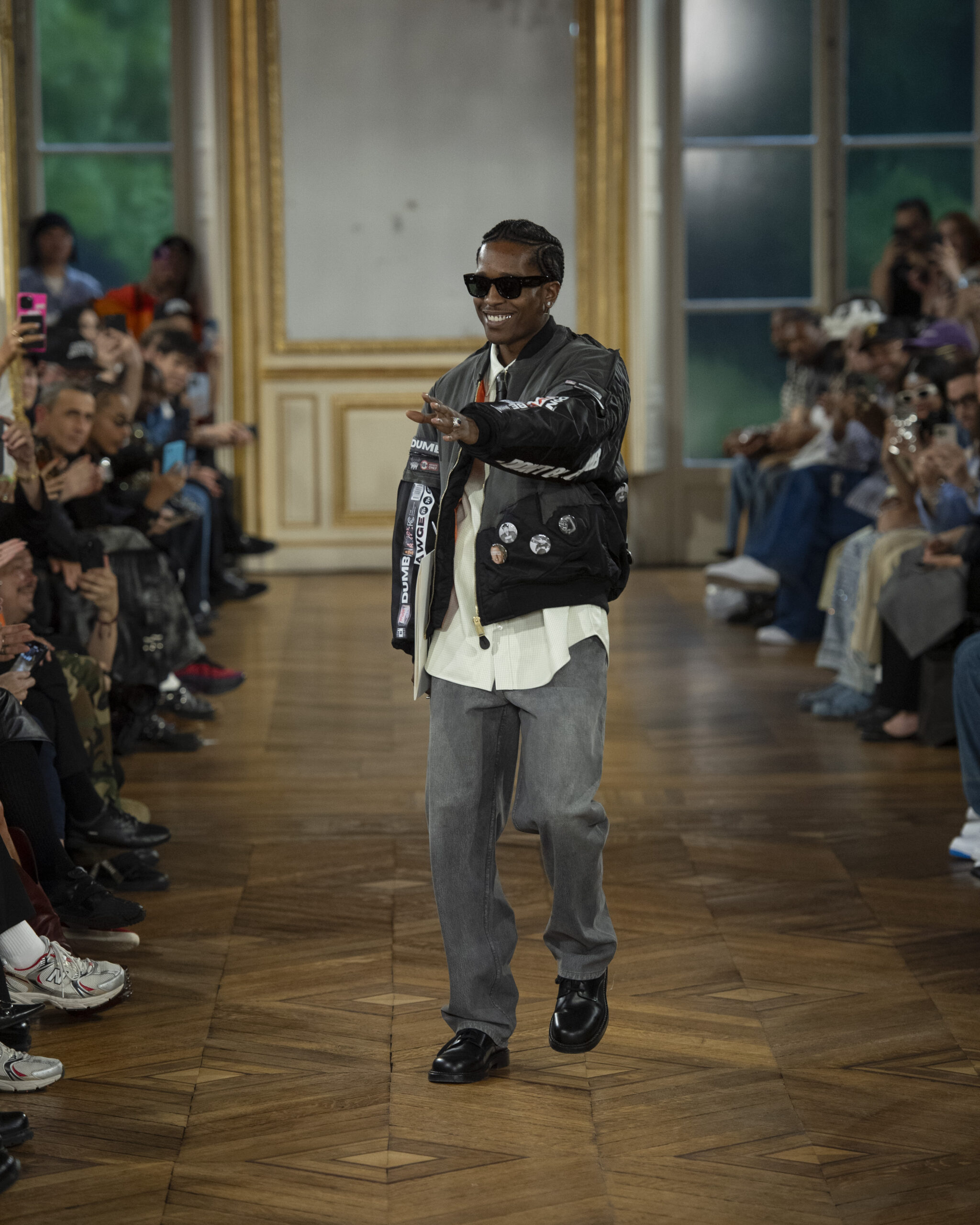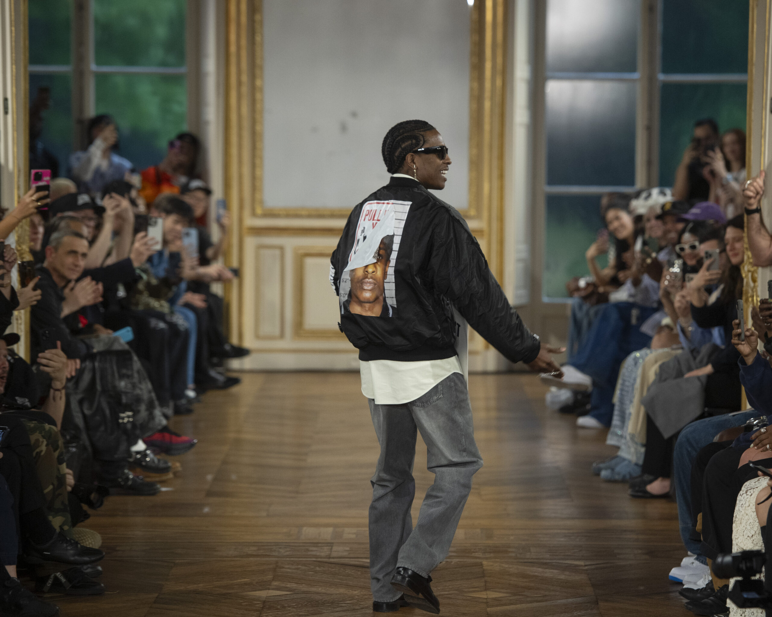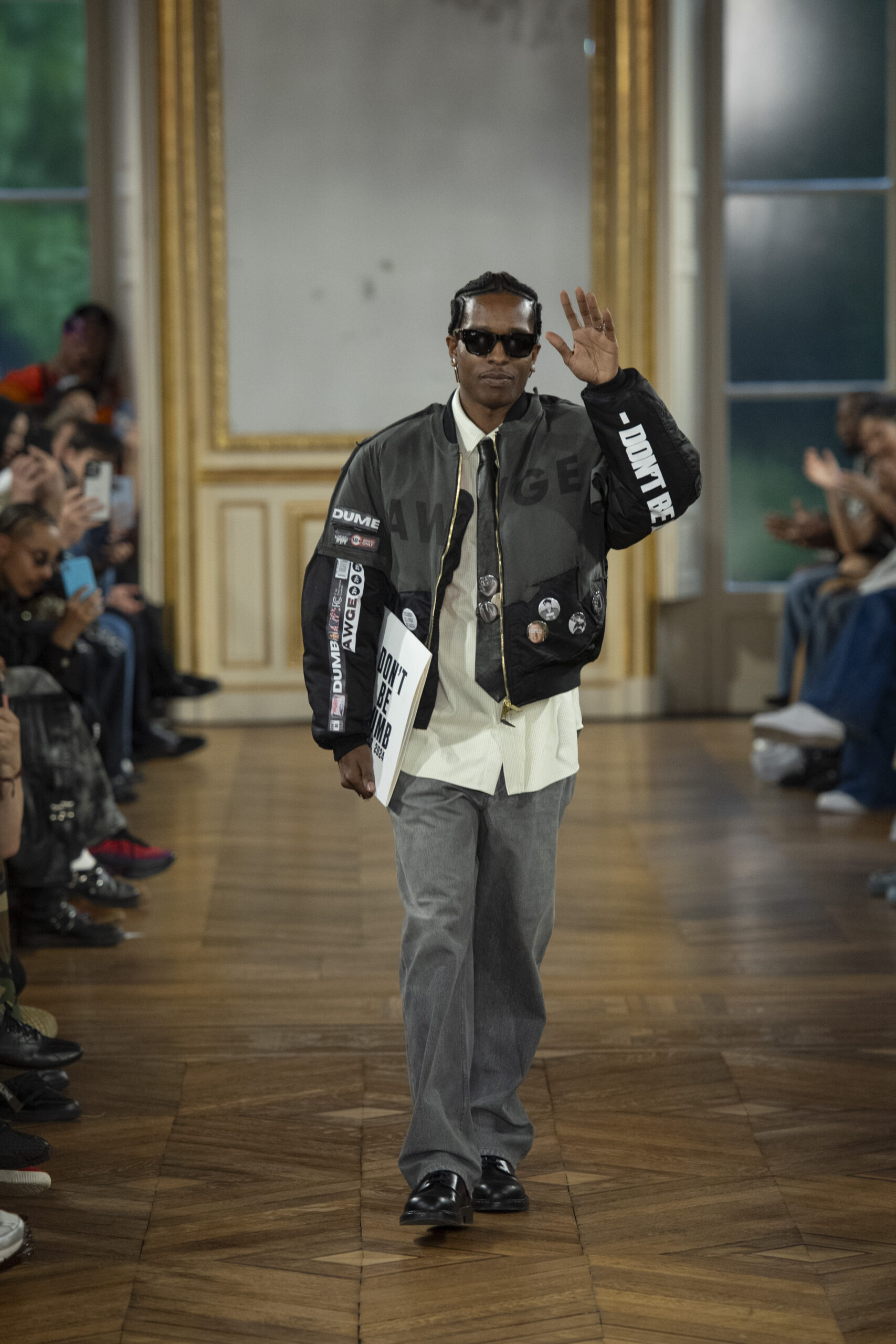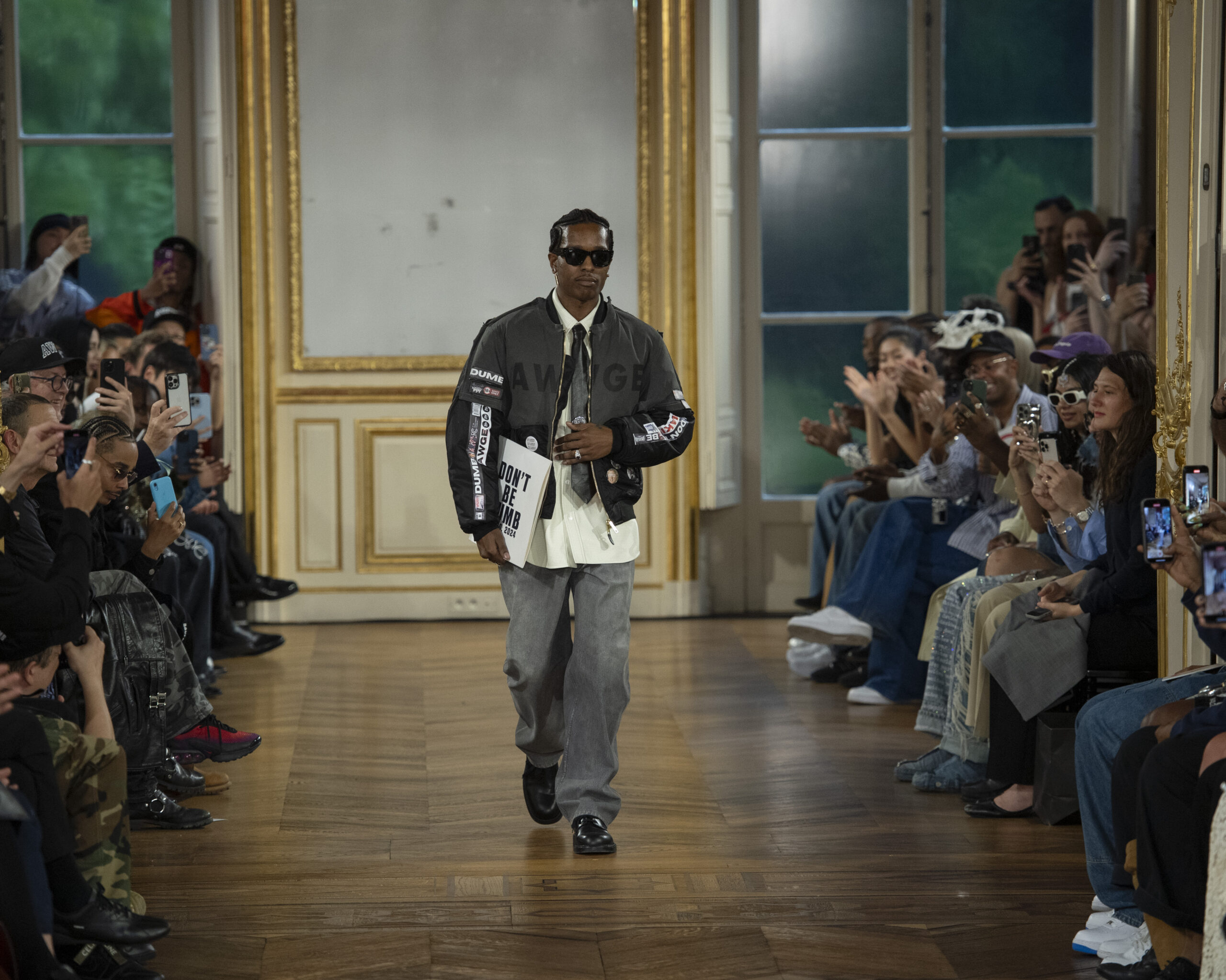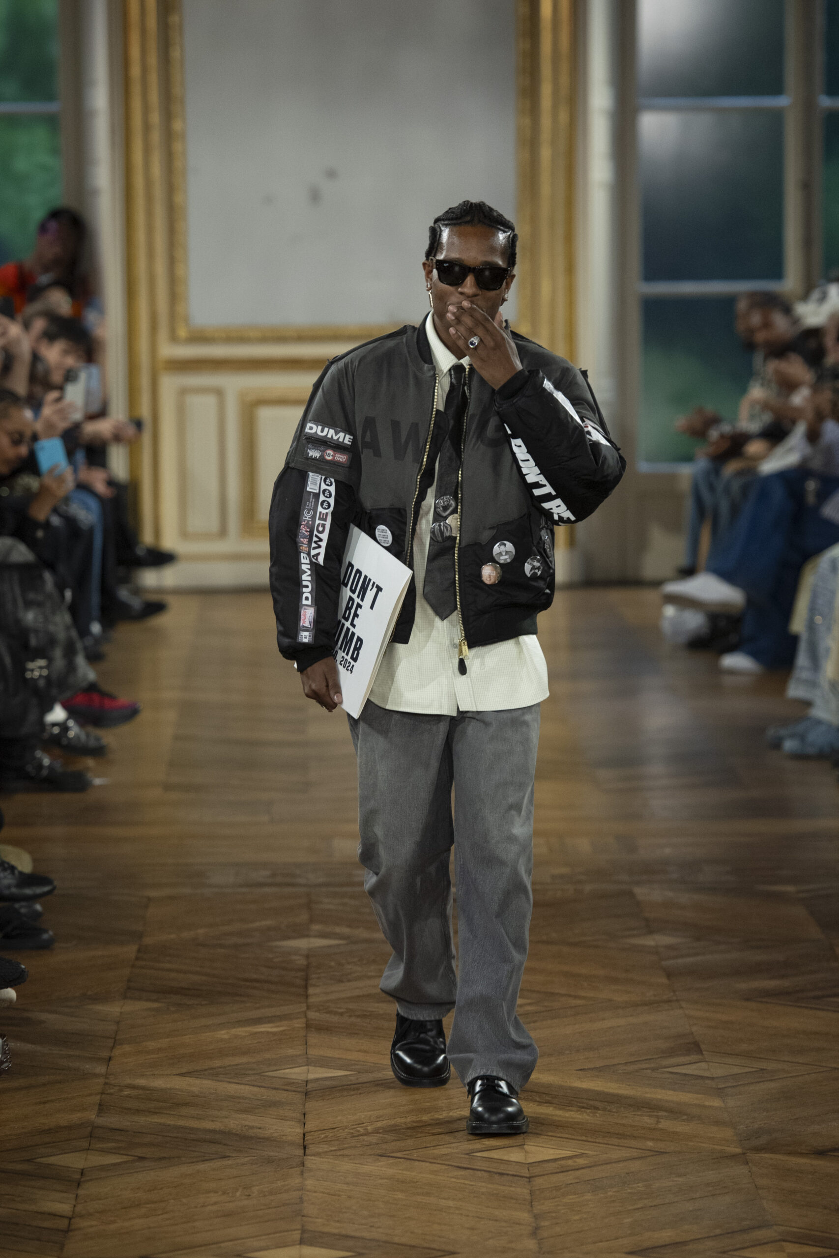 Le décor du défilé, comprenant des sacs poubelles transformés en chaises beanbag issues de la marque de mobilier Hommemade, en collaboration avec Crosby Studios, ajoutait une dimension immersive à cette expérience unique. Le défilé a été rythmé par la bande-son du prochain album d’A$AP Rocky, créant une synergie entre mode et musique.